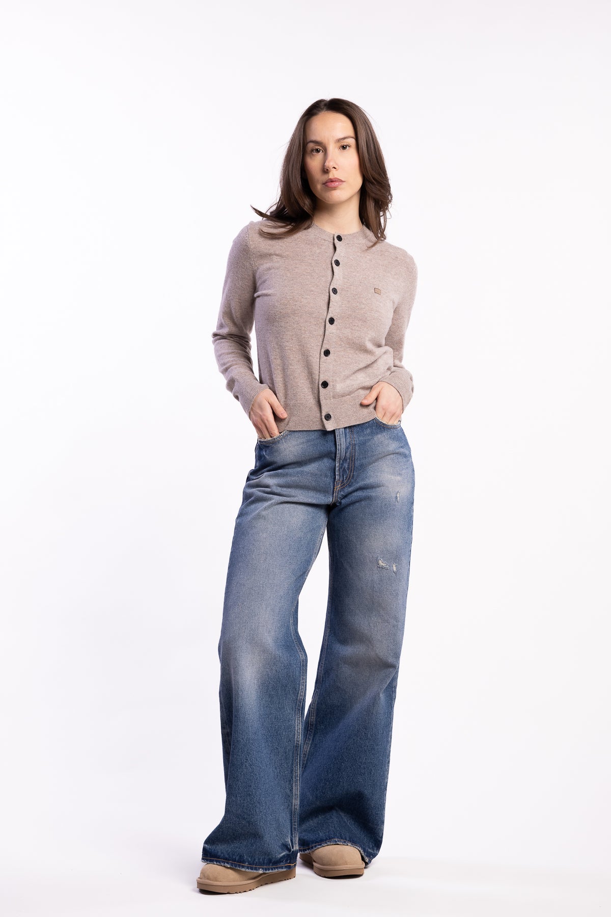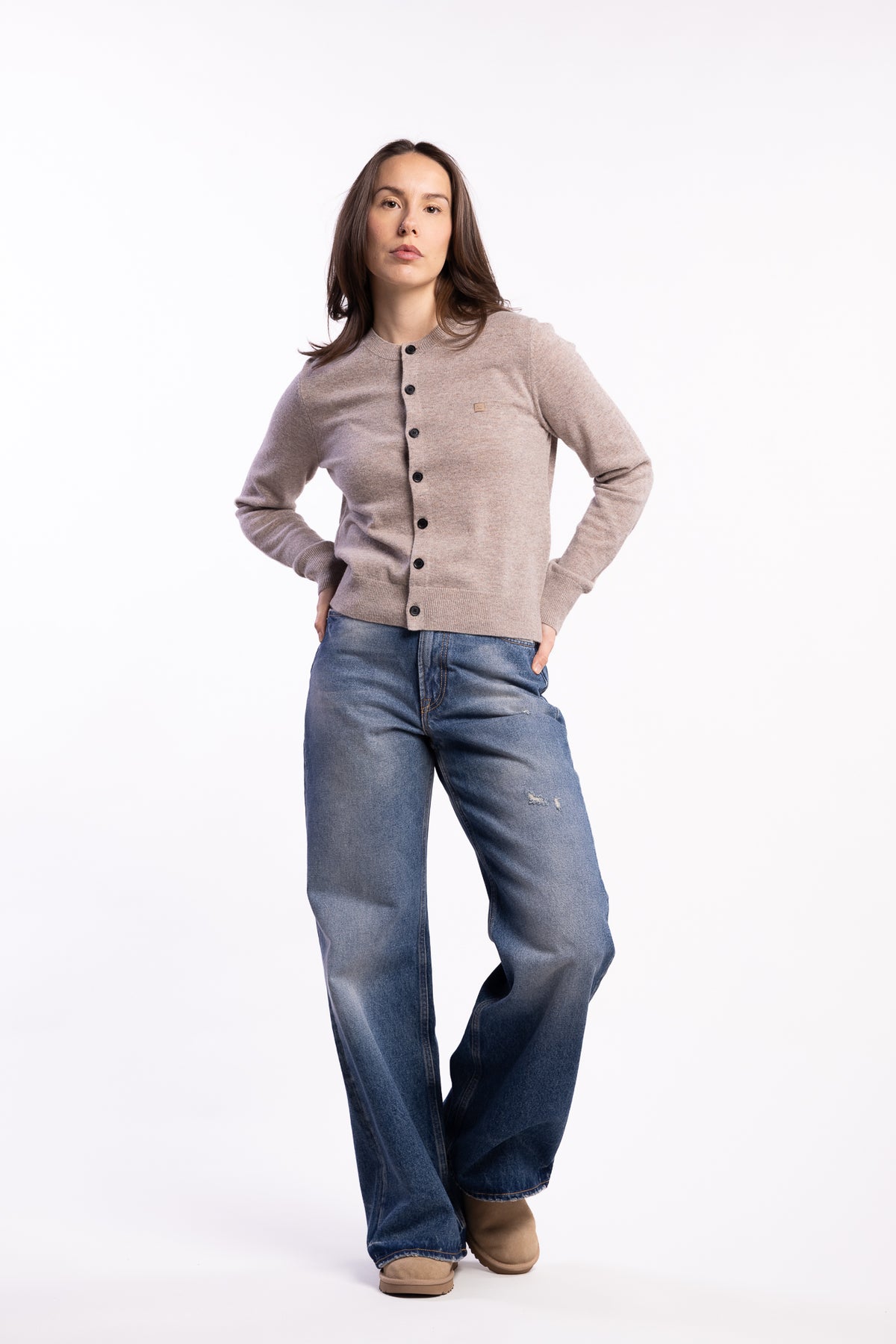 Fitted Cardigan Yak Wool fra Acne Studios er en strikket cardigan med feminin, figurnær silhuett og et rent, tidløst uttrykk. Modellen er laget i en eksklusiv blanding av ansvarlig produsert ull og myk yak-ull, som gir en behagelig følelse mot huden og god varme gjennom sesongen. Den melerte greige-fargen gjør cardiganen enkel å kombinere, enten den brukes lukket som en genser eller åpen over topp og kjole. Designet har rund hals, knappelukking i front og ribbestrikkede avslutninger som gir en definert passform. Den ikoniske Face-logoen på brystet tilfører et karakteristisk Acne Studios-preg.