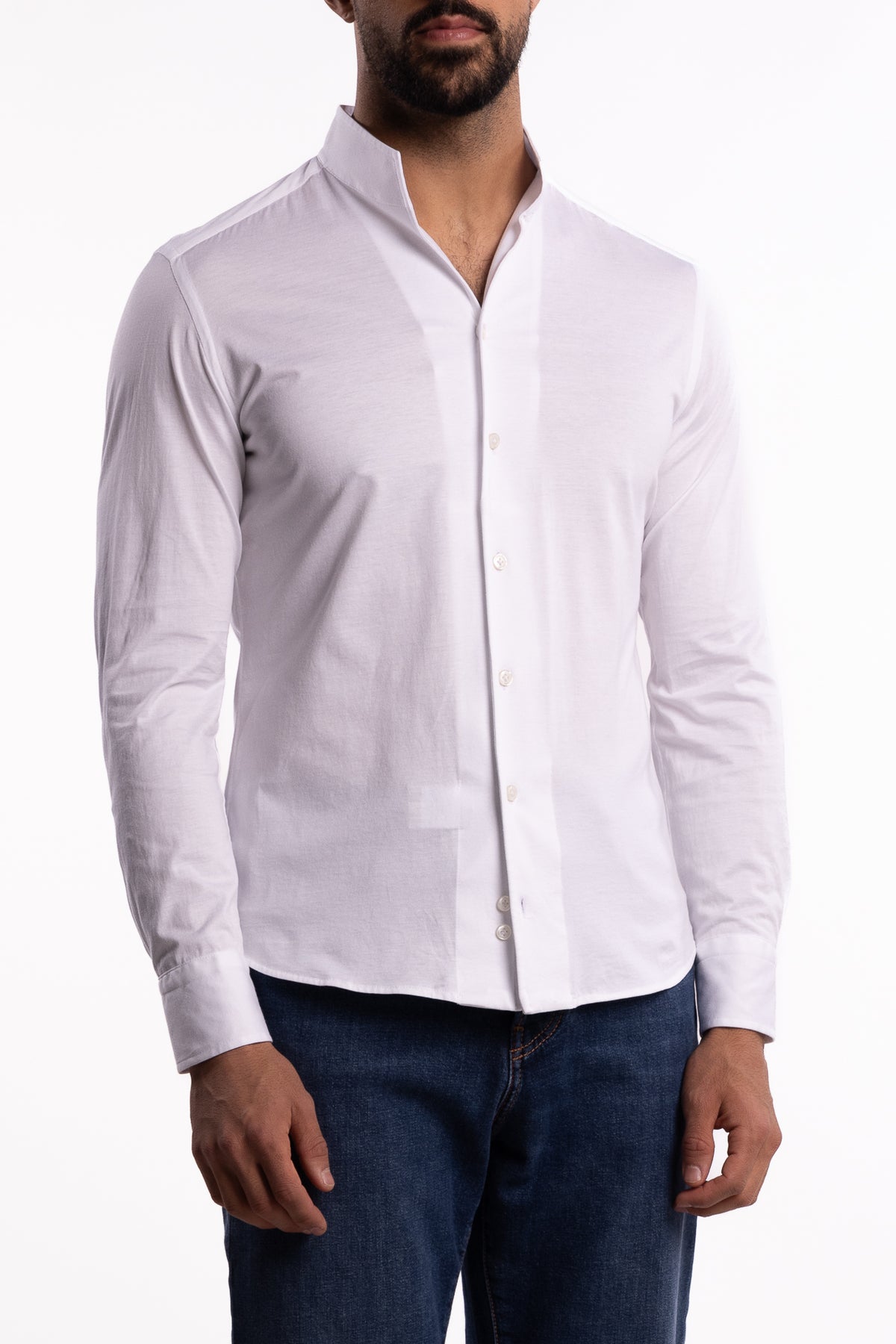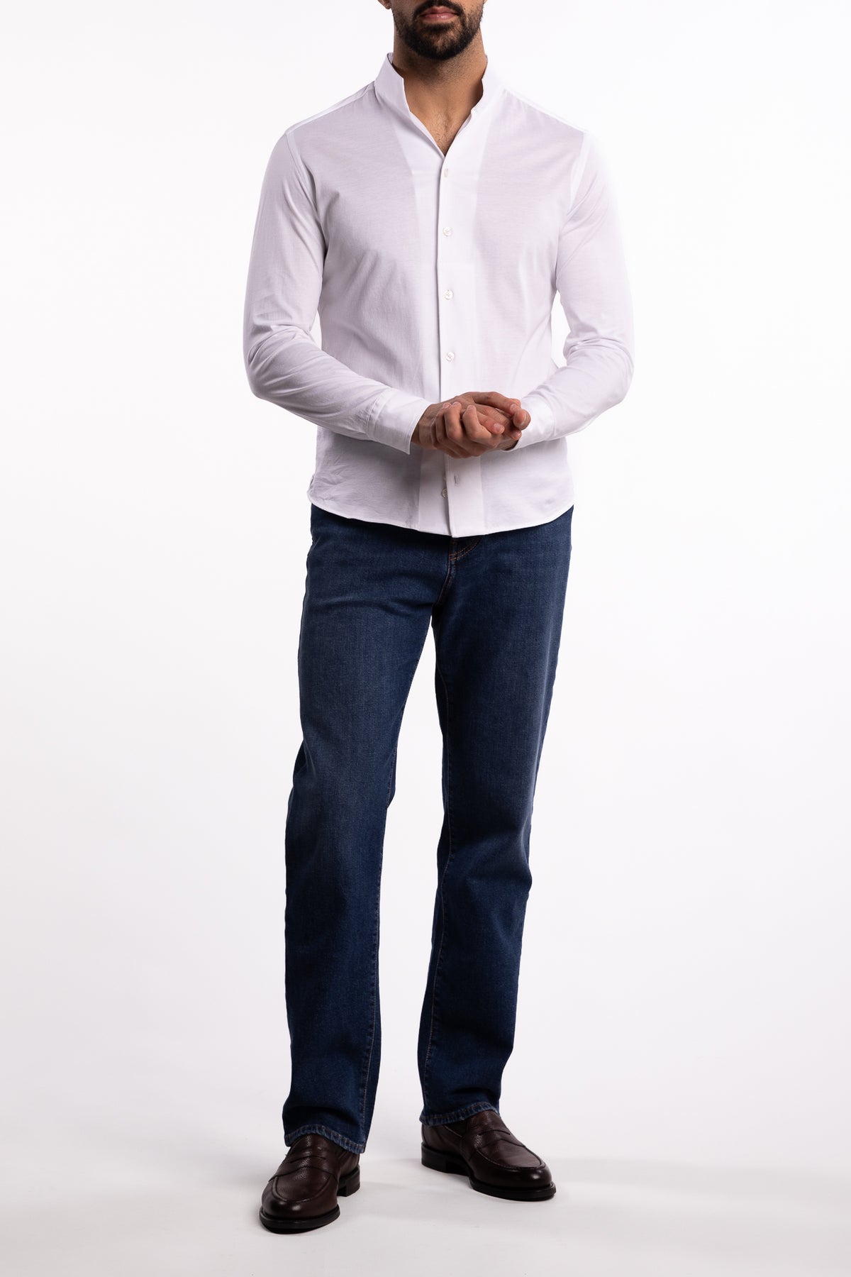 En moderne vri på den klassiske marineblå skjorten fra italienske Sonrisa. Denne modellen kommer uten tradisjonell krage, noe som gir et minimalistisk og stilrent uttrykk – perfekt for sommerlige dager eller som et lett lag under blazer. Laget i 100 % bomull med myk finish og høy komfort.