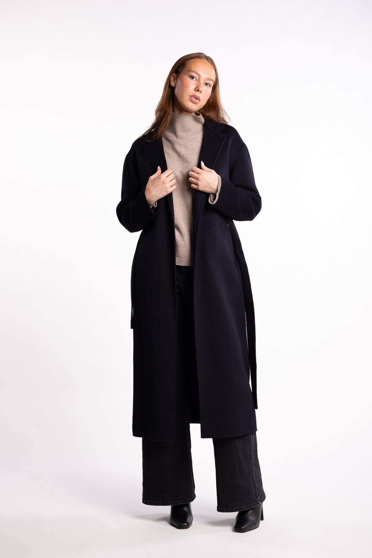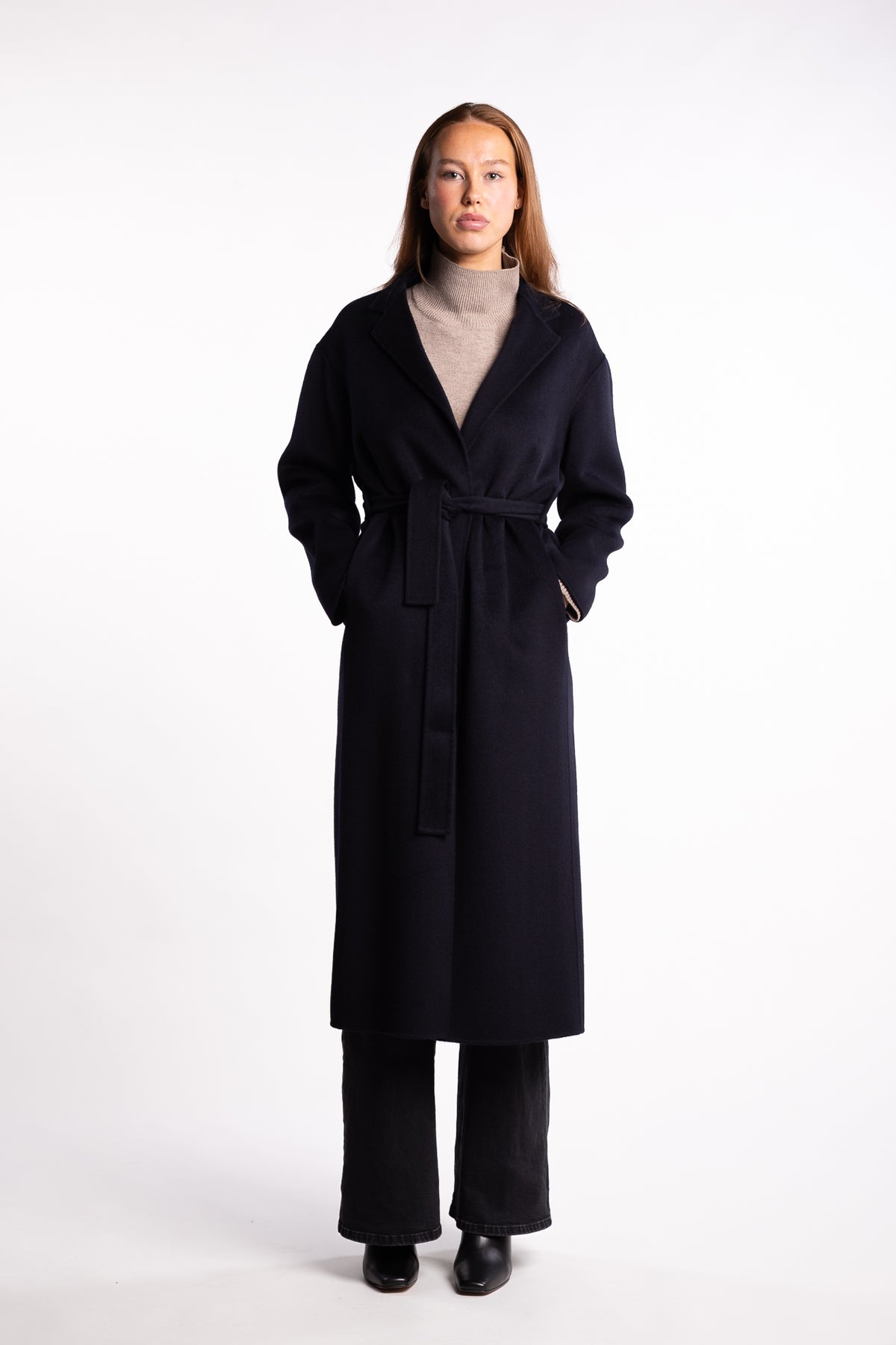 Modellen har en lang og smal fasong med belte i livet, ståkrage og droppede skuldre som gir et moderne, minimalistisk uttrykk. Et perfekt valg både til jeans og t-skjorte på en lørdag, eller over en kjole til kvelden – et klassisk plagg som varer sesong etter sesong.