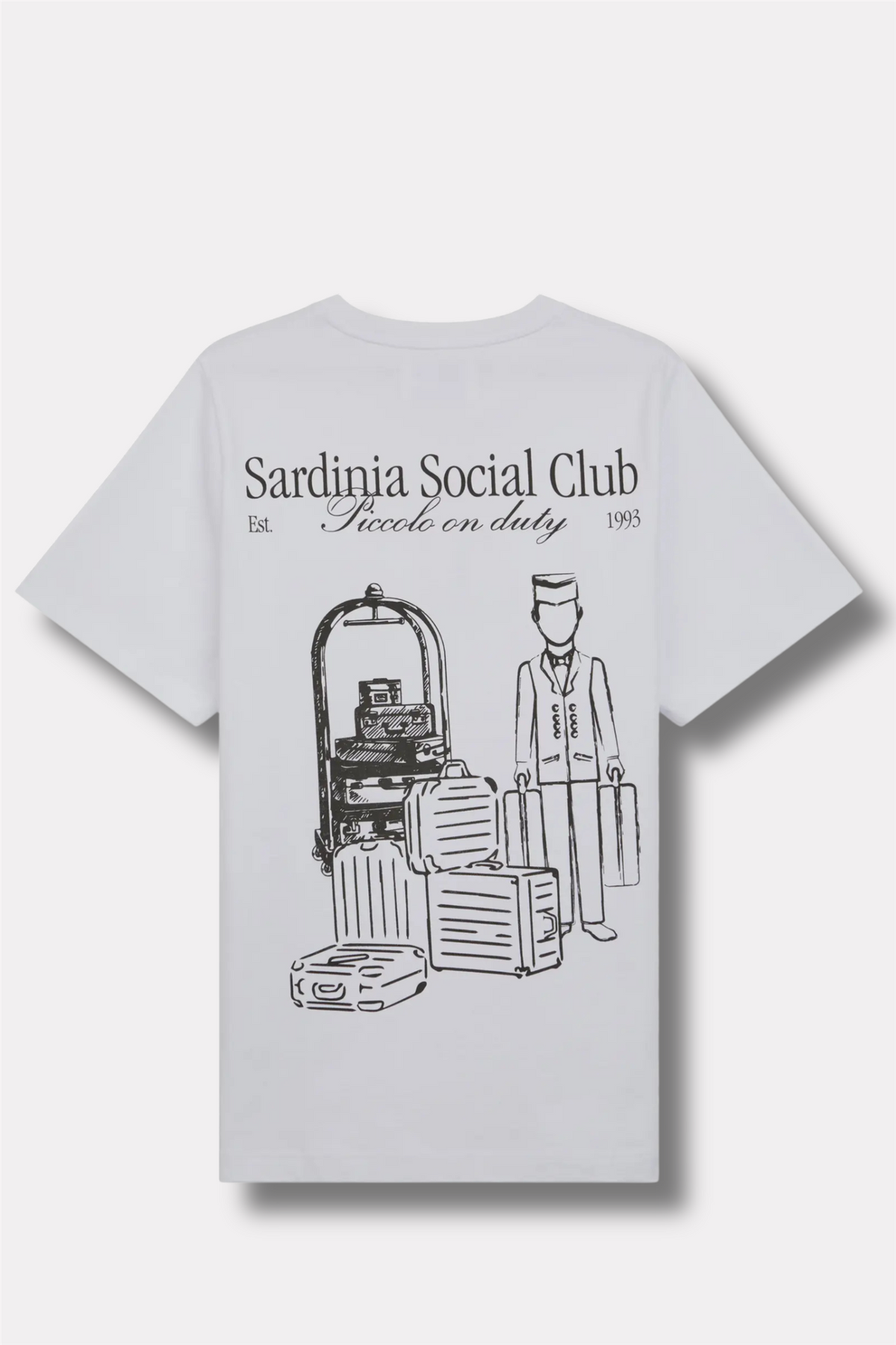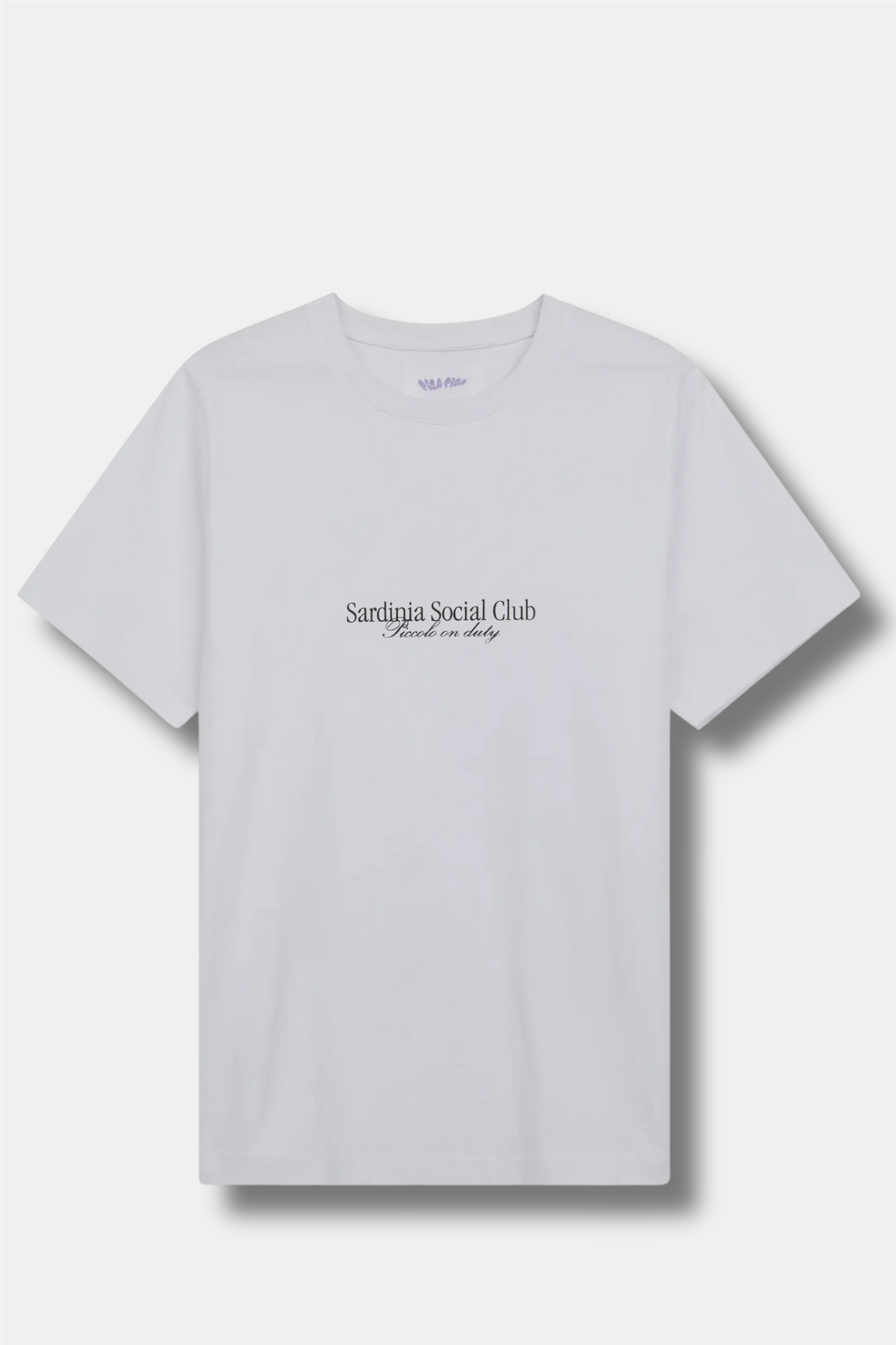 Sardinia Piccolo T-shirt fra Pica Pica i hvit bomull med vintage-inspirert trykk foran og detaljert motiv på ryggen. Laget i kraftig bomullsjersey med myk overflate og klassisk passform.