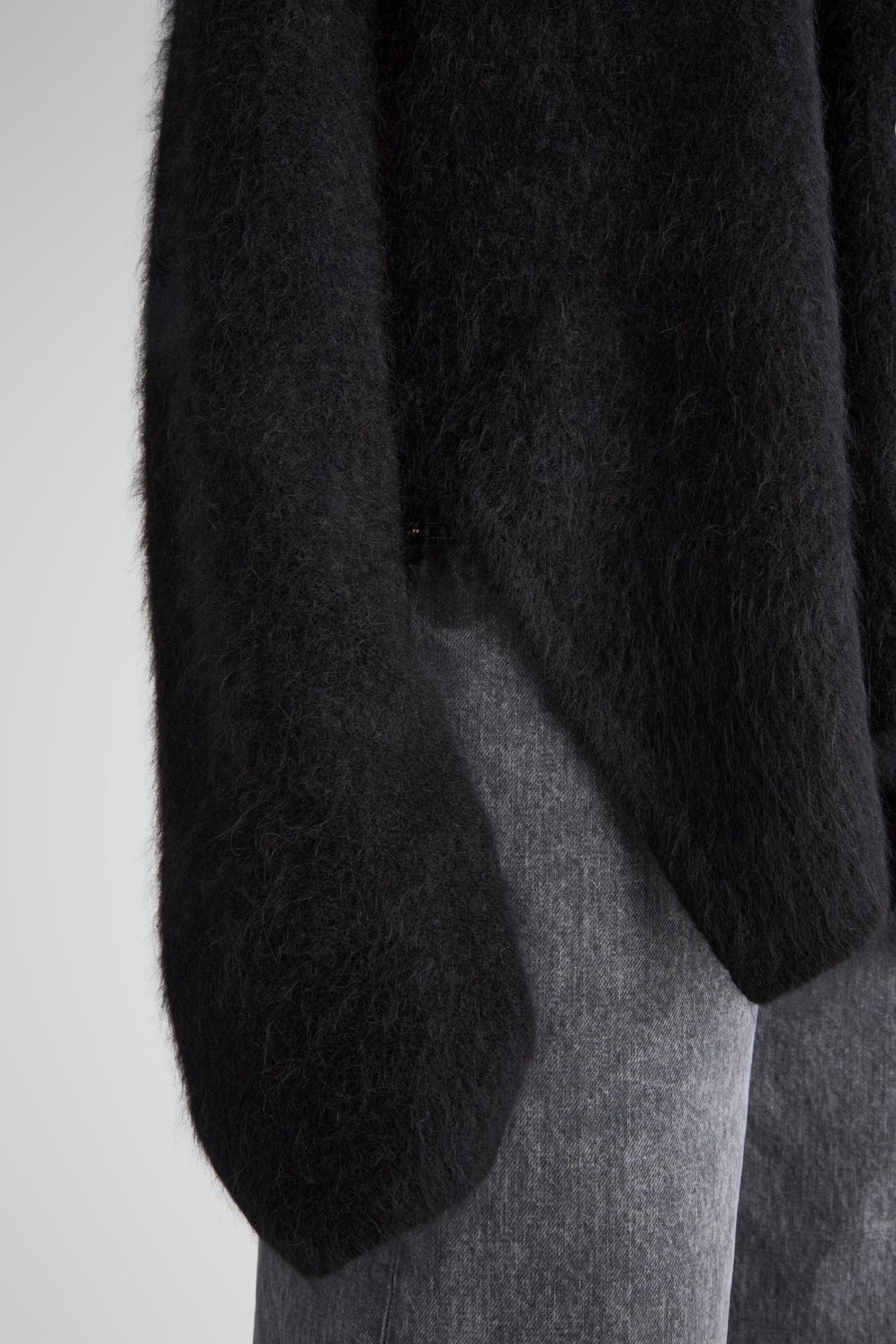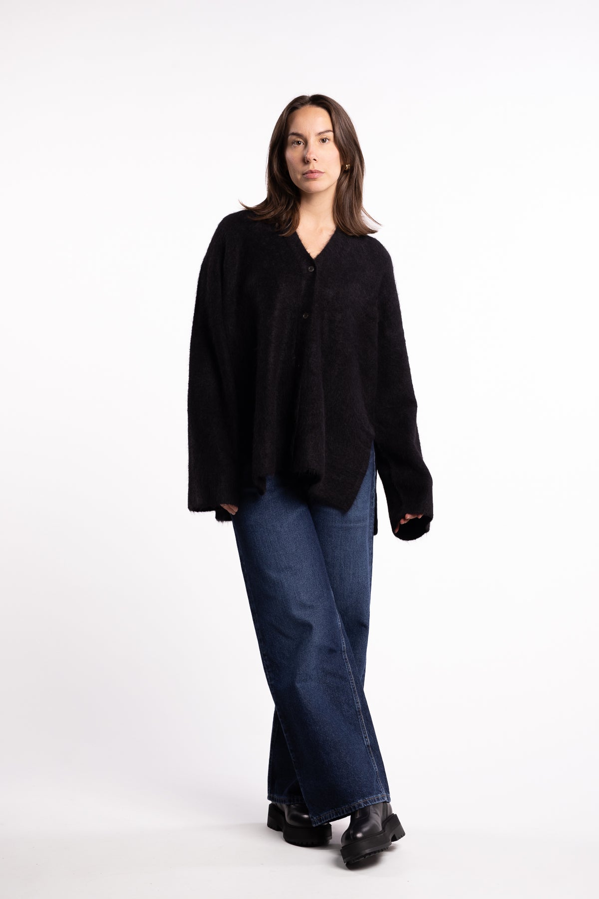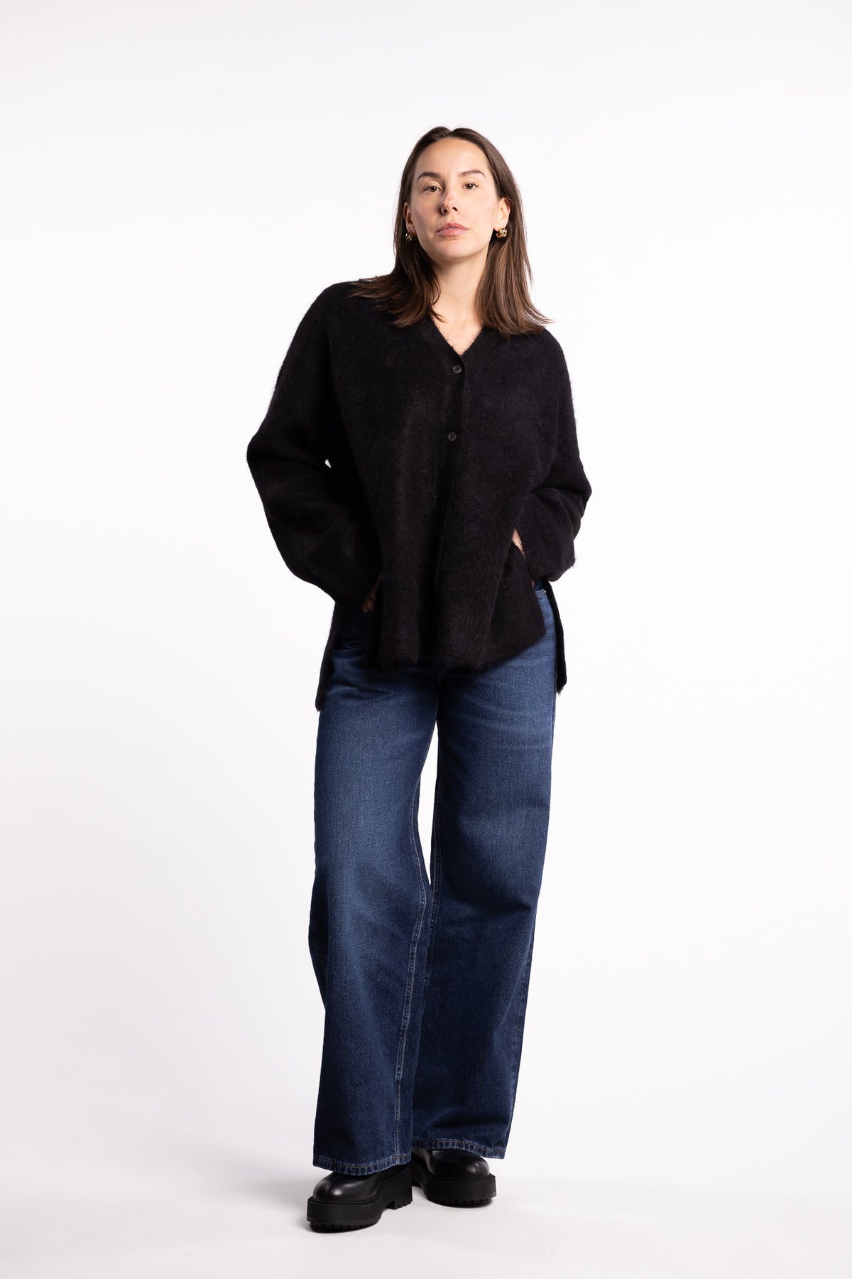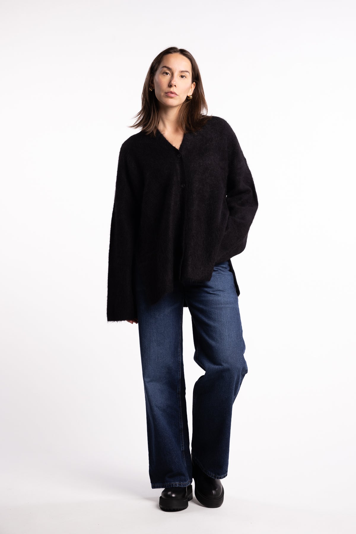 Crystal fra Livid er en myk og luksuriøs cardigan strikket i børstet alpakkaull. Modellen har en dyp V-utringning, vide ermer og droppede skuldre, med en avslappet passform og lange splitter i sidene. Cardiganen lukkes med perlemorsknapper og har en elegant, lett pusset overflate som gir et eksklusivt uttrykk.