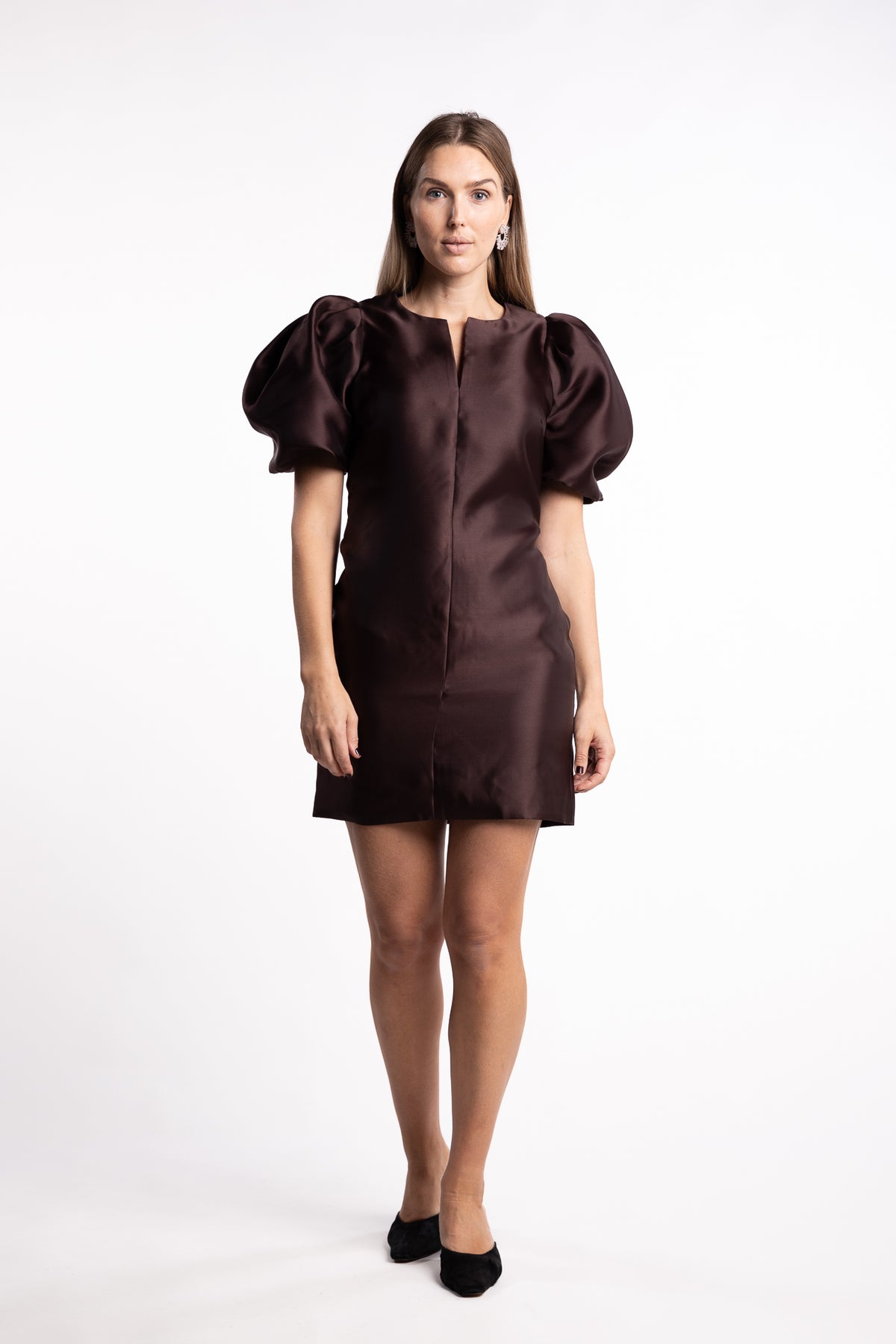 Rosie Dress fra Camilla Pihl er en elegant, figurnær kjole med smal v-hals og voluminøse ermer som avsluttes rett over albuen. Modellen har en kroppsnær passform som fremhever silhuetten, og lengden går til like over knærne for et feminint og tidløst uttrykk.