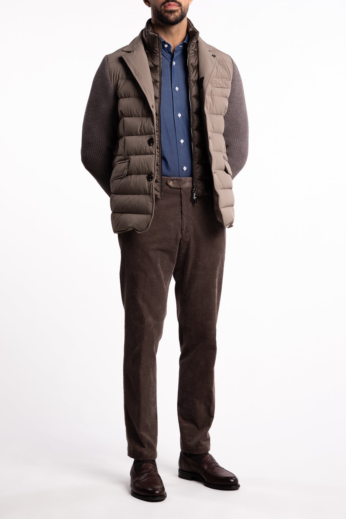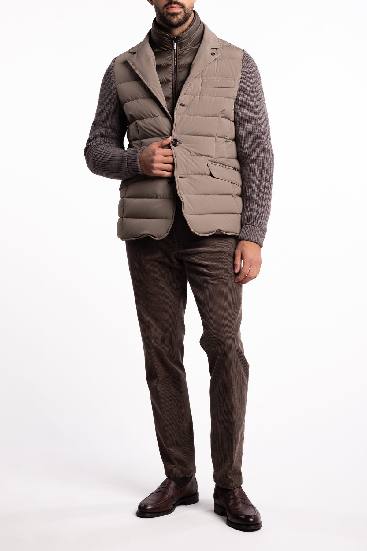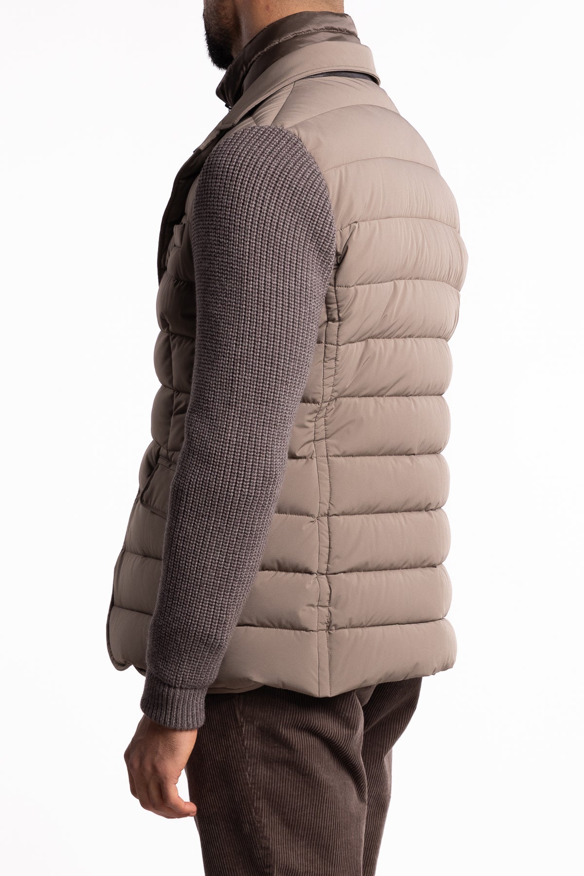 Elegant og eksklusiv jakke med tre knapper, laget i en kombinasjon av tekniske og luksuriøse materialer. Kroppen er i vannavstøtende, bi-elastisk stoff fylt med gåsedun og quiltet i boudin-mønster, mens ermene er i ribbestrikket ull–kasjmirblanding. Et raffinert hybridplagg med italiensk presisjon.