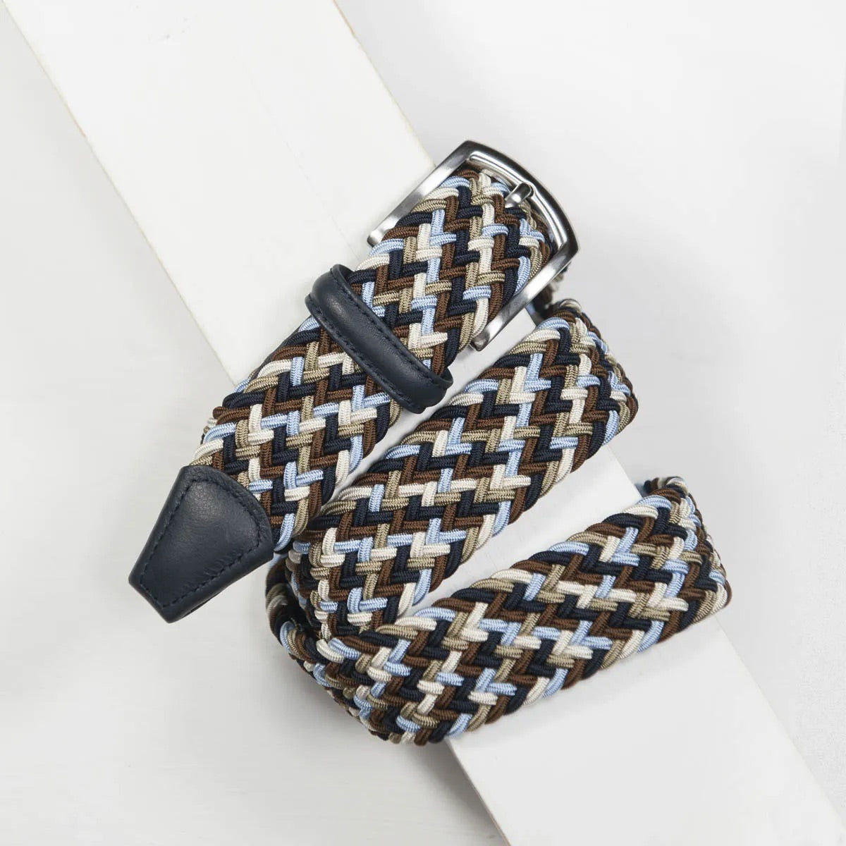 Vevd elastisk belte fra Anderson’s i flerfarget mønster med nyanser av marine, himmelblå, taupe og krem. Beltet kombinerer italiensk håndverk med moderne komfort og fleksibilitet, og er ferdigstilt med skinnforsterkninger og sølvfarget spenne.