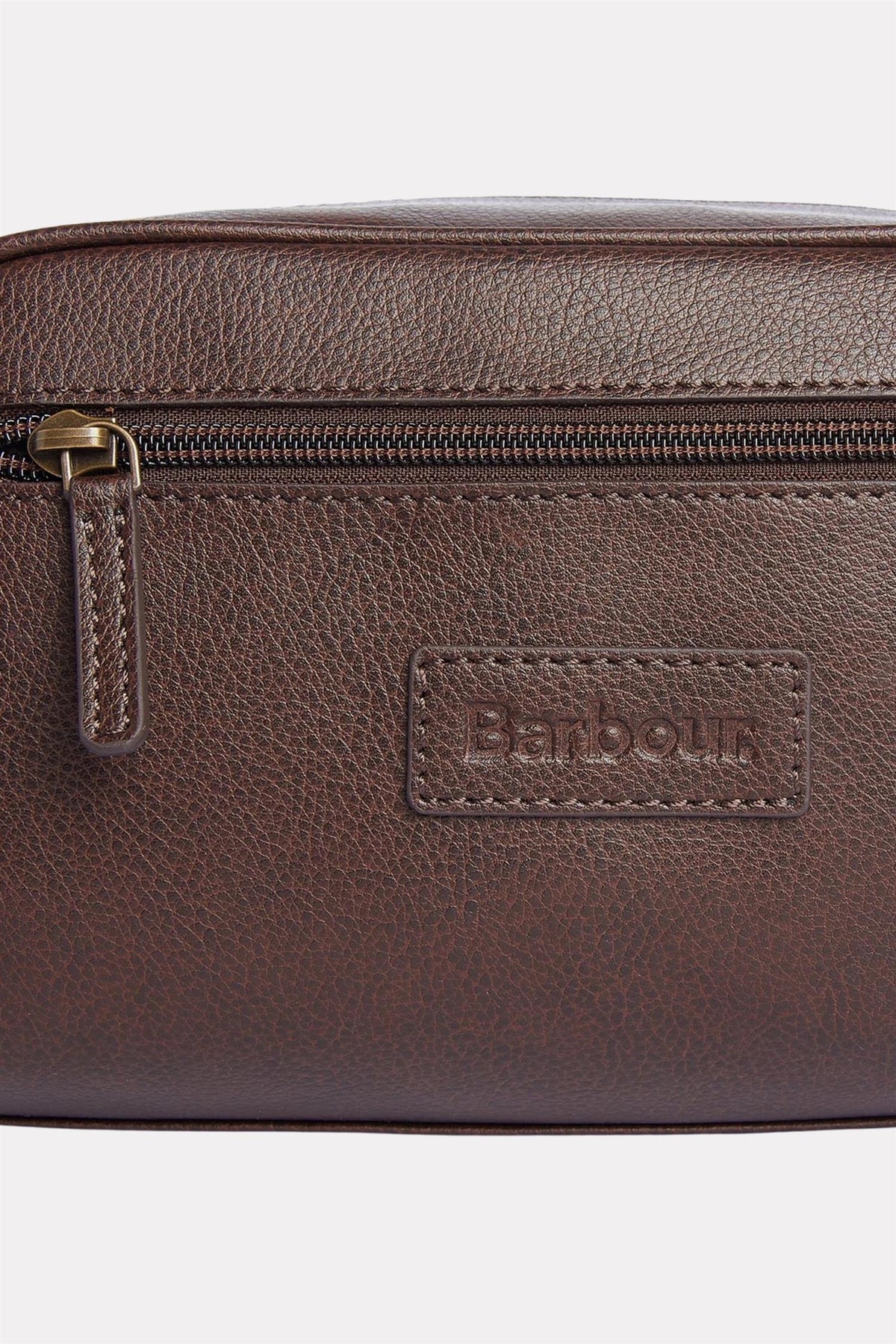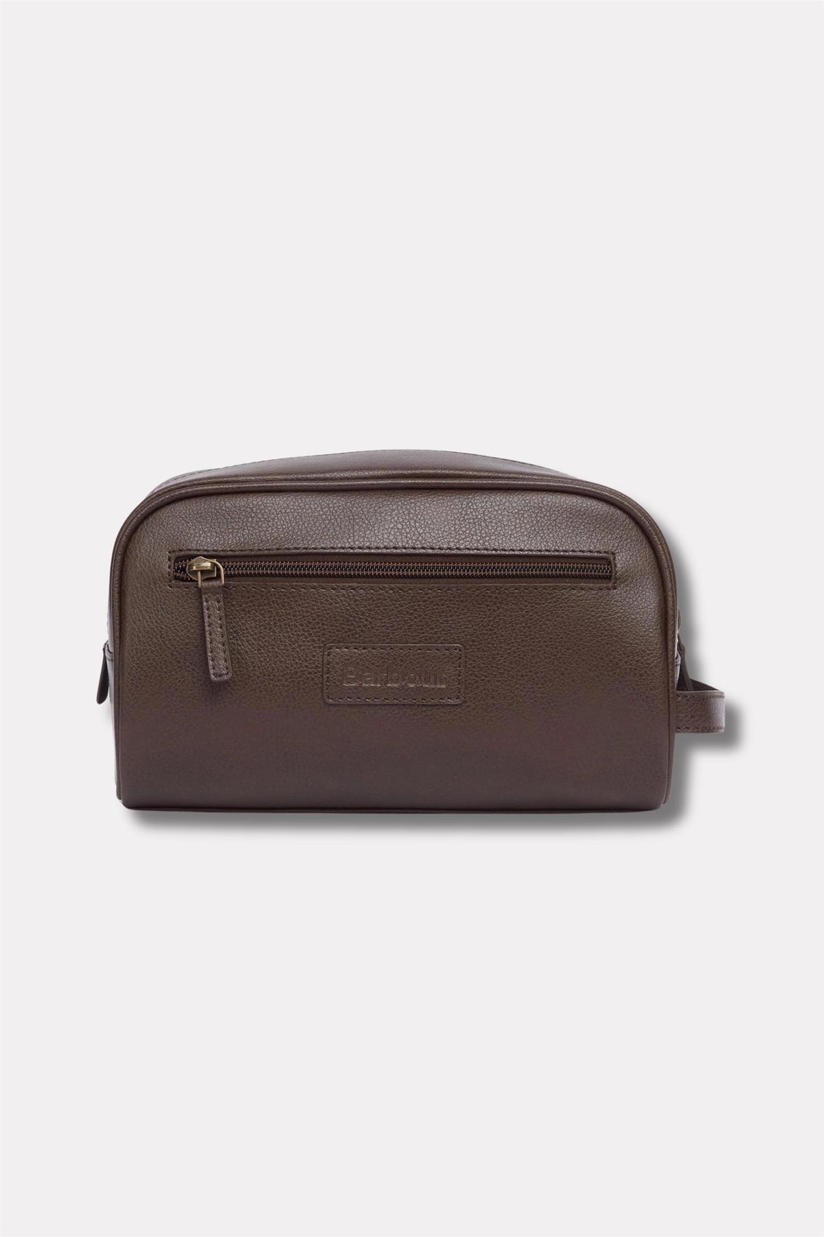 Leather Washbag er en toalettmappe i robust skinn med naturlig kornet finish og avrundede kanter. Den har bærehåndtak, utvendig glidelåslomme og preget Barbour-logo foran.