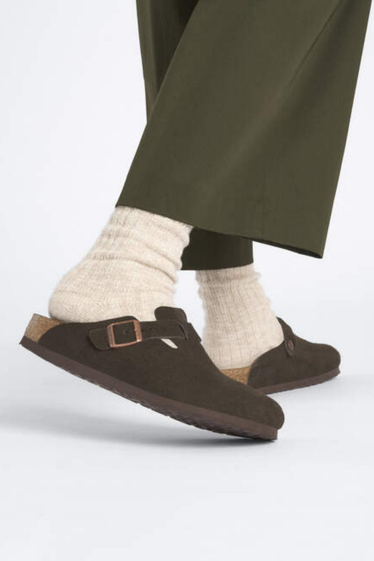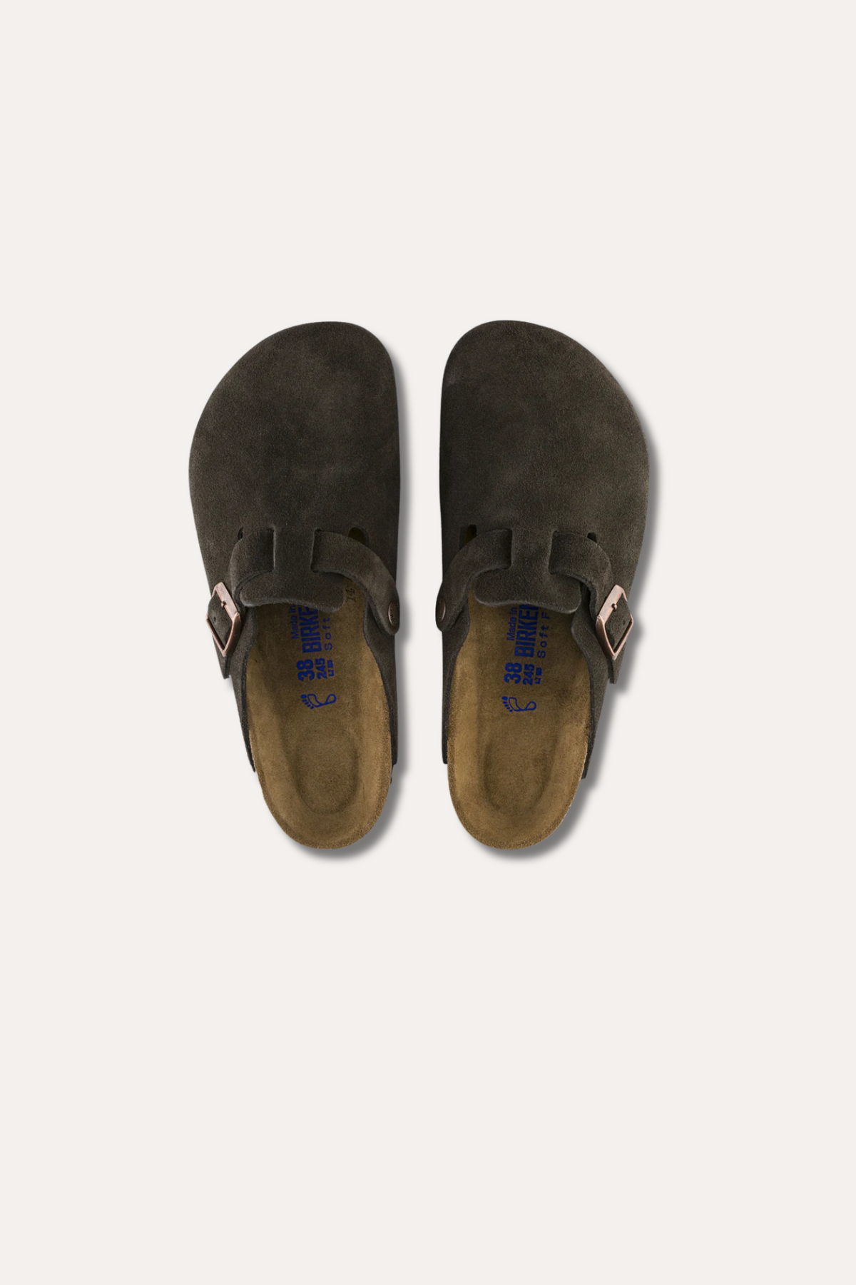 Boston Suede Leaher fra Birkenstock. Disse sandalene har et annet design enn den klassiske Arizona modellen, hvor overdelen er hel med en enkelt spenne. Sandalen er fin til innendørs bruk som ute om sommeren.
