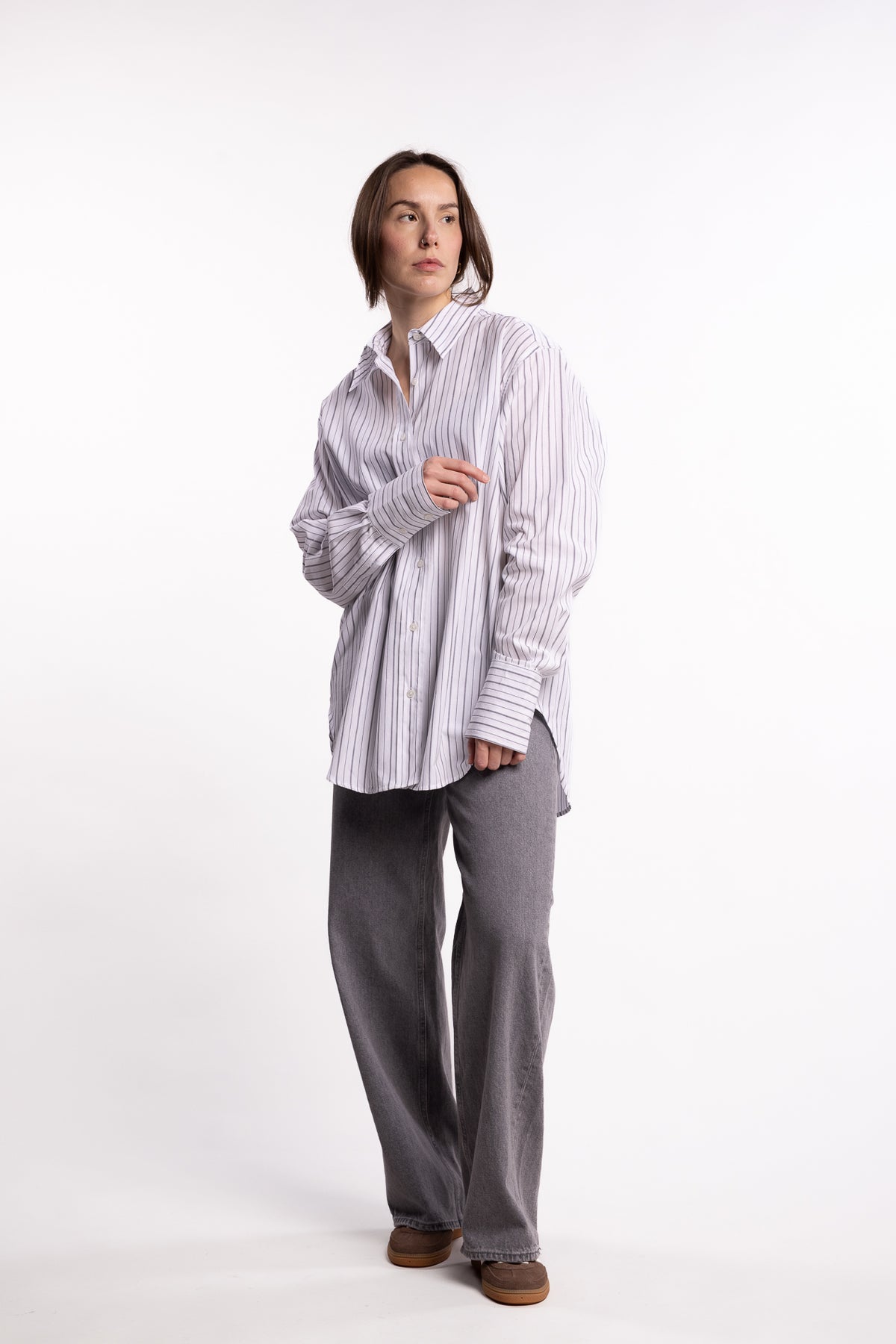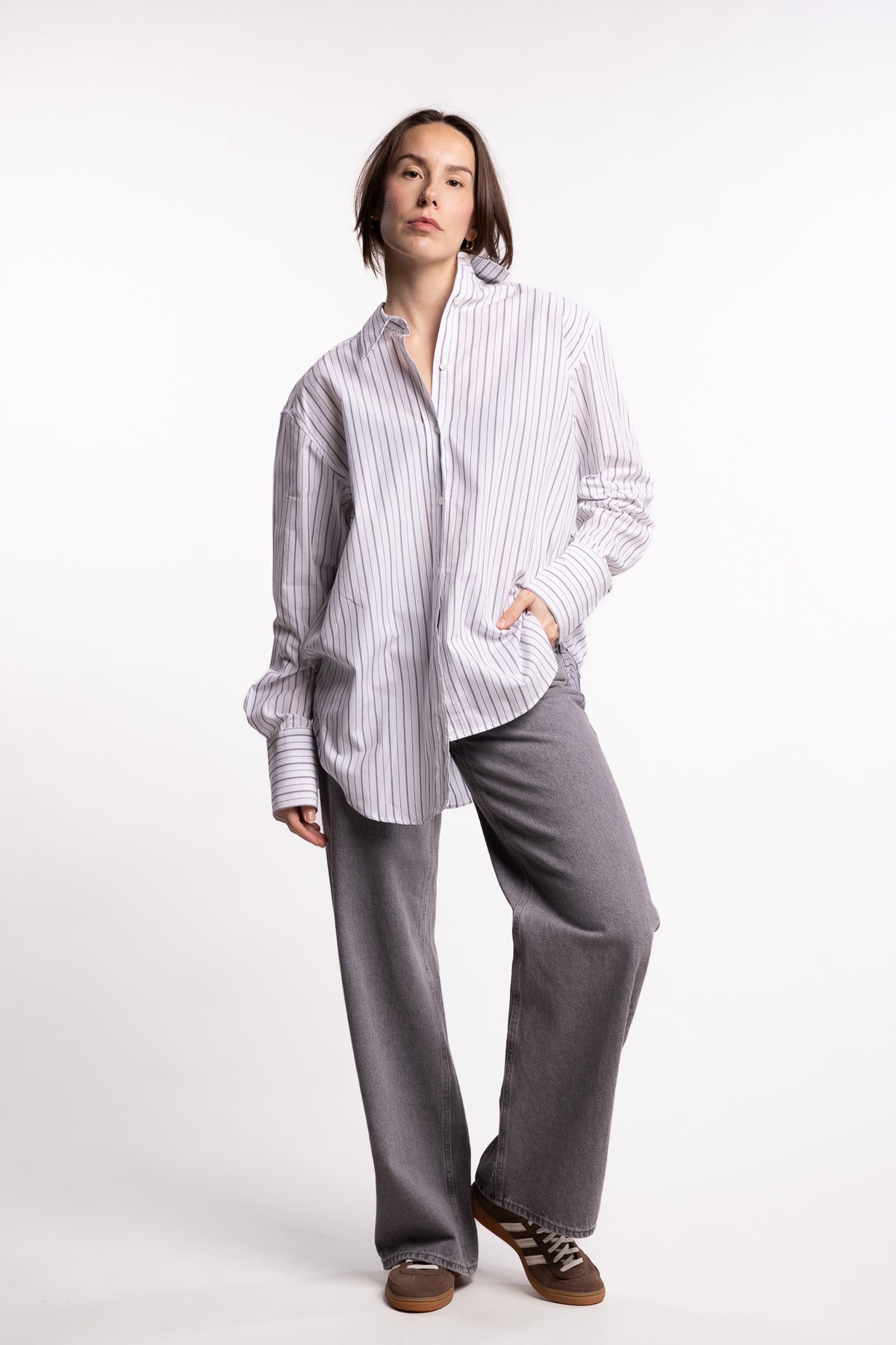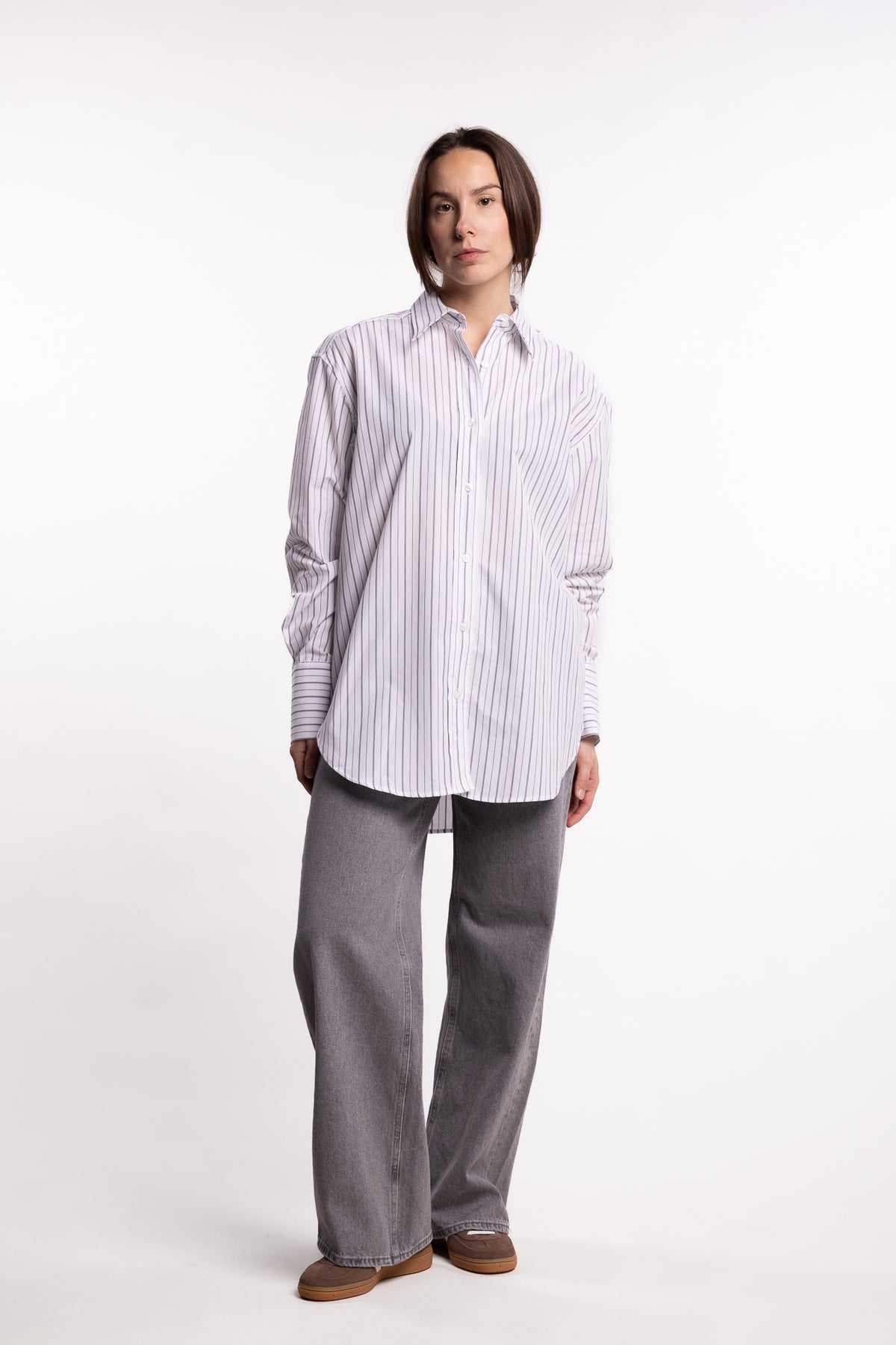 Salovas Shirt 13072 fra Samsøe Samsøe er en skjorte med en løs, moderne passform som gir et avslappet og samtidig raffinert uttrykk. Den har knappelukking i front, mansjetter med knapper og fine leggdetaljer bak som skaper en pen fallende silhuett. Krage og mansjetter er laget med kontraststoff for et tydelig og stilrent designuttrykk. Skjorten er vevd i Portugal av 100 % økologisk bomull – et kvalitetsmateriale som gir både struktur, komfort og god pusteevne.