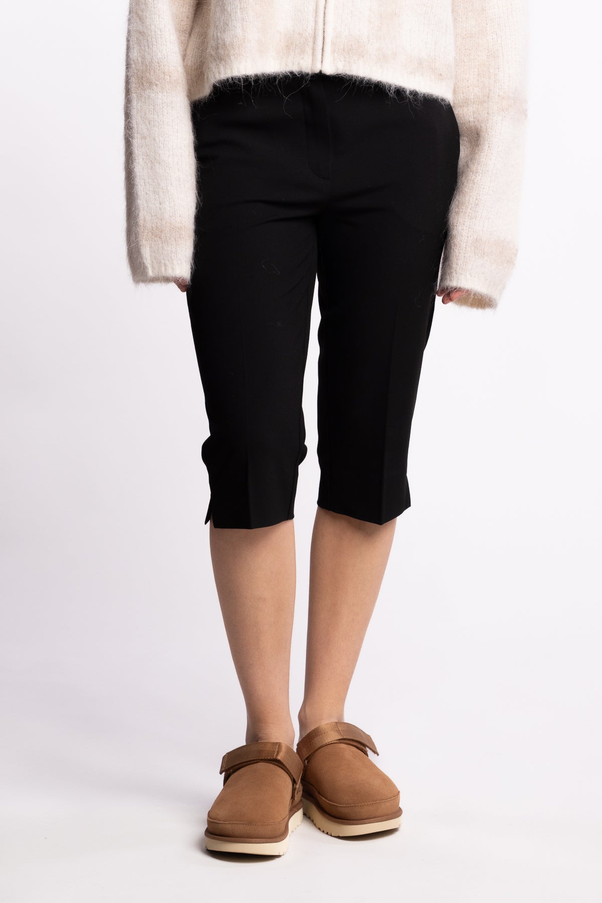 ClaraFV Capri fra Five Units er en chic og moderne bukse med cropped lengde og et stramt, stilrent uttrykk. Modellen har slim passform og medium høyt liv, med rette ben som avsluttes med en diskré splitt nederst – en detalj som gir plagget et lett og elegant preg. Skarpe pressfolder og skrålommer i front tilfører et skreddersydd uttrykk, mens den minimalistiske hektelukkingen i livet holder helheten ren og sofistikert. En perfekt bukse til både jobb, middag og mer pyntede anledninger. Designet i København og produsert av spesialister i Tyrkia.