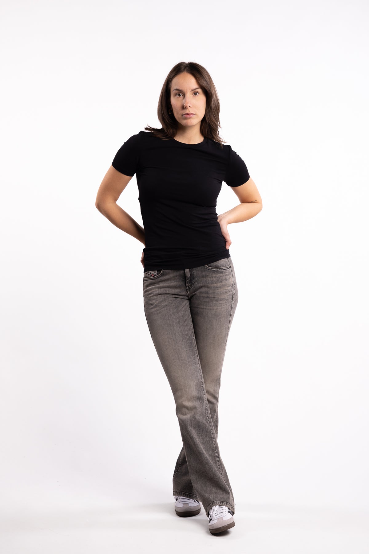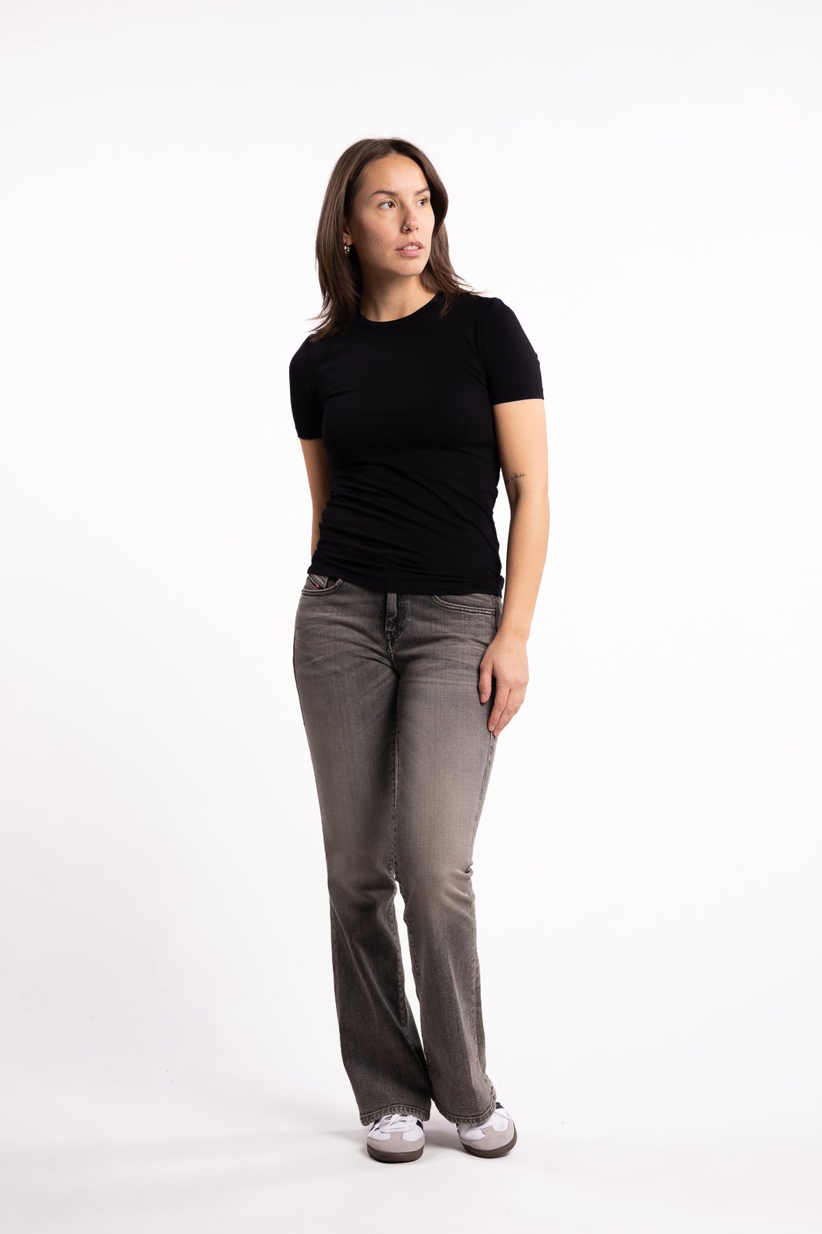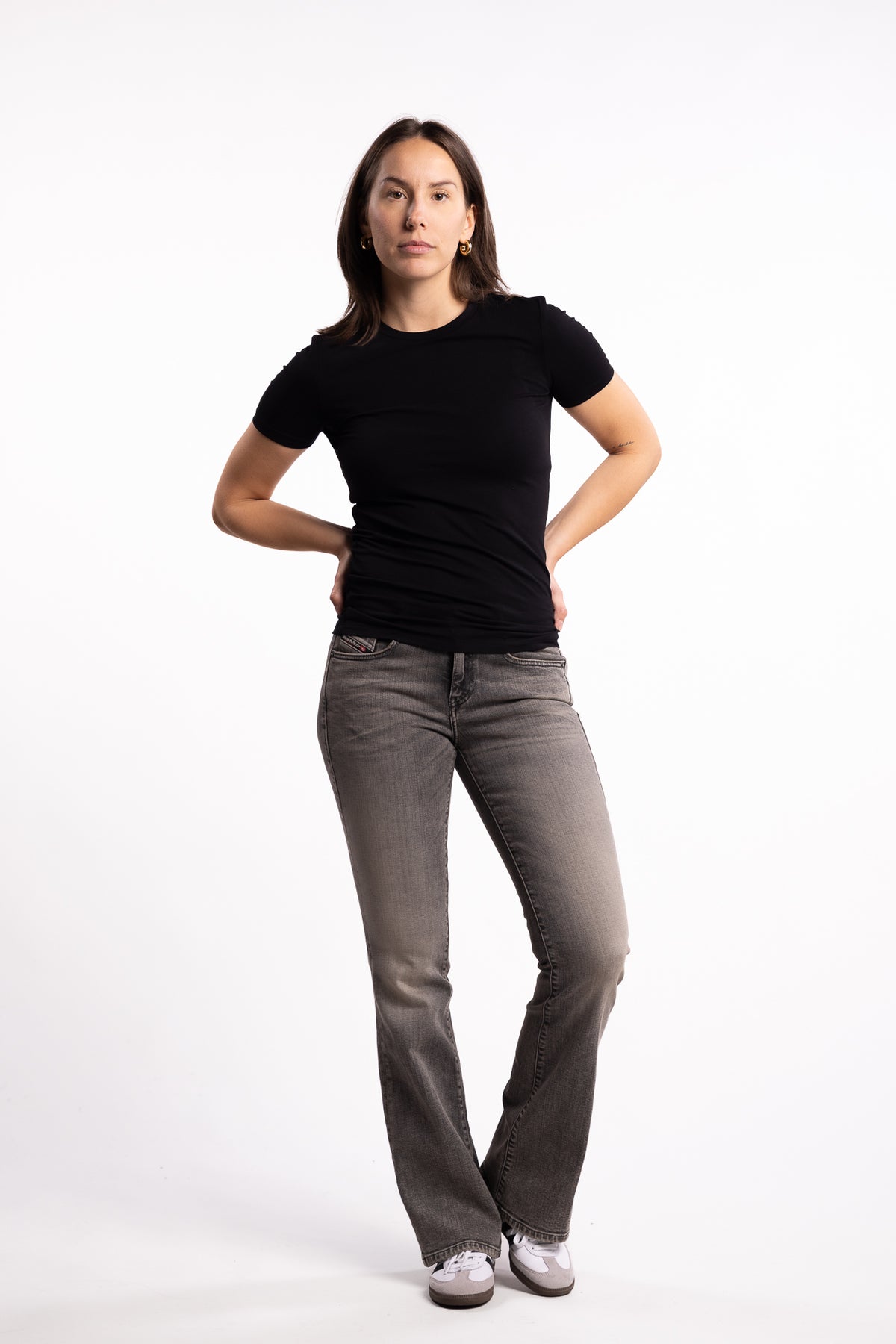 1969 D-Ebbey fra Diesel er bootcut-jeans med lav midje og noe høyere dekning bak. Denne stretch-jeansen er en del av Diesel's DNA-kolleksjon bestående av de beste modellene. Den har en grå vasket finish.
