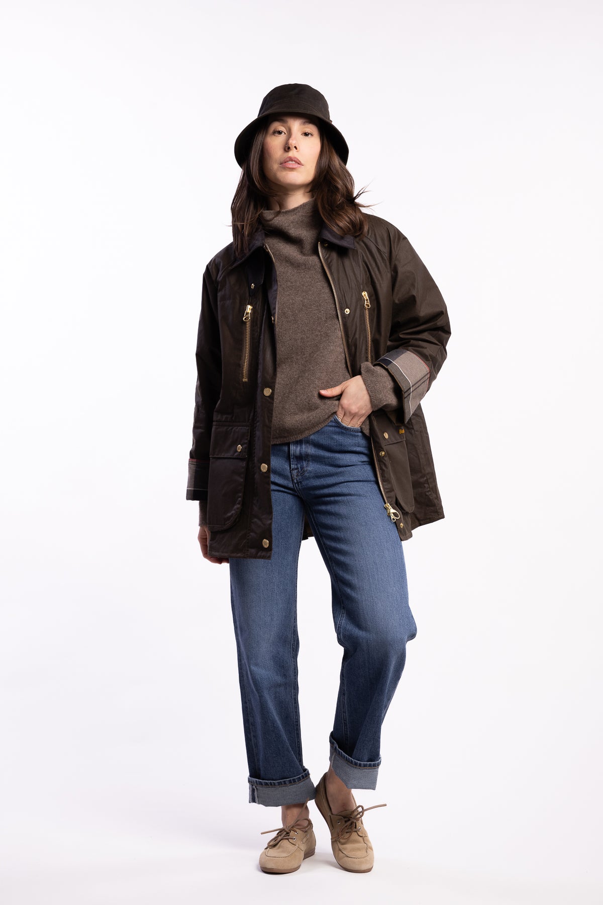 Argill Wax fra Barbour er en klassisk voksjakke med et rent, tidløst uttrykk og praktiske detaljer til hverdagsbruk. Jakken er laget i slitesterk vokset bomull som gir god beskyttelse mot vær og vind, samtidig som den beholder et avslappet og anvendelig preg. Designet har kordfløyelkrage, trykknapplukking og glidelås i front, samt romslige lommer som gir både funksjon og balanse i uttrykket. Gullfargede metalldetaljer tilfører en diskret kontrast til den brune fargen. Legg i ryggen gir god bevegelighet og et fint fall, med trykknapp bak for justering. En allsidig jakke som passer like godt til jeans som til mer klassiske antrekk.