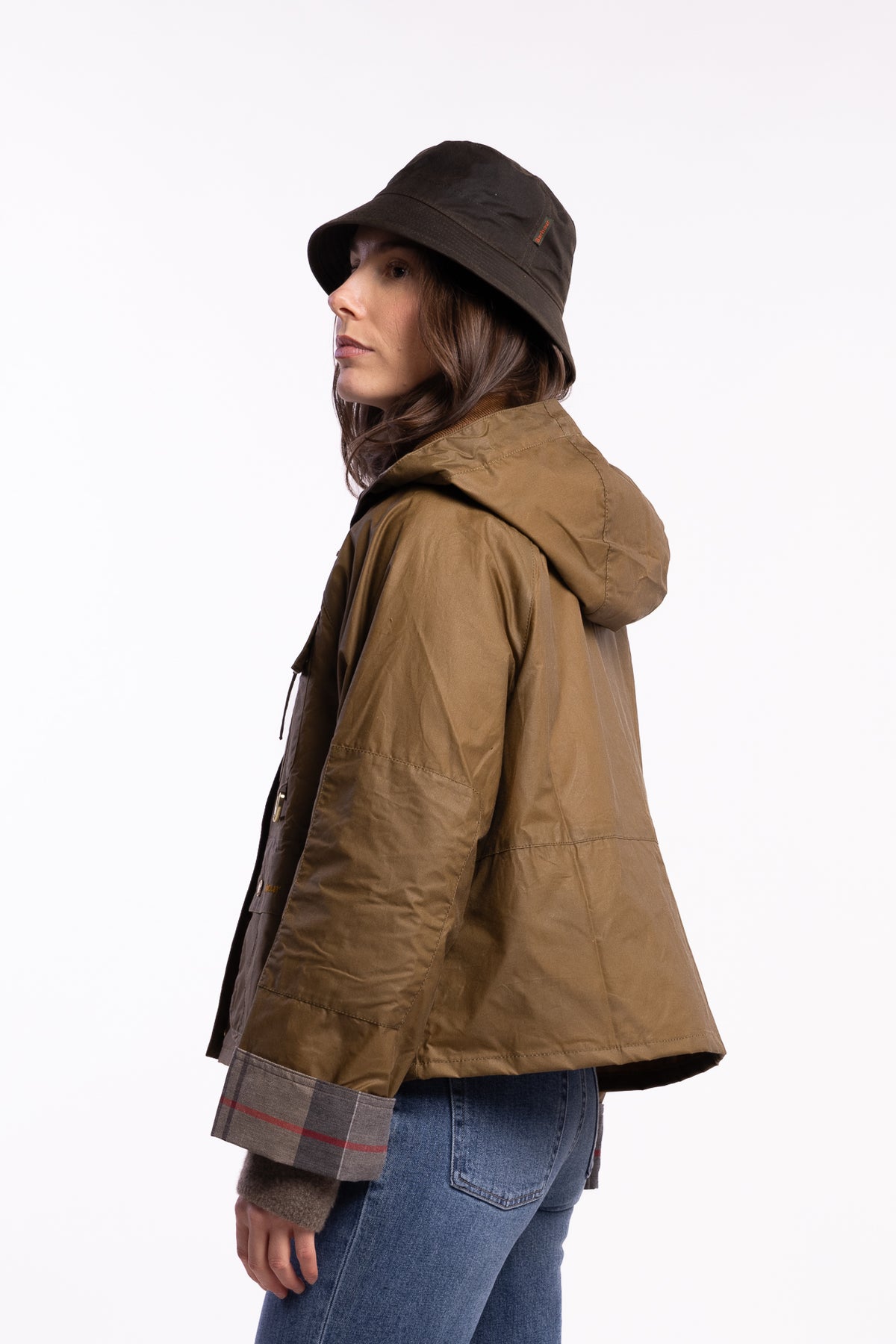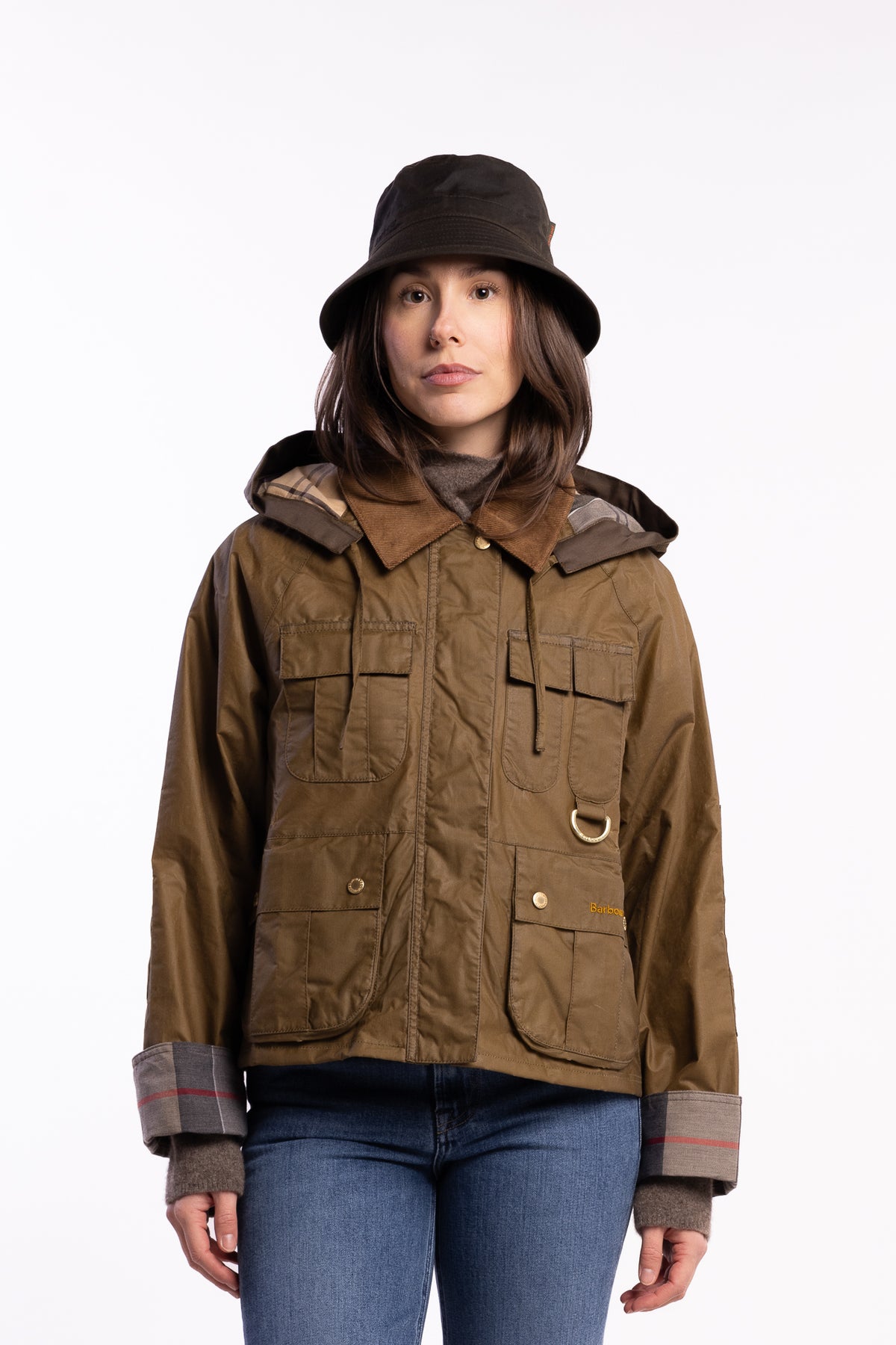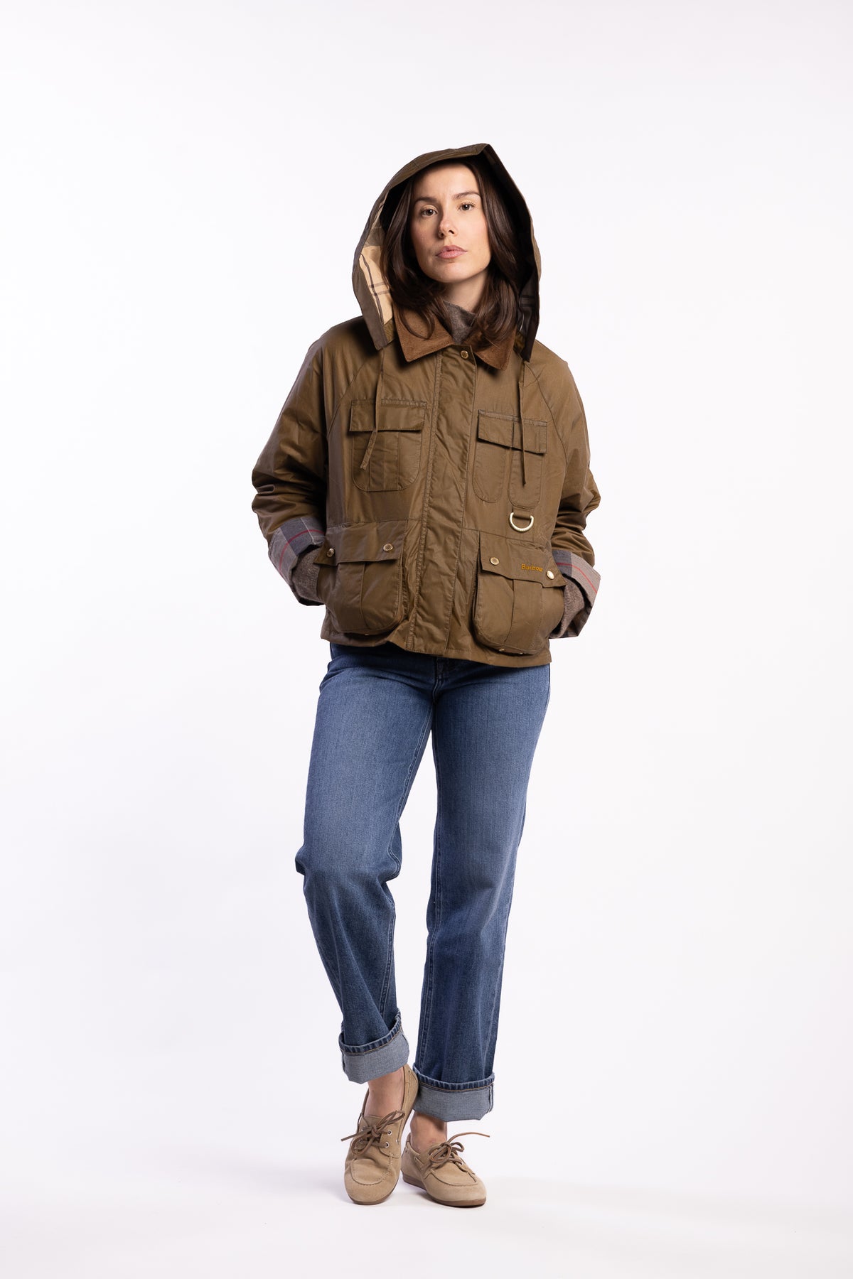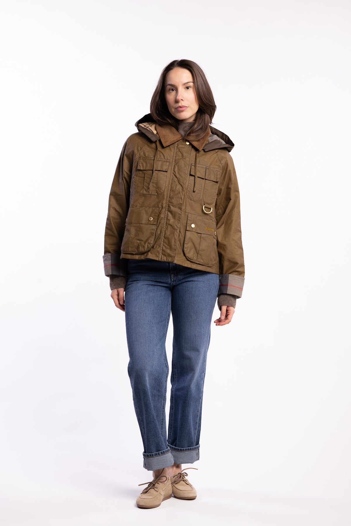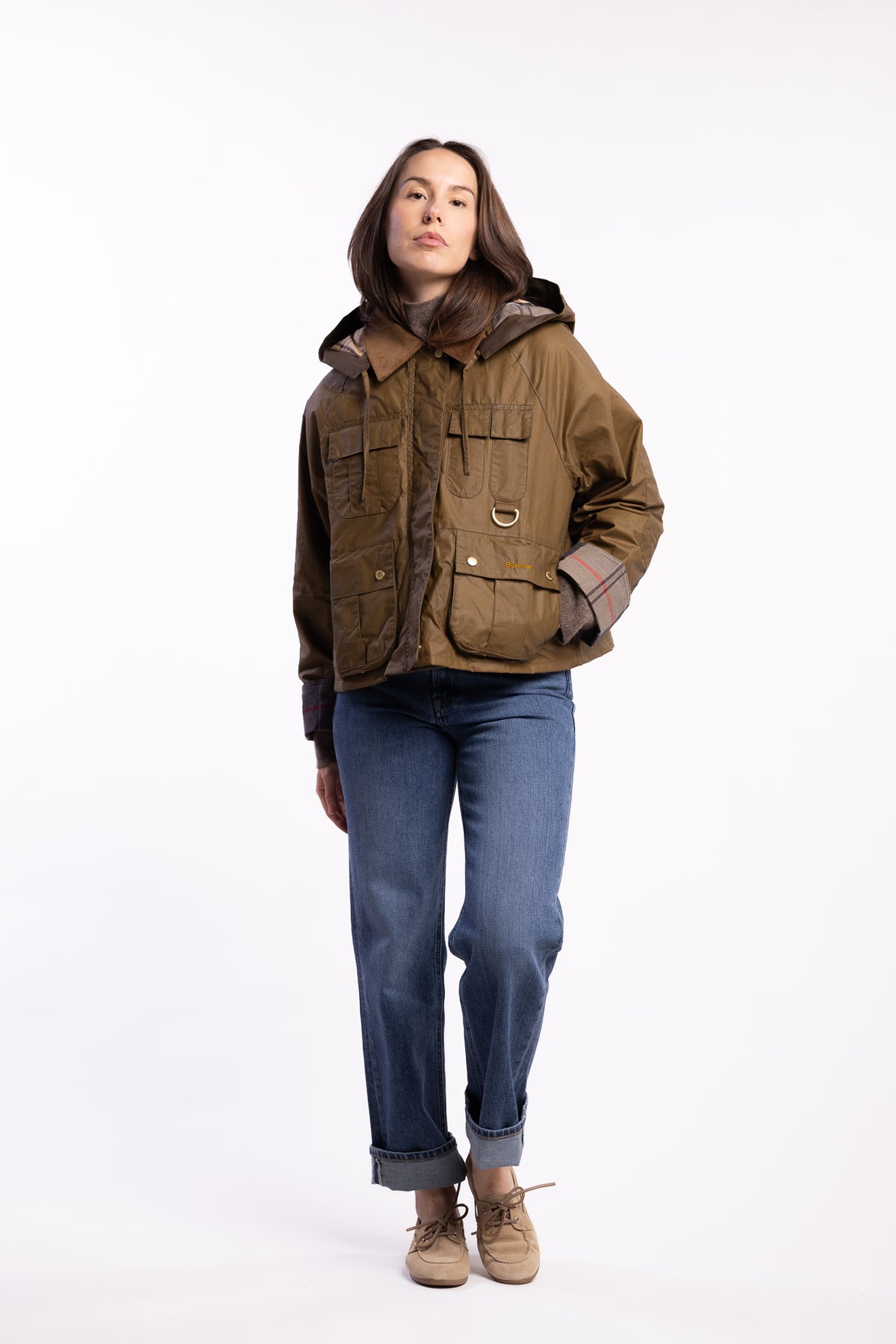 Liza Wax fra Barbour er en kort voksjakke med et moderne snitt og tydelig Barbour-DNA. Jakken er laget i slitesterk vokset bomull som gir god beskyttelse mot vær og vind, og kombinerer funksjon med et urbant uttrykk. Designet har kontrastfarget kordfløyelkrage, hette og flere praktiske lommer som gir jakken et gjennomført og anvendelig preg. Den korte lengden gir en avslappet silhuett som er enkel å style til både jeans og skjørt, mens gullfargede detaljer og diskret Barbour-logo setter en klassisk finish. En perfekt overgangsjakke for hverdager med skiftende vær.