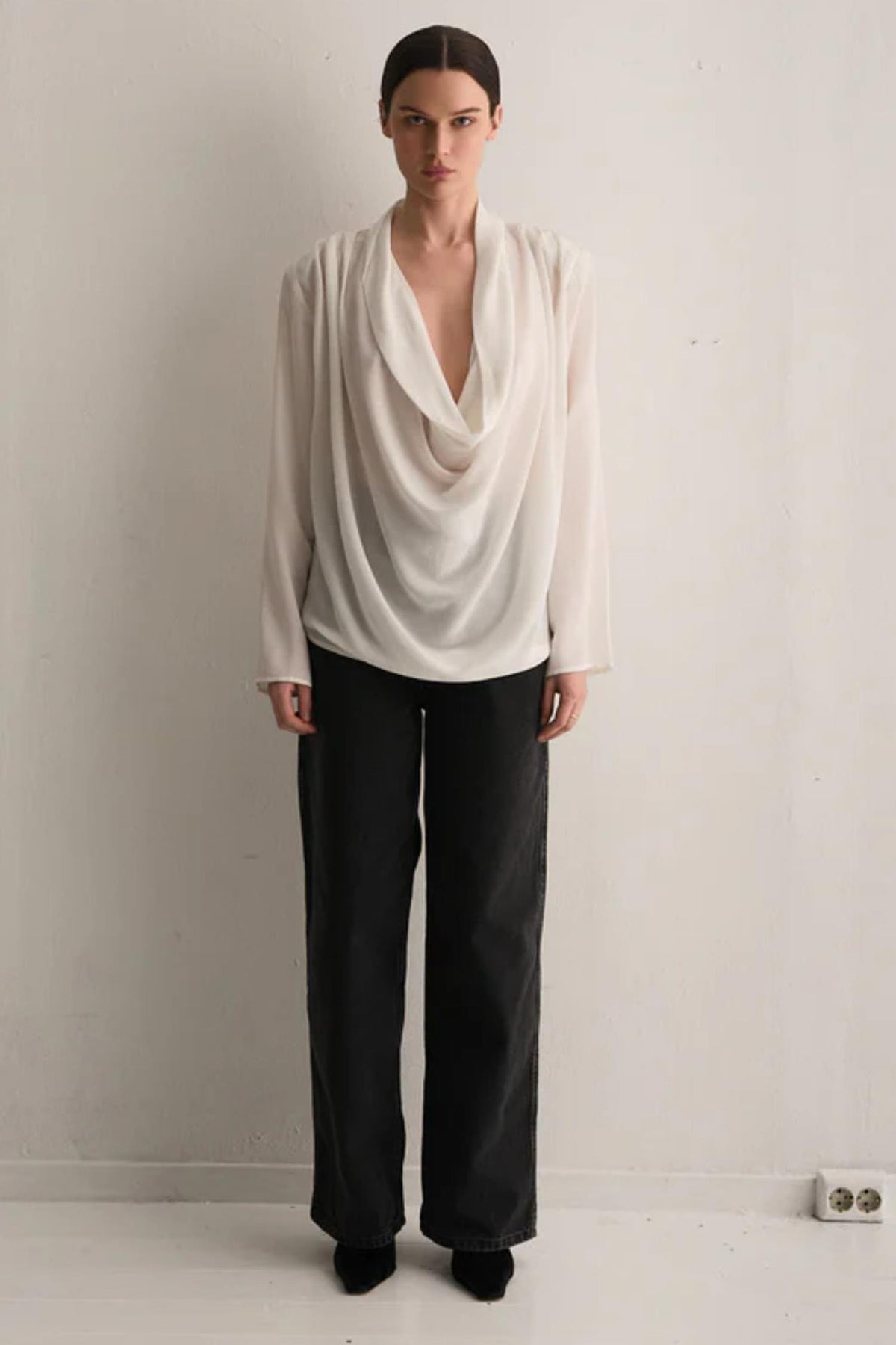 Foss Top fra Envelope1976 har et moderne, skulpturelt uttrykk med en dyp drapert utringning som gir en elegant, men uanstrengt look. Den flytende viskosen faller mykt og skaper et vakkert spill i stoffet – perfekt både til skreddersydde bukser og denim for en kontrast mellom struktur og bevegelse.