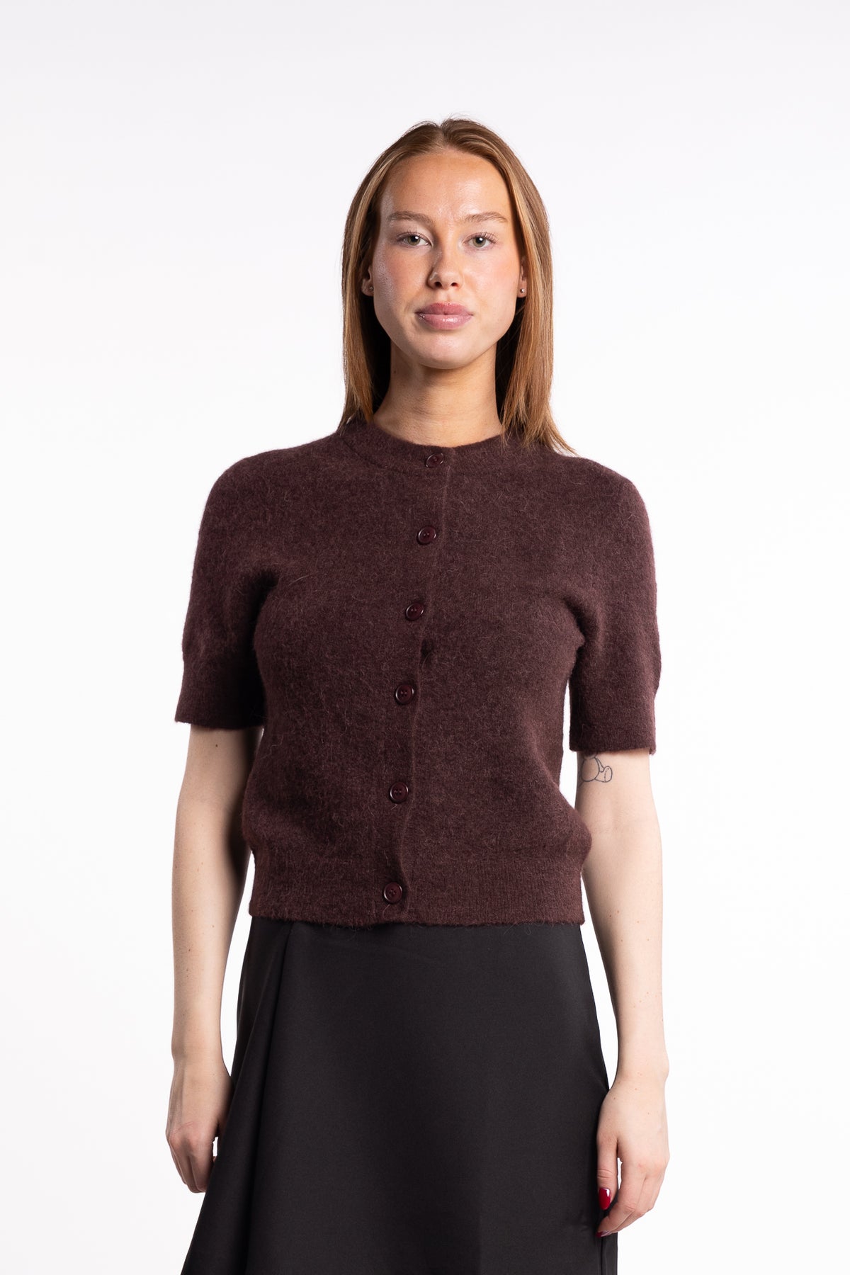 Sanoura SS Cardigan fra Samsøe Samsøe er en kortermet cardigan med rund hals og klassisk silhuett. Modellen har knappelukking foran og ribbestrikkede kanter i hals, ermer og fald for en myk og feminin finish. Den er laget i en elastisk ullblanding med alpakka og resirkulert polyamid som gir et lett, lunt og komfortabelt plagg – perfekt både alene eller over en topp eller kjole.