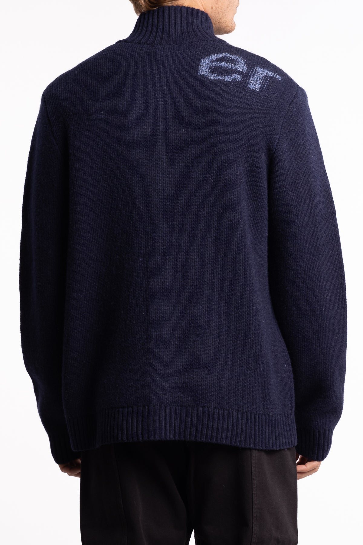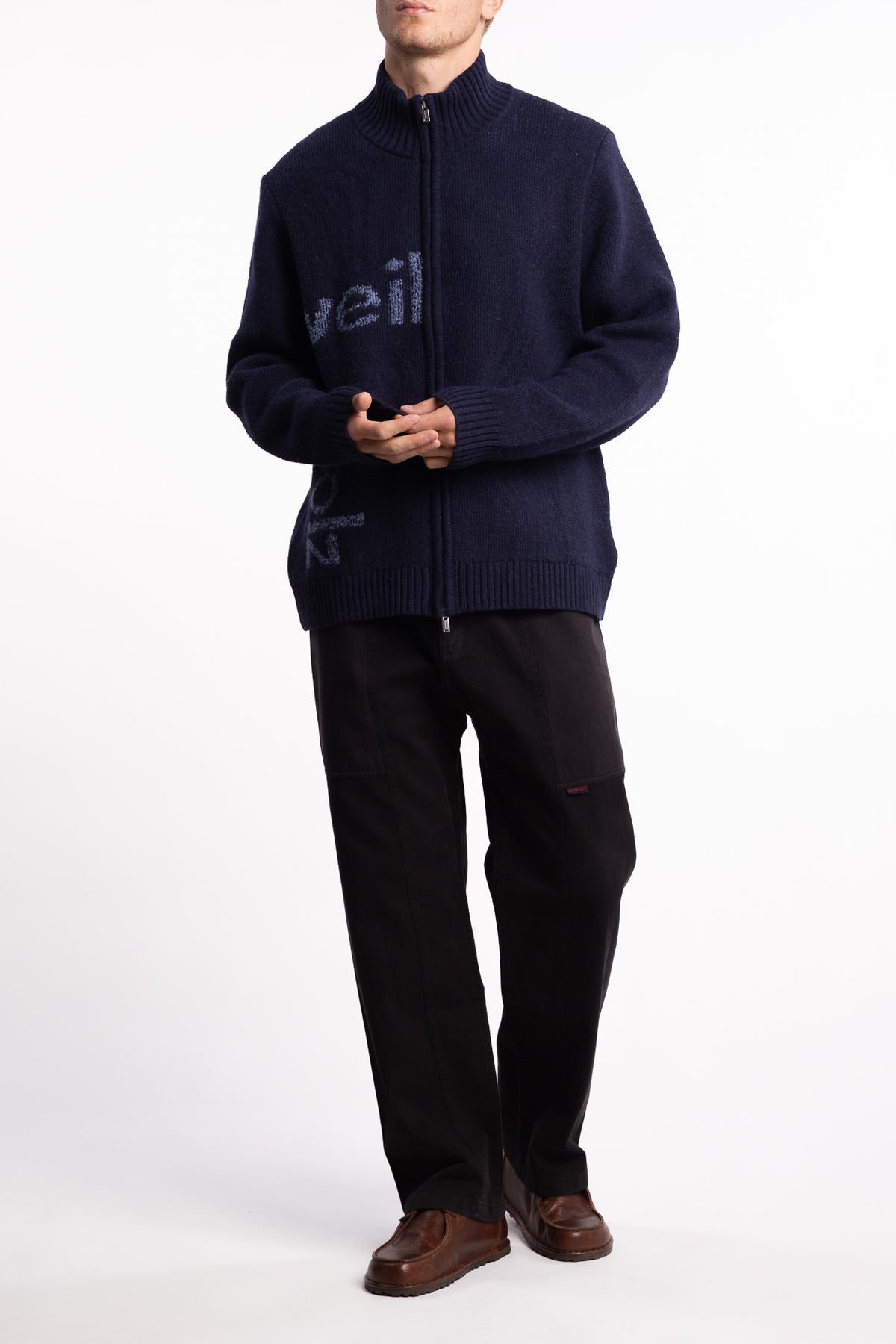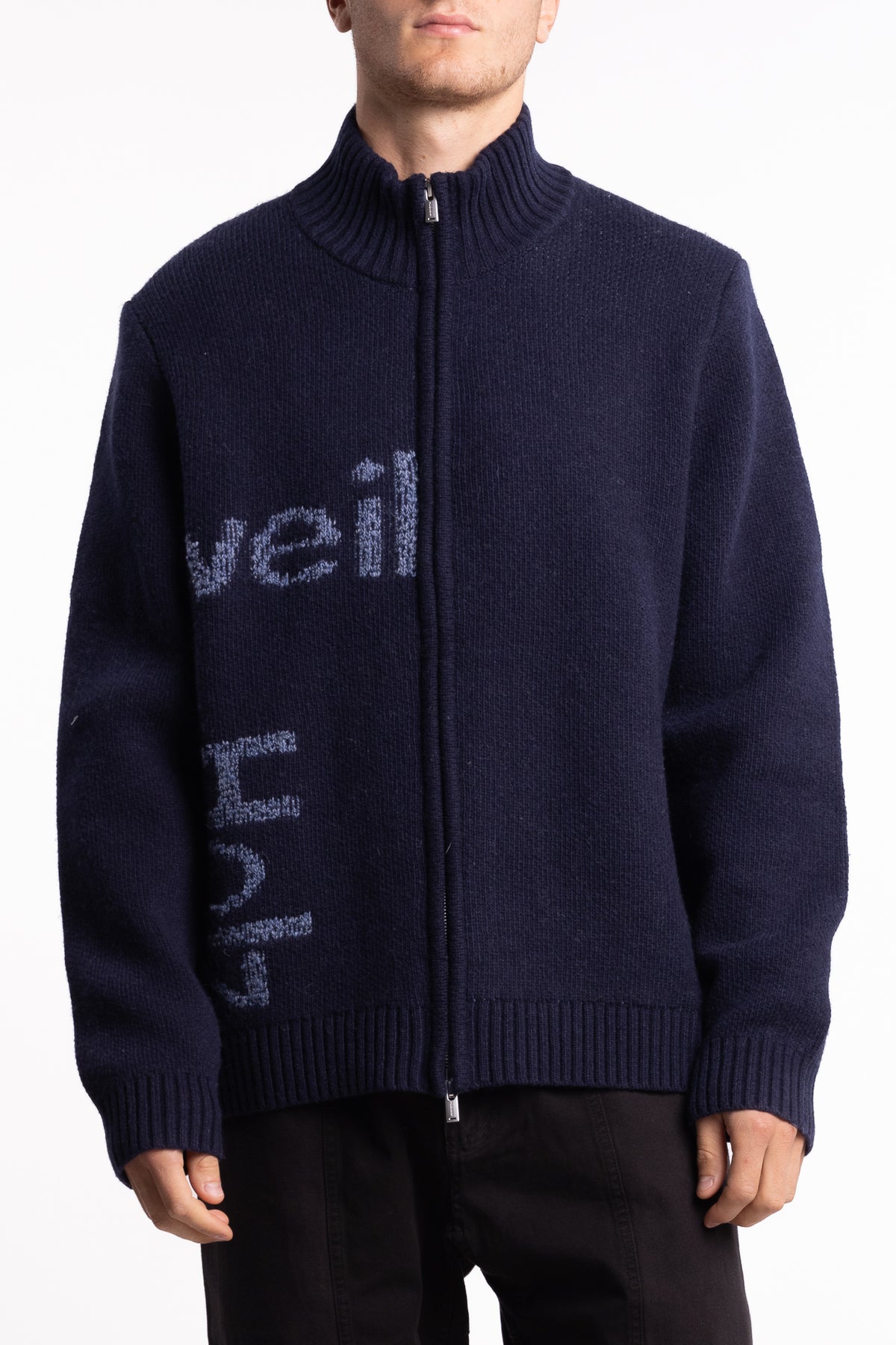 Cardigan med glidelås og jacquardvevd logomønster i horisontale og vertikale linjer. Modellen har avslappet passform, høy hals og ribbestrikkede kanter.
