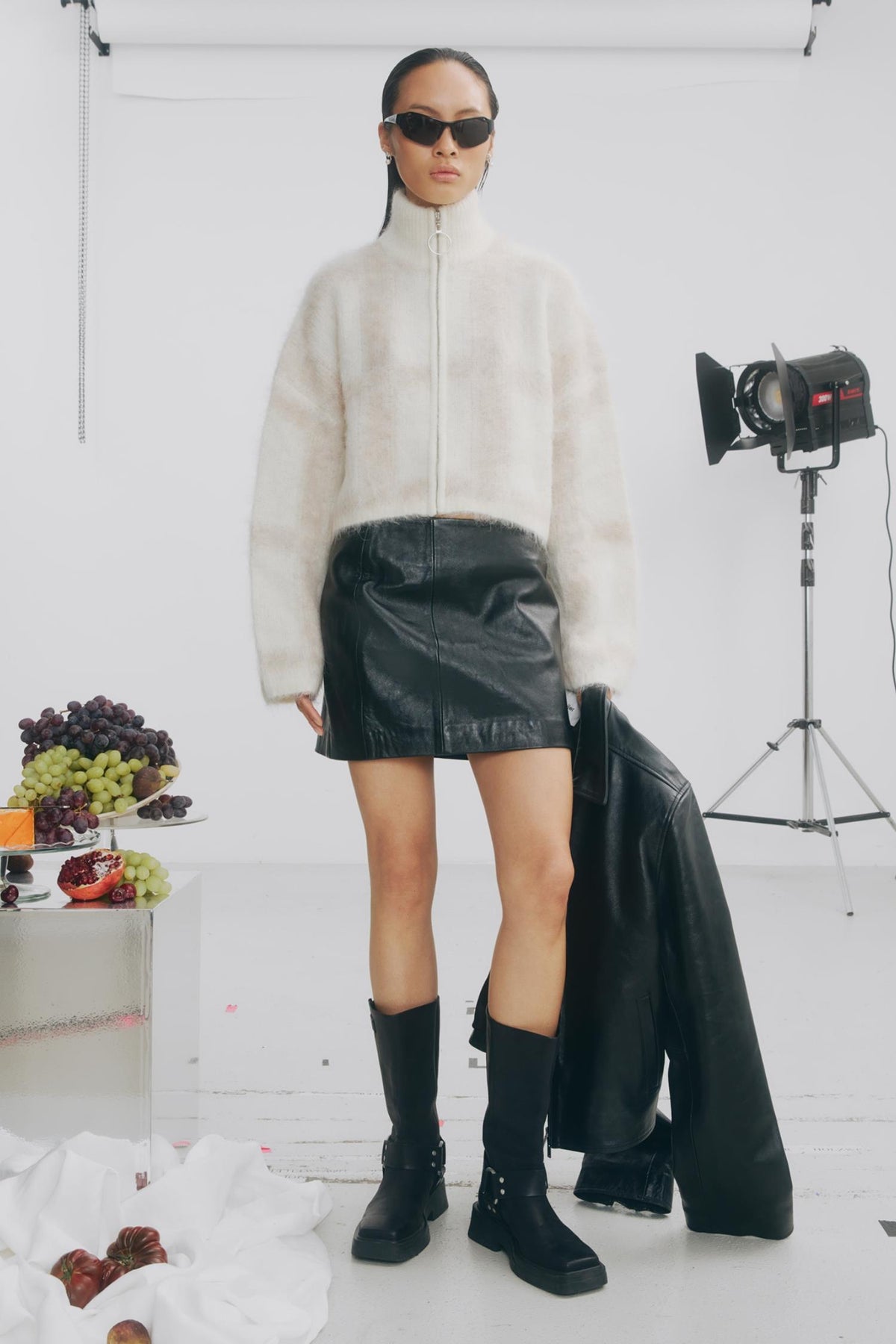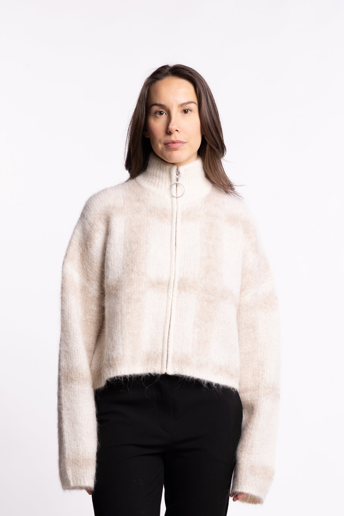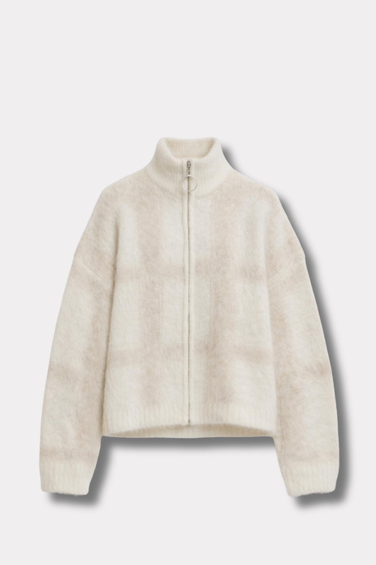 Den høye kragen og glidelåslukkingen i front gir et rent, nesten sporty uttrykk, balansert av det myke materialet. Et allsidig plagg som fungerer like godt til jeans og skinnskjørt som over en kjole på kjøligere dager.