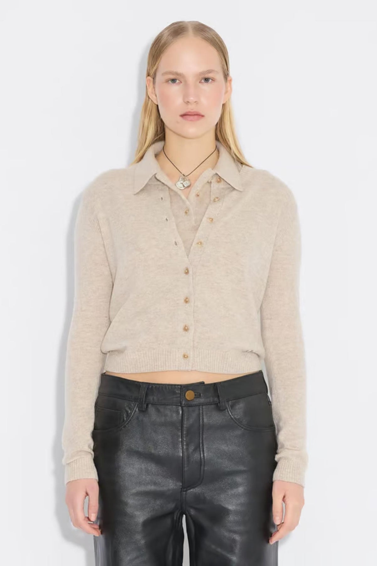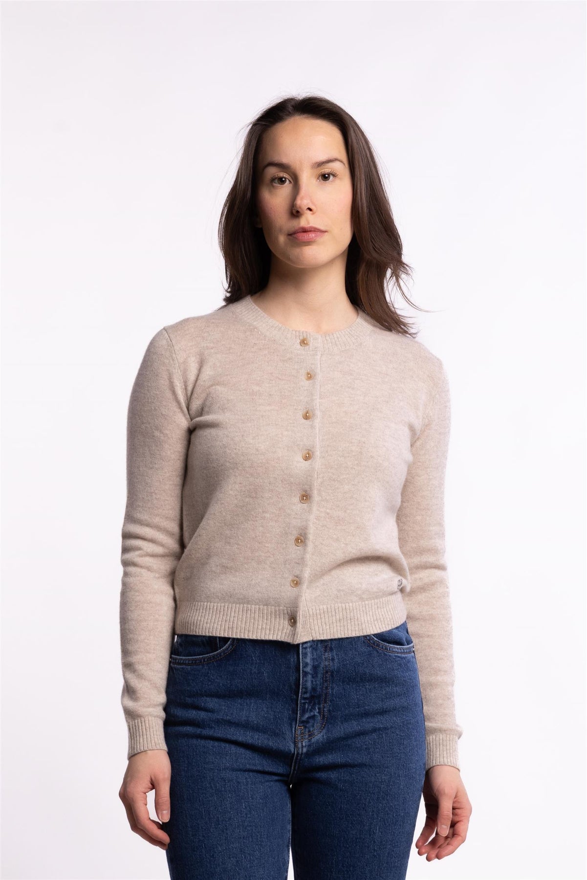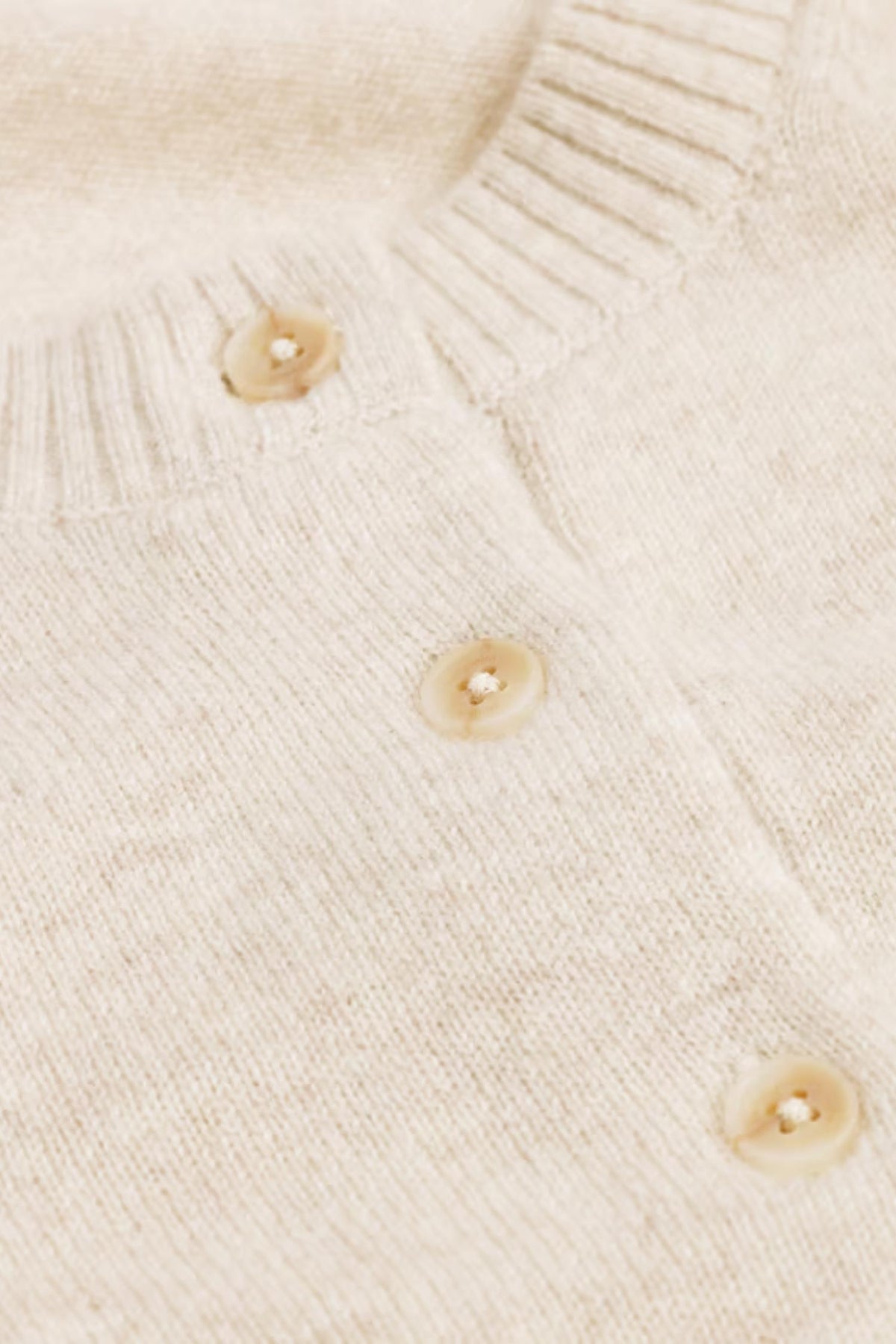 Cashmere Cardigan fra Holzweiler er en eksklusiv, cropped cardigan i 100 % kashmir med smal passform og elegante detaljer. Den er finstrikket med rund hals, knappelukking i front og ribbestrikkede kanter. Et avtakbart metallskilt med Holzweiler-logo over midjen tilfører en subtil signaturfinish. En tidløs investering i garderoben – like fin over kjoler som til jeans eller dressbukser.