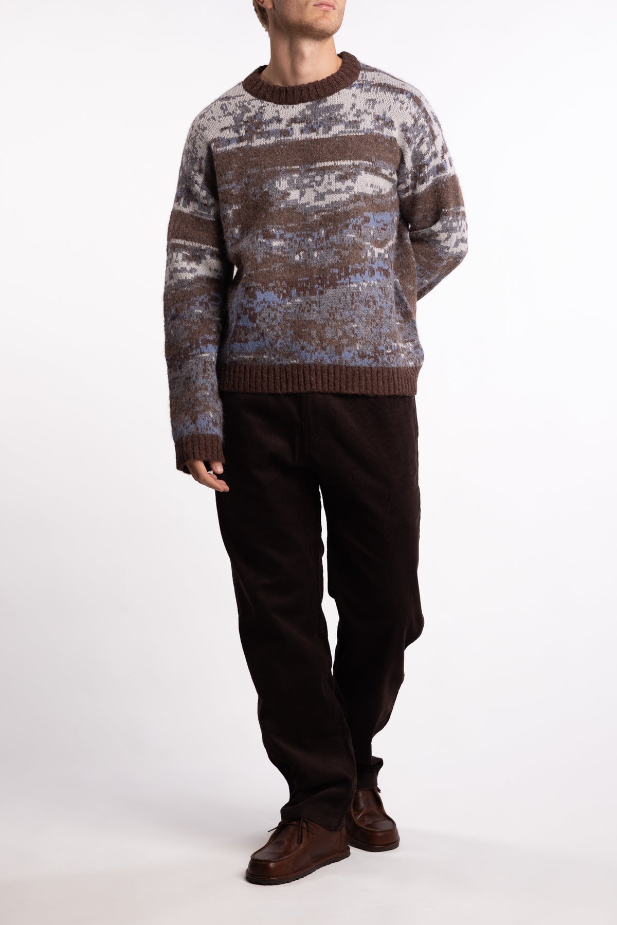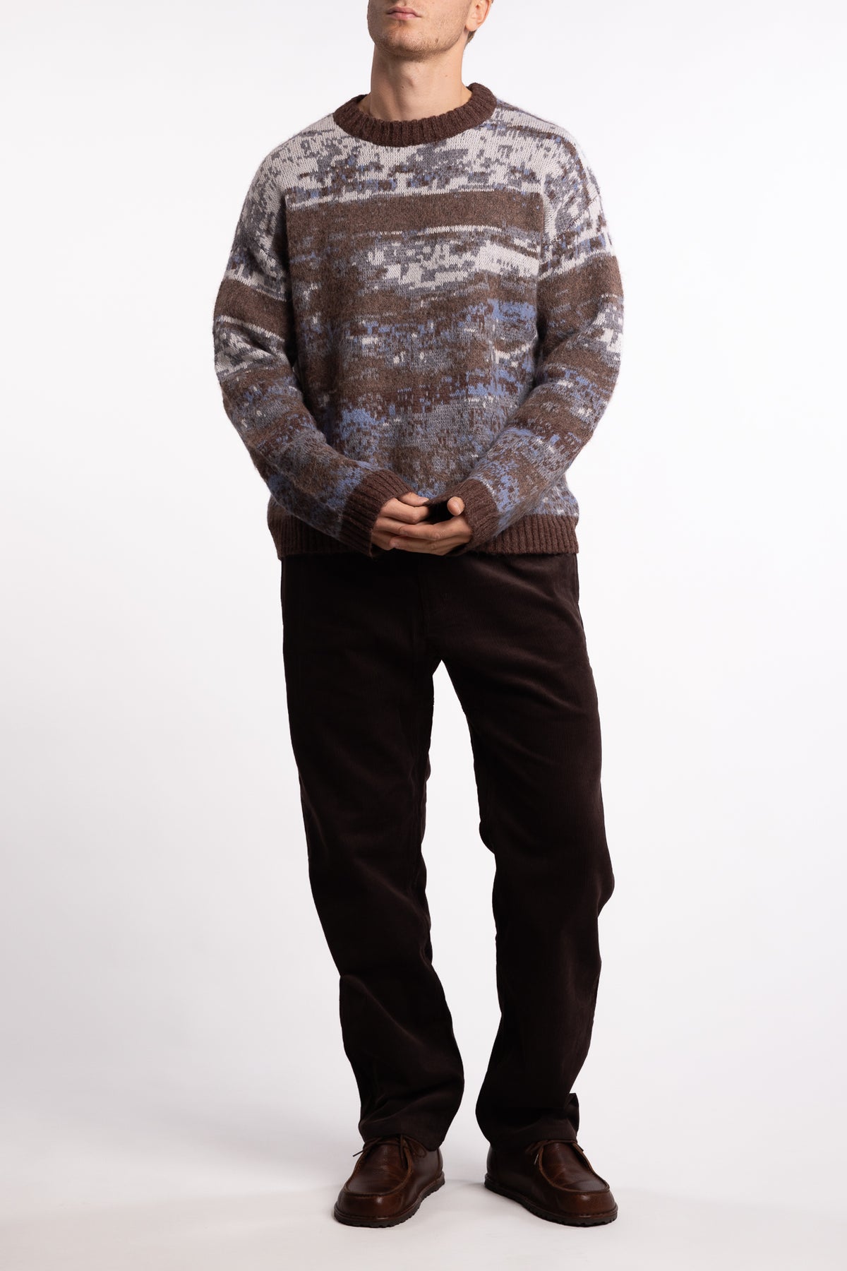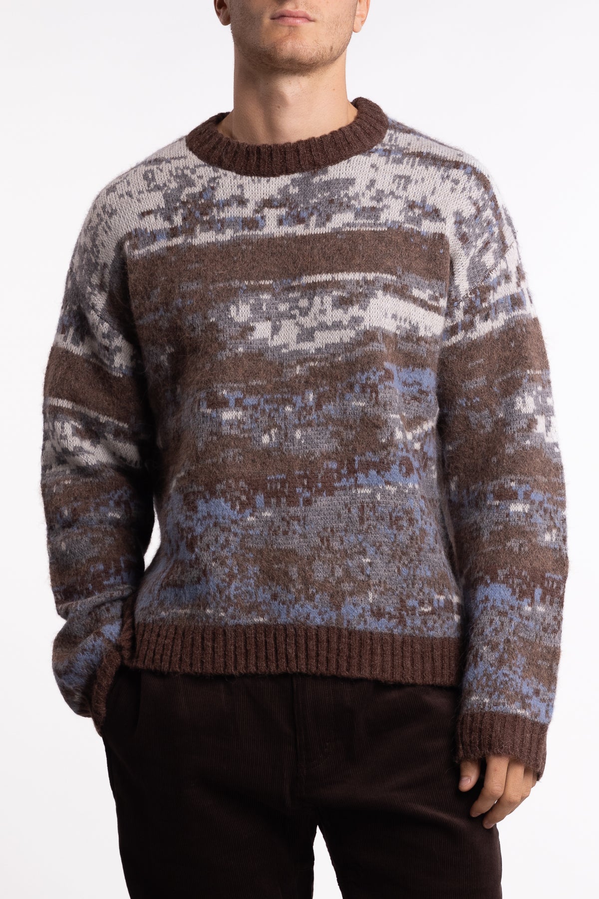 Strikket genser laget i en varm og behagelig ullblanding, designet i en oversized fasong. Genseren er dekorert med jacquardmønster som viser et snødekt fjellandskap, og fullføres med ribbestrikkede kanter og klassisk crew neck.