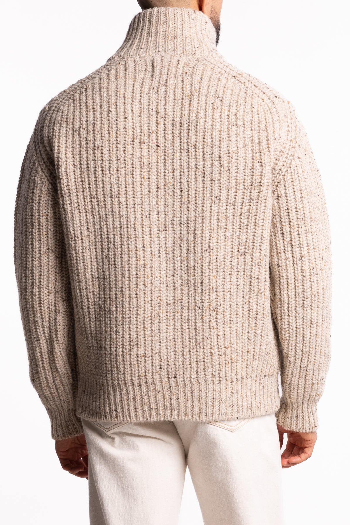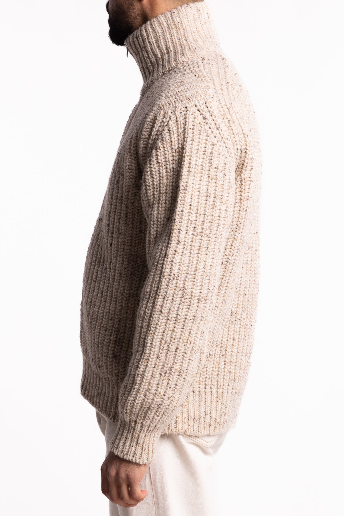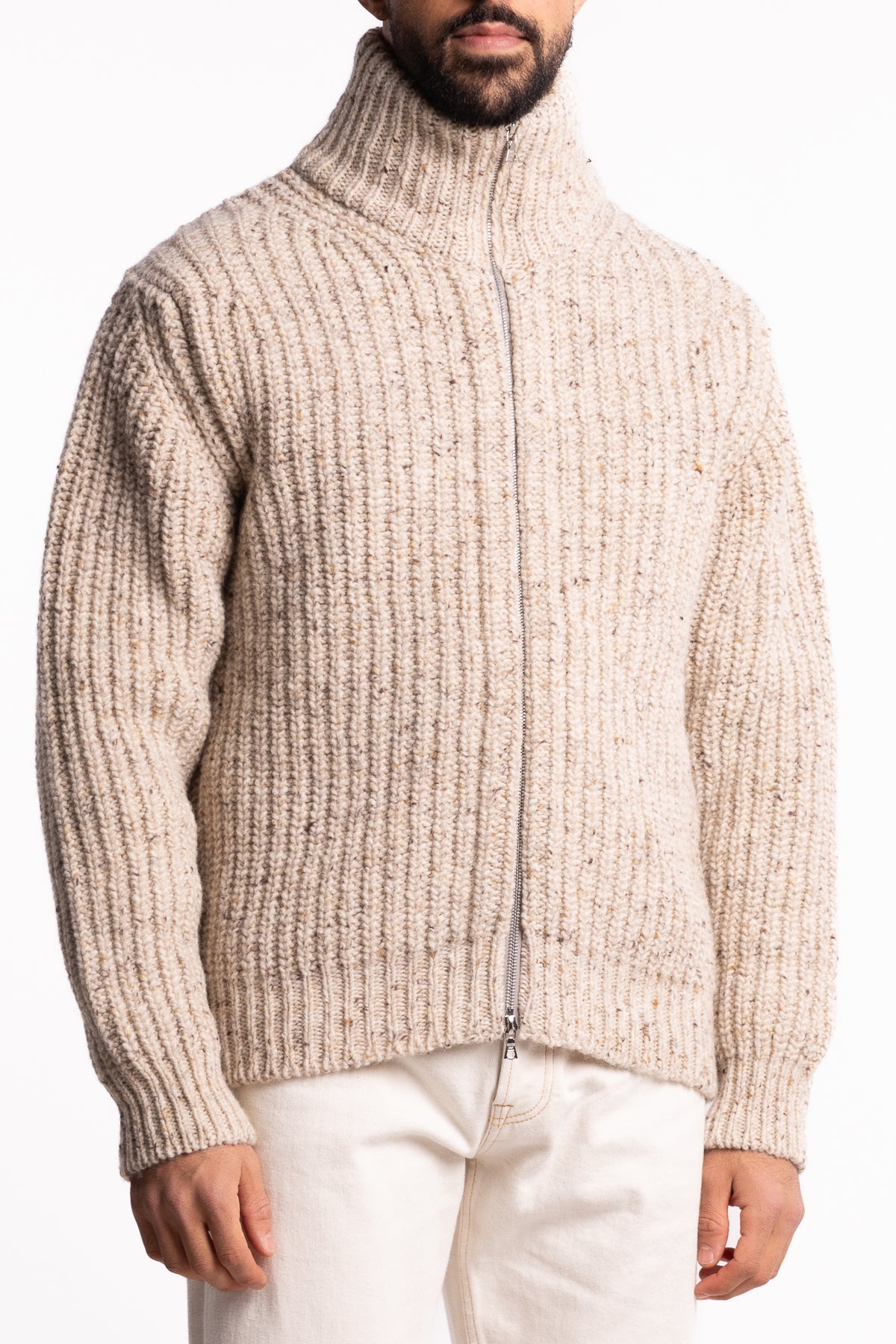 Ribbestrikket cardigan fra Howlin’, laget i Skottland av en eksklusiv, tykk tweedgarn med fargede fiberflekker som gir plagget en levende tekstur. Modellen har en høy krage, toveis glidelås fra Riri og ribbestrikkede avslutninger. Et solid og håndferdiget plagg med balansert tyngde og struktur.