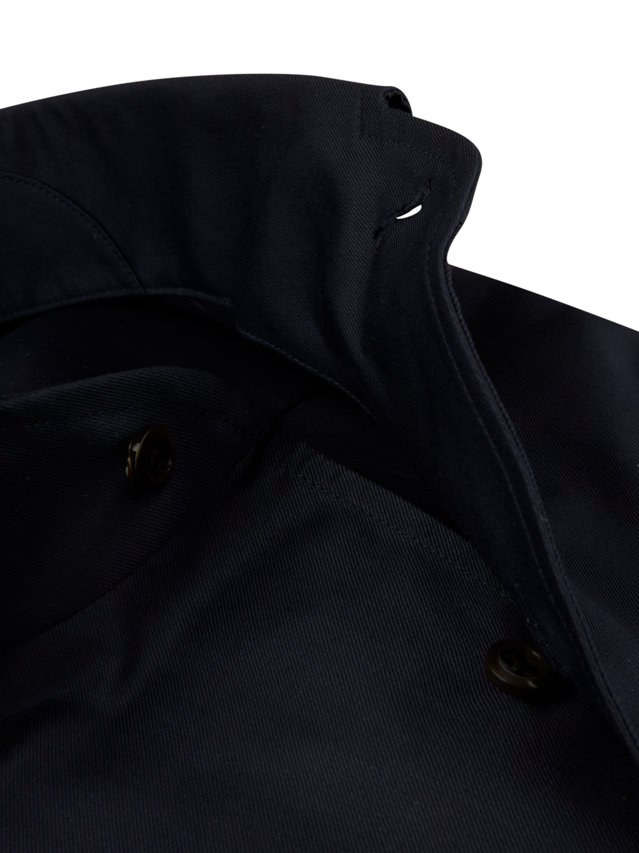 En klassisk mørkeblå skjorte laget av twofold super cotton for en glatt og slitesterk kvalitet. Skjorten er skåret i en regulær passform og designet med moderat cut away-krage og enkle mansjetter for et raffinert uttrykk. Perlemorsknapper tilfører et diskret, elegant preg.