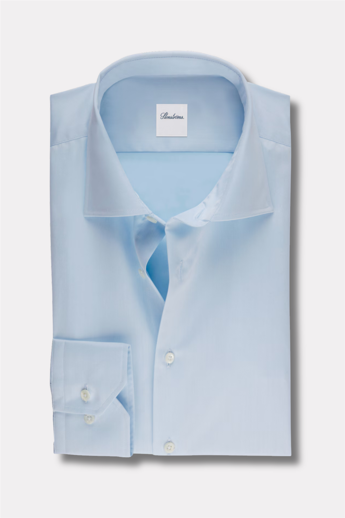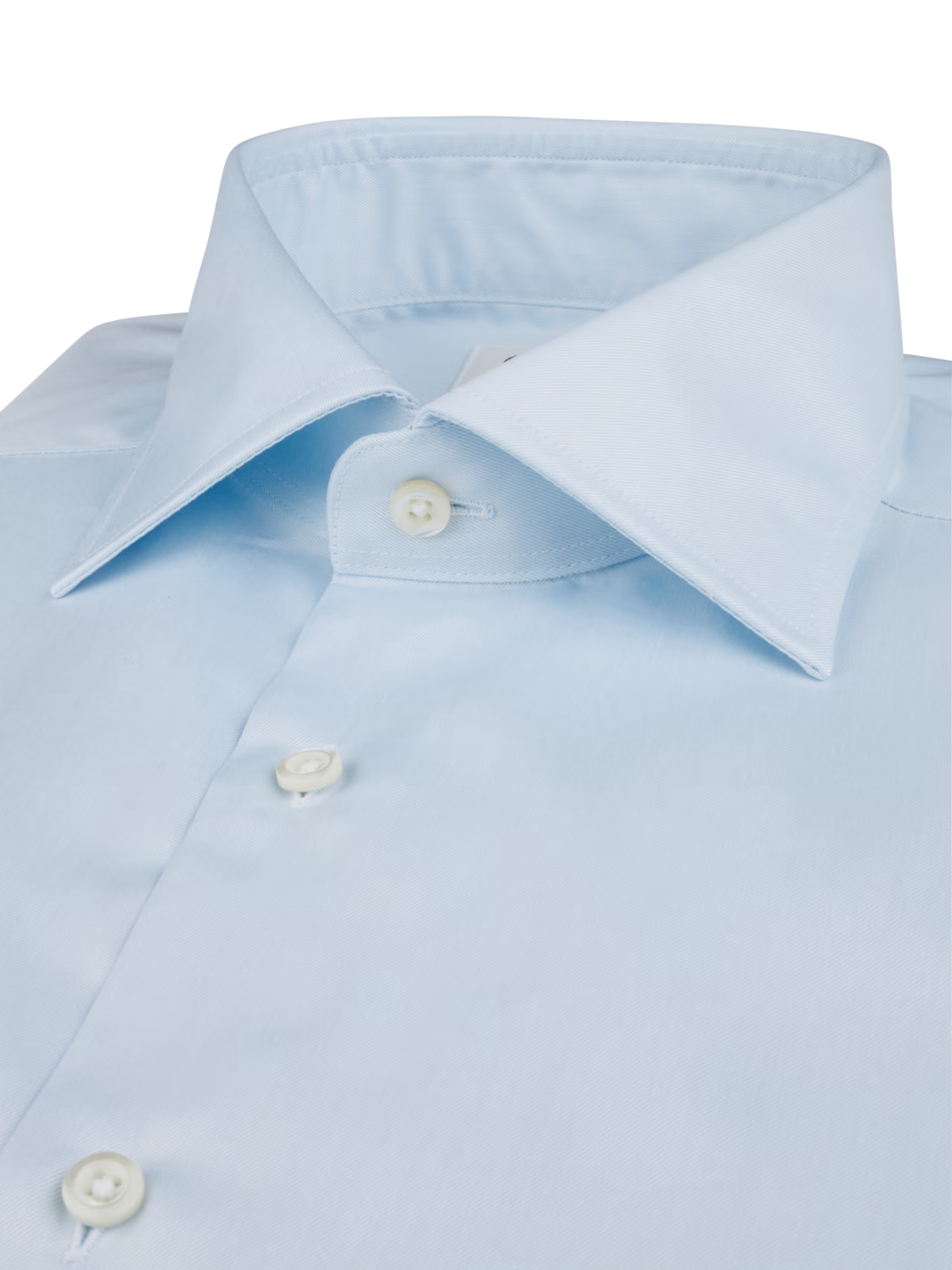 En klassisk lyseblå skjorte laget av twofold super cotton for en glatt og slitesterk kvalitet. Skjorten er skåret i en slank passform og designet med moderat cut away-krage og enkle mansjetter for et raffinert uttrykk. Perlemorsknapper tilfører et diskret, elegant preg.