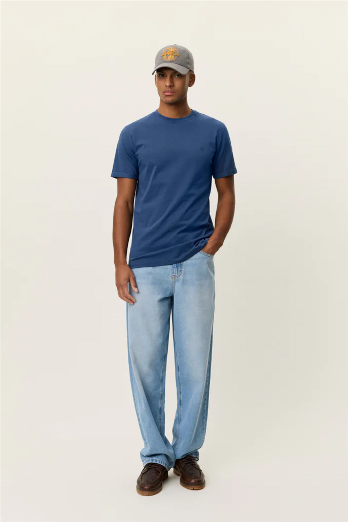 Nørregaard Contrast T-shirt Dark Denim Blue er en slim fit t-skjorte laget i myk, økologisk bomull. Med oppbrettede ermer og et lite kontrastbrodert logo på brystet, er den et rent og tidløst basisplagg som passer til daglig bruk.