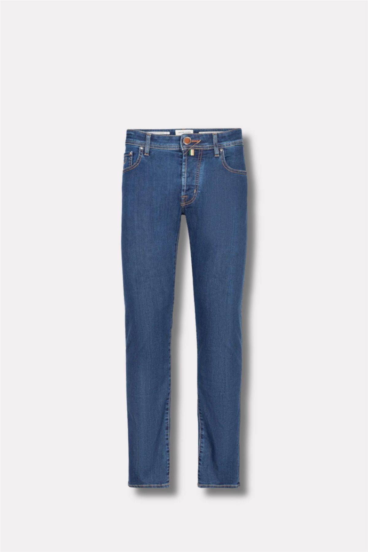Eksklusive jeans fra Jacob Cohën i modellen Bard, produsert for hånd i Italia. Buksen er laget i en komfortabel og fleksibel bomullsblanding med stretch, som gir høy komfort og et elegant fall. Den mørkeblå vasken gjør modellen tidløs og allsidig, perfekt både til skjorte og blazer eller mer avslappet med strikk. Klassiske Jacob Cohën-detaljer som skinnpatch i livet, knappegylf og medfølgende vevd tørkle understreker merkets kompromissløse fokus på kvalitet og luksus. Som alltid er buksen parfymert med Jacob Cohëns karakteristiske signaturduft.