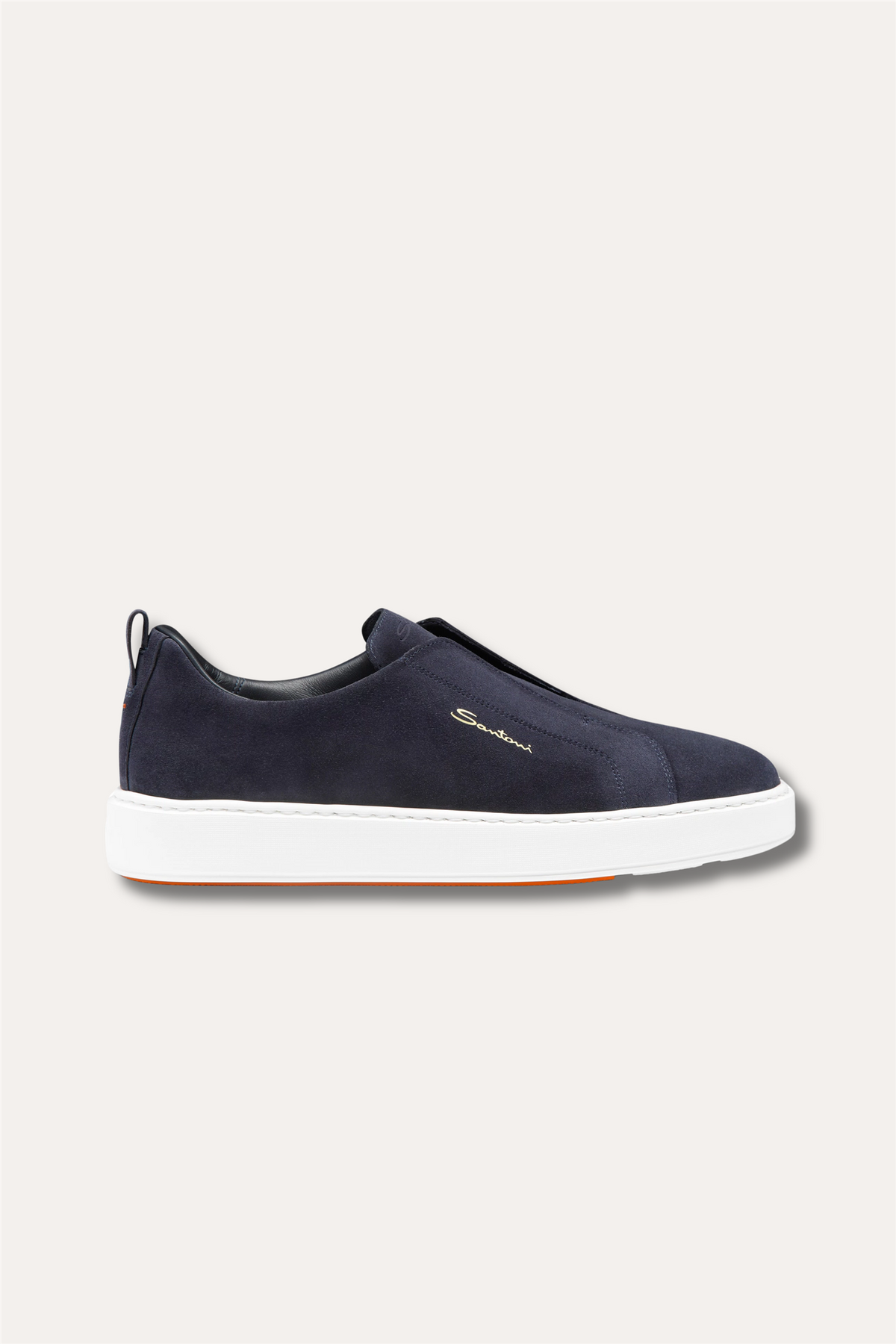 Santoni Slip-On Sneaker i blå semsket skinn kombinerer lett eleganse med luksuriøse materialer og gjennomført håndverk. Den myke semskede overdelen gir et eksklusivt uttrykk, mens slip-on-designet og praktisk hempe bak gjør skoen enkel å ta av og på. En fleksibel gummiert cupsole sørger for komfort hele dagen, og den ikoniske oransje double-buckle-detaljen på yttersålen setter et karakteristisk Santoni-preg. Produsert i Italia.