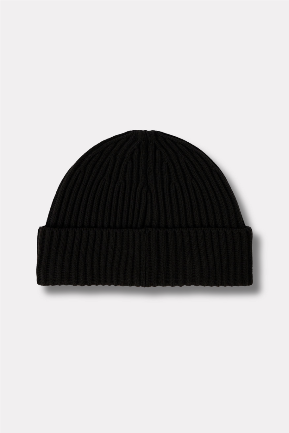 Ribbestrikket lue i 100 % jomfruull med oppbrett og Stone Island-kompasslogo på fronten. Strikket i gauge 7.