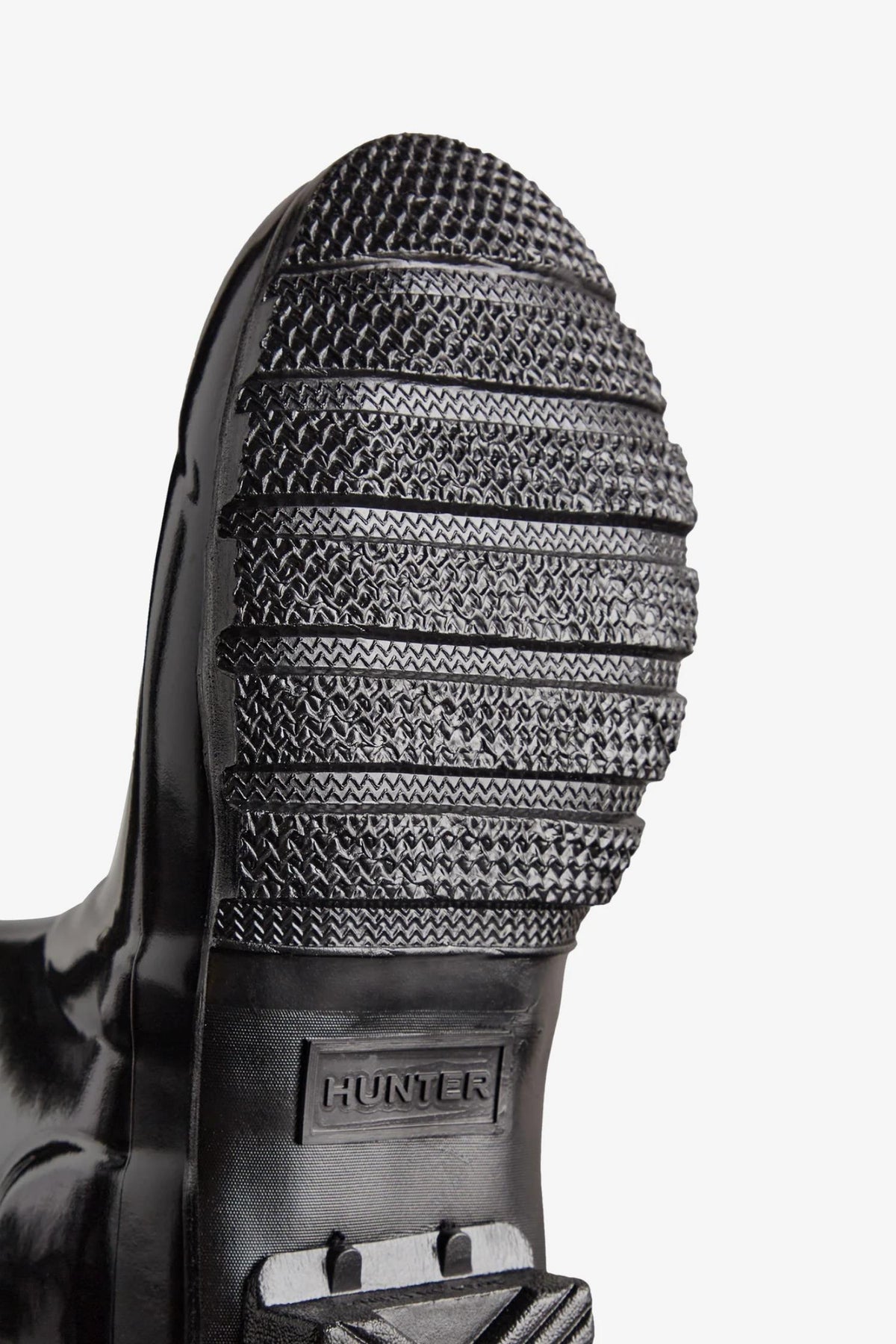 Women's Original Tall Gloss Boots fra Hunter har vært et ikon siden den først ble introdusert i 1956. Perfekt for våte værforhold, støvlene er laget av naturlig gummi og består av 28 håndskårne deler som settes sammen over tre dager på en spesiallaget aluminiumslest, før de vulkaniseres for optimal beskyttelse. Med Hunter Original-mønster på sålen og komfortabelt polyesterfôr, er disse høye sorte støvlene et essensielt valg for regnværsdager.