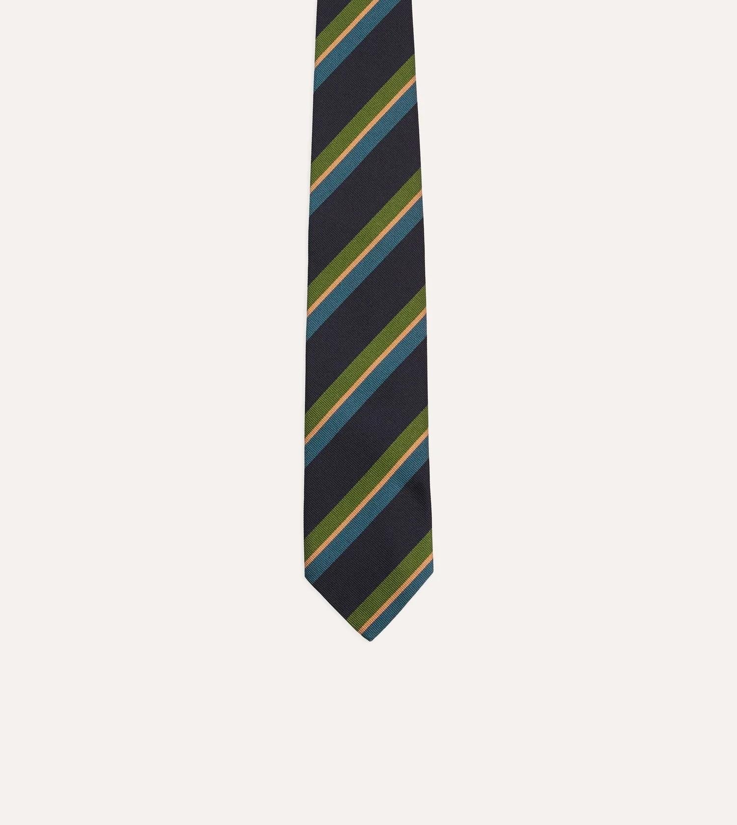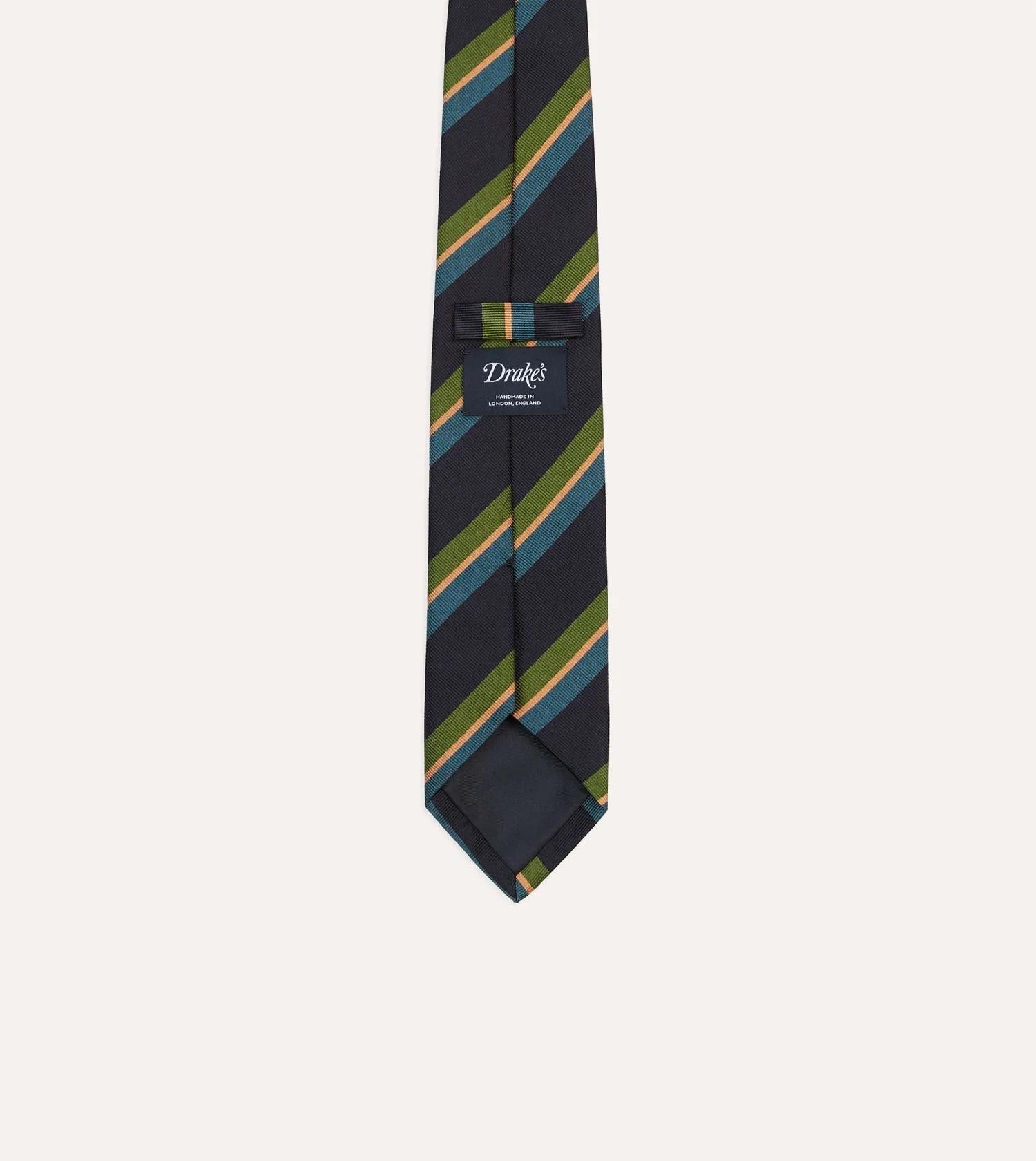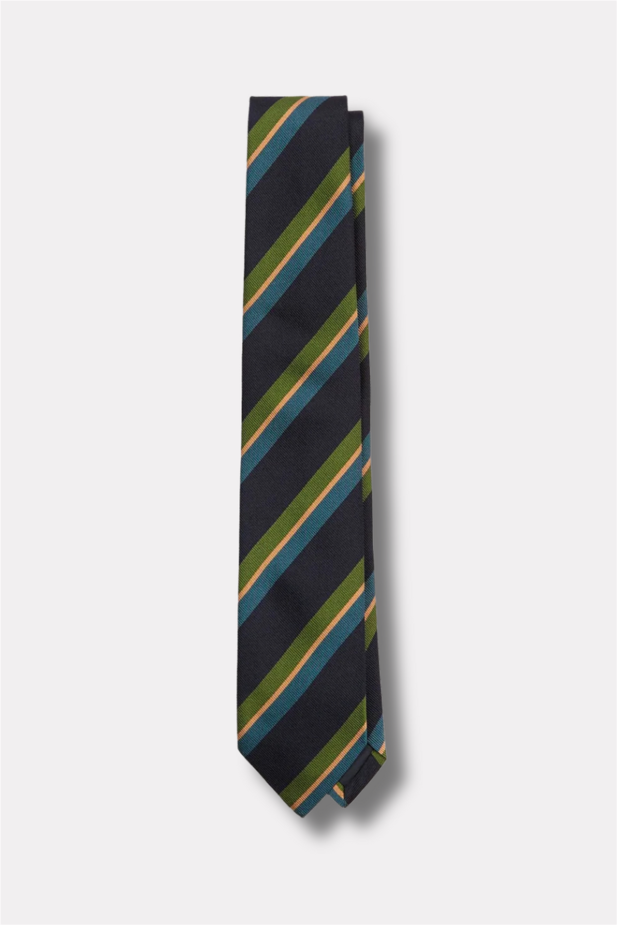En klassisk stripet silkeslips fra Drake’s – et tidløst tilbehør som kombinerer tradisjon og moderne eleganse. Håndlaget i London av ren silke med navy-detaljer, og en raffinert struktur som gir et eksklusivt uttrykk.