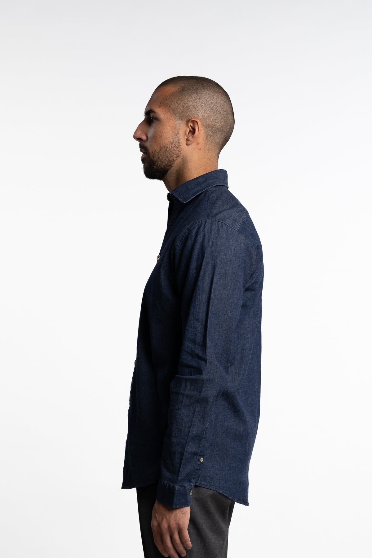 Myk skjorte med denim-look, laget av en bomullsblanding med stretch for ekstra komfort og bevegelsesfrihet. Skjorten har en klassisk krage og en liten logopatch nederst til venstre.