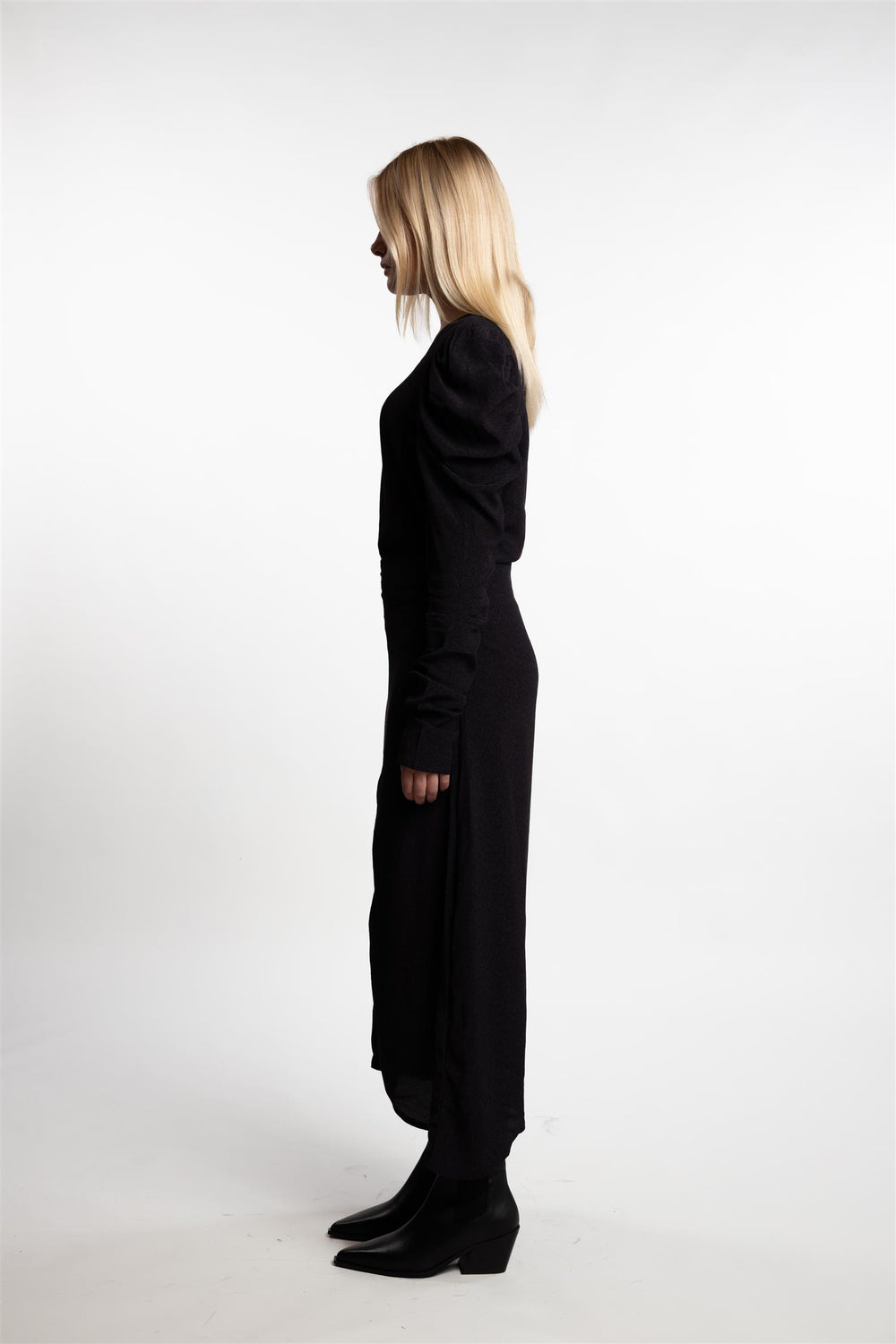 - Passform: Midikjole med en flatterende asymmetrisk A-formet skjørt og puffermer med rynkedetaljer langs overarmen. Kjolen har lange ermer, en myk V-formet utringning, og en glidelås i siden.