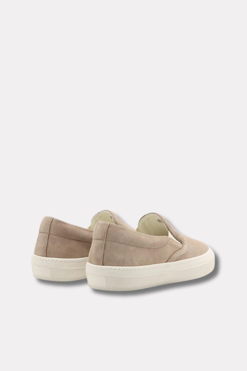 Kit Slip-On fra Garment project er designet for å kombinere komfort og et tidløst utseende, samtidig som den beholder et preg av gate stil. Slip-on versjonen har et minimalistisk design som passer til det meste i hverdagsgarderoben. Skoen er laget av premium sertifisert semsket skinn og sydd på en gummicupsåle med kontrastfarget bunn. Den er designet med en myk polstret hælkappe og har fôr i kalveskinn.