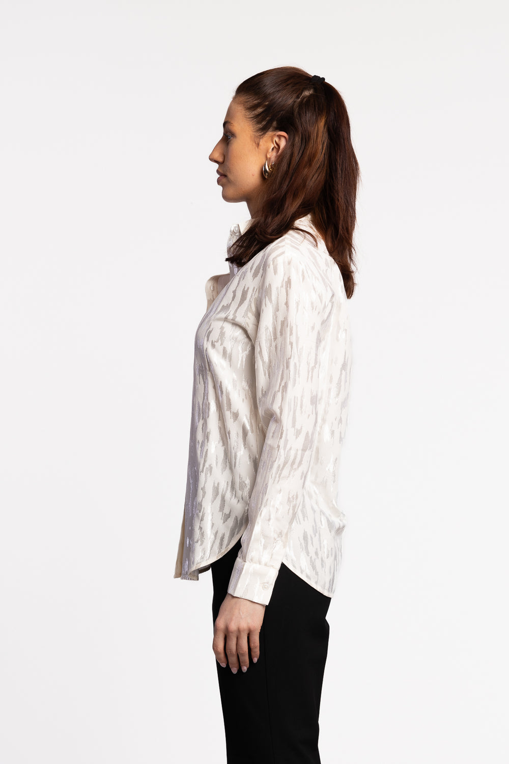Madisoni Shirt 15042 fra Samsøe Samsøe er en elegant slim fit og langermet skjorte med delikate, senkede skuldre. Spiss krage, knappestolpe foran og på ermene. Buete sidesømmer og avrundet kant nederst. Laget av et tonal teksturert jacquard-stoff med en blanding av viskose og bomull.