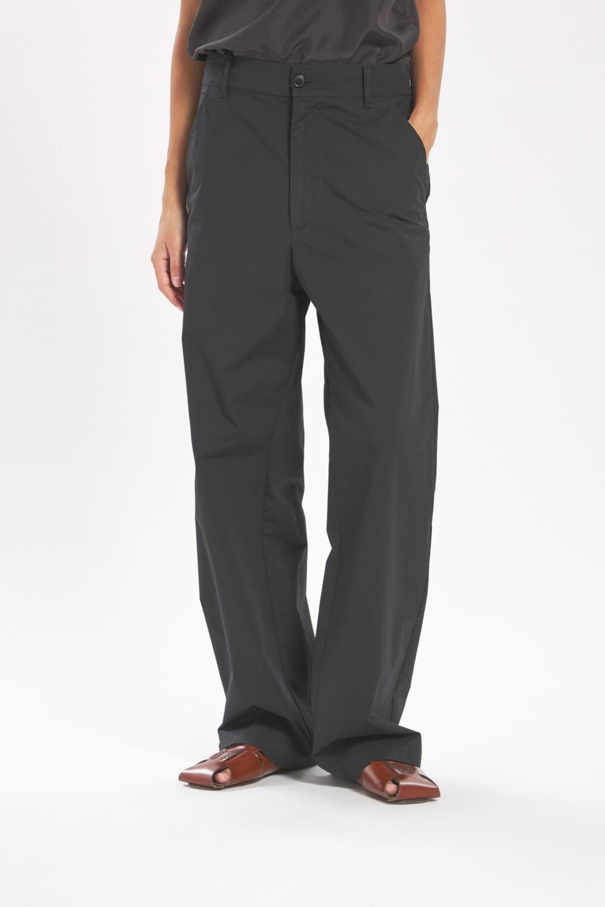 Buksen har medium livhøyde og en vid, rett silhuett med regulær benlengde. Fronten er flat og ren med beltehemper, mens delvis elastisk linning bak gir fleksibilitet og komfort uten at uttrykket mister presisjon. To skrålommer i front og to vinklete baklommer balanserer den minimalistiske konstruksjonen.