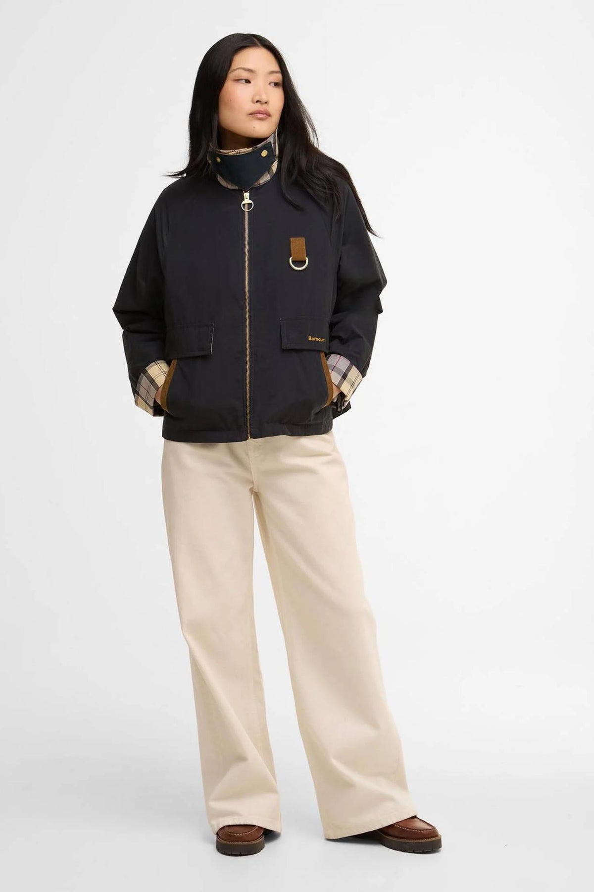 Jakken er showerproof og laget i en slitesterk bomulls- og polyamidblanding som gir lett beskyttelse mot regn. Den har trykknappede klaffelommer med sideinngang, D-ring på brystet og en praktisk konstruksjon som kombinerer funksjon og stil. Lengden på 62,2 cm gir en kort og boxy fasong som fungerer godt over både strikk og skjorte.