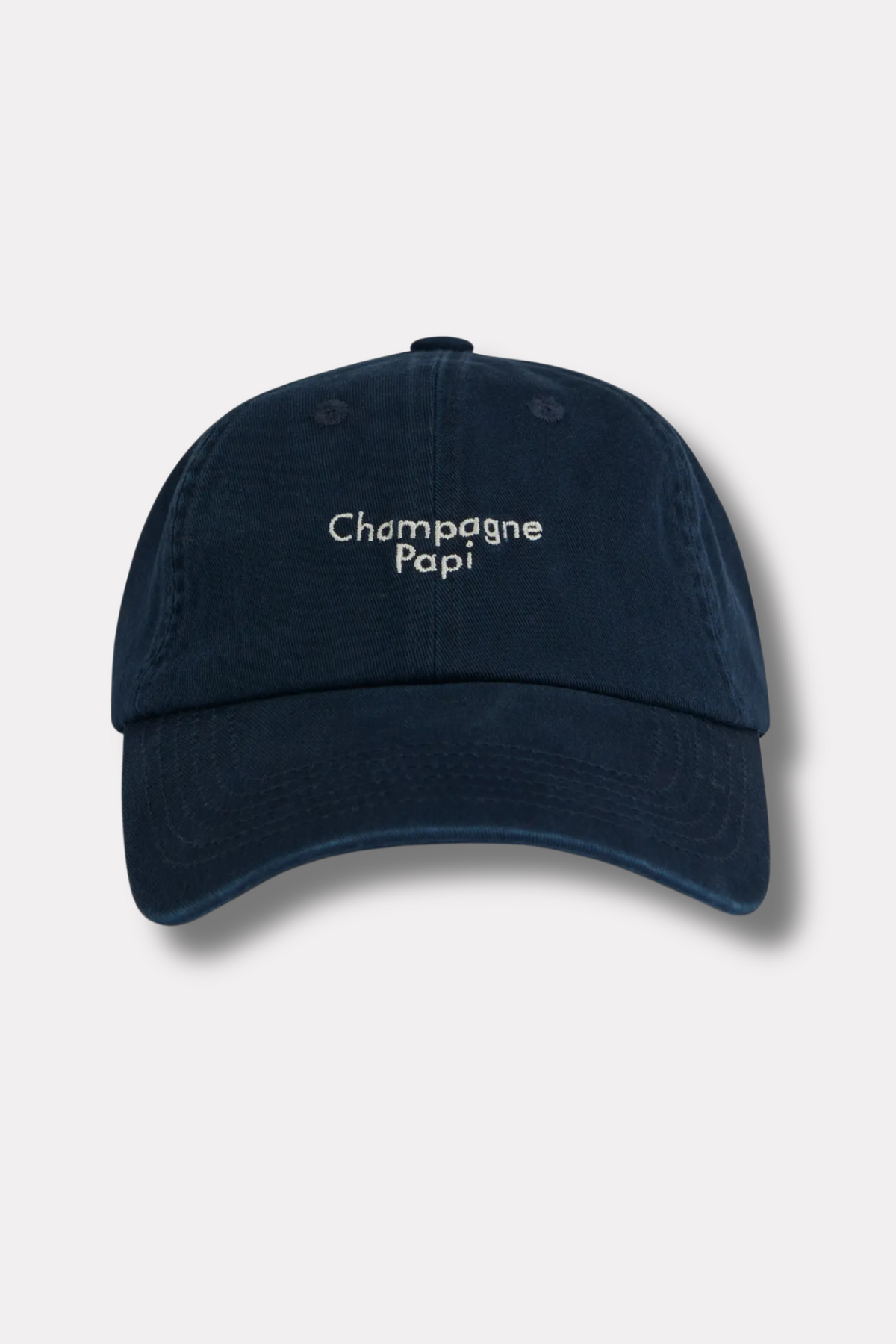 Champagne Papi Dad Cap fra Pica Pica i navy bomull med hvit brodert tekst foran. Ustrukturert 6-panelsdesign med buet brem og justerbar stropp bak.