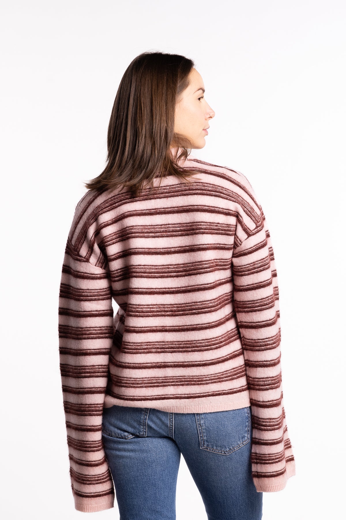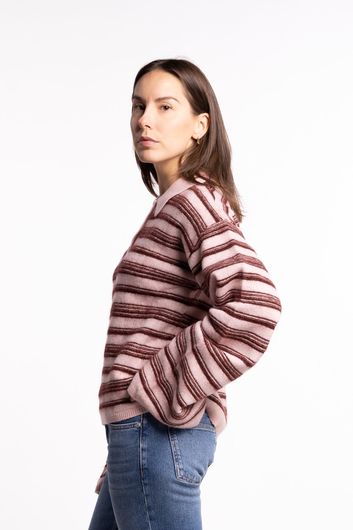 Olivia Wool Polo fra Holzweiler er en elegant og samtidig avslappet strikk som kombinerer den klassiske polo-silhuetten med et moderne uttrykk. Genseren har brede striper i myk rosatonet palett med vinrøde kontraster, og feminine klokkeermer som gir plagget en sofistikert vri.