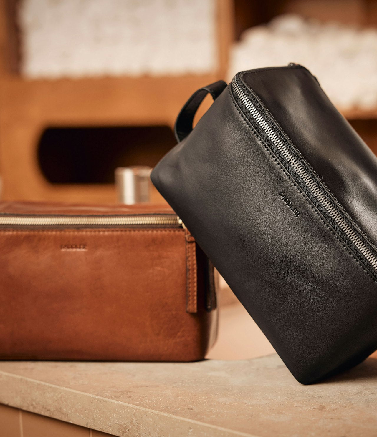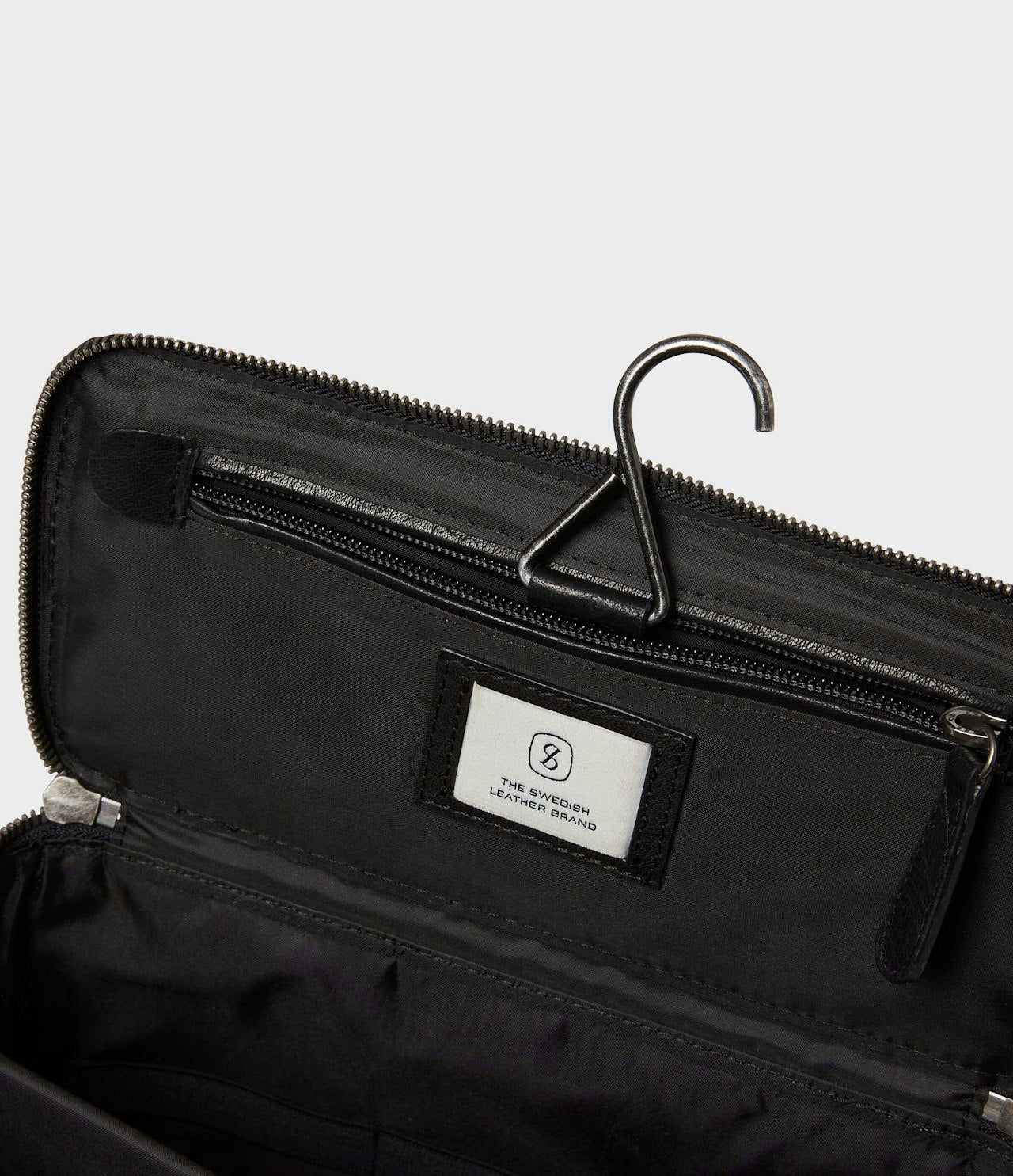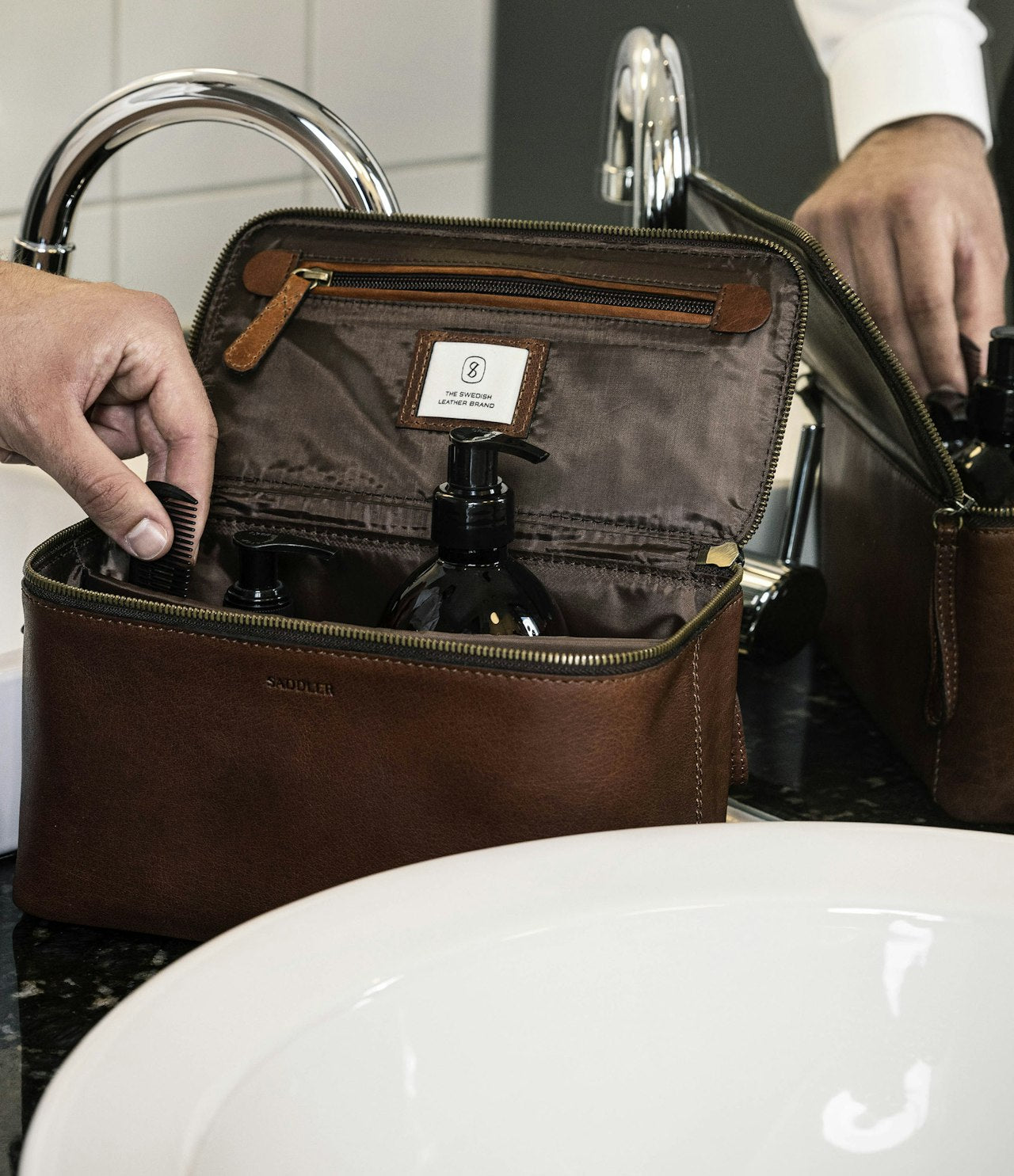 Toalettmappe Barolo fra Saddler er en elegant og romslig toalettmappe laget av fullnarvet bøffelskinn med en slitesterk overflate som eldes vakkert over tid. Innsiden har en praktisk skillevegg, tre elastiske stropper for organisering og en glidelåslomme under lokket.