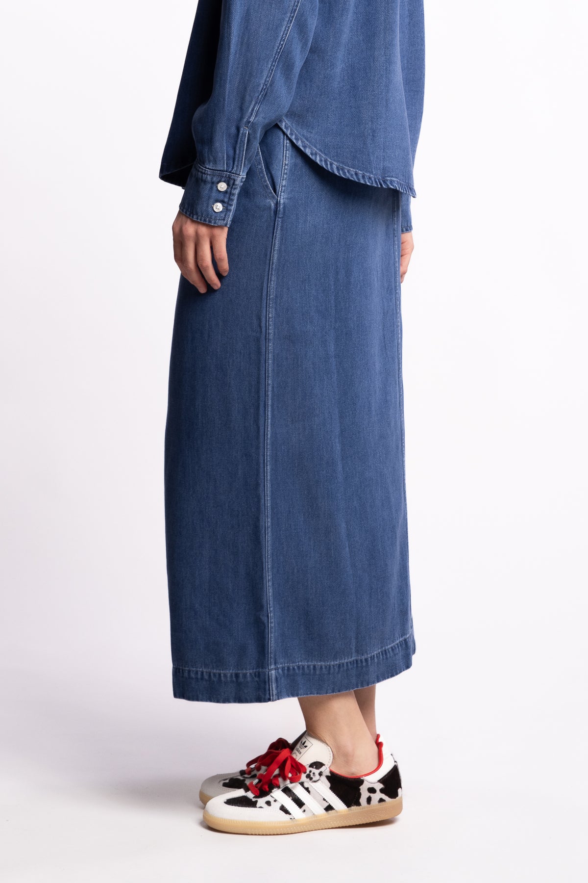 Satove Skirt 15645 – Medium Denim Blue fra Samsøe Samsøe er et midi denimskjørt med rett passform og et minimalistisk uttrykk. Skjørtet er laget i 100 % TENCEL™ Lyocell, som gir en myk, lett og behagelig kvalitet med et elegant fall.