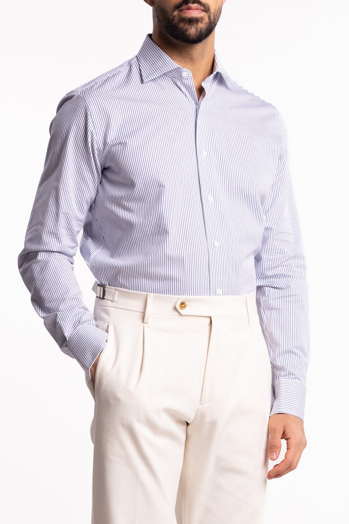 En klassisk skjorte fra Onesto, laget i myk bomull med smale blå striper på hvit bunn. Skjorten har en tidløs og elegant stil som passer like godt til dress som til et mer avslappet antrekk.