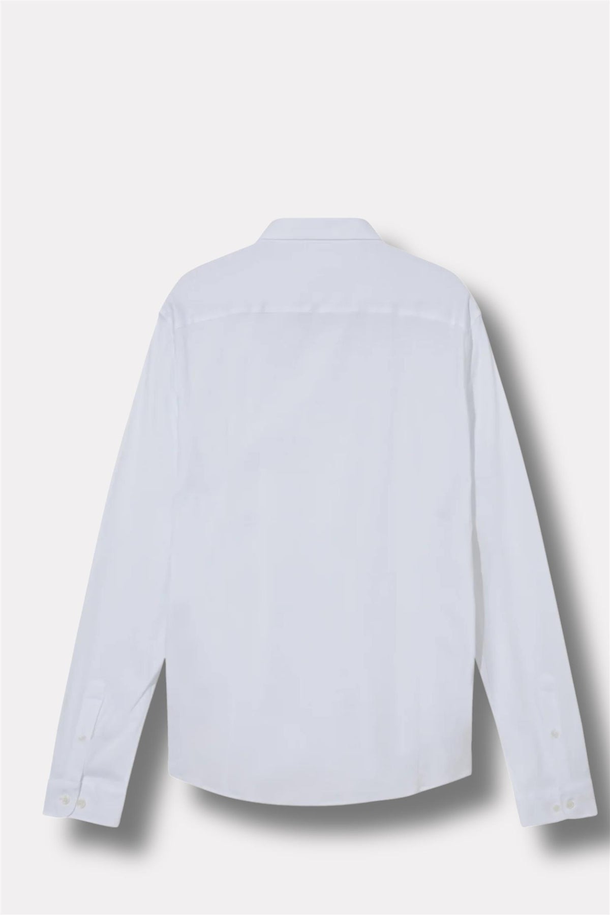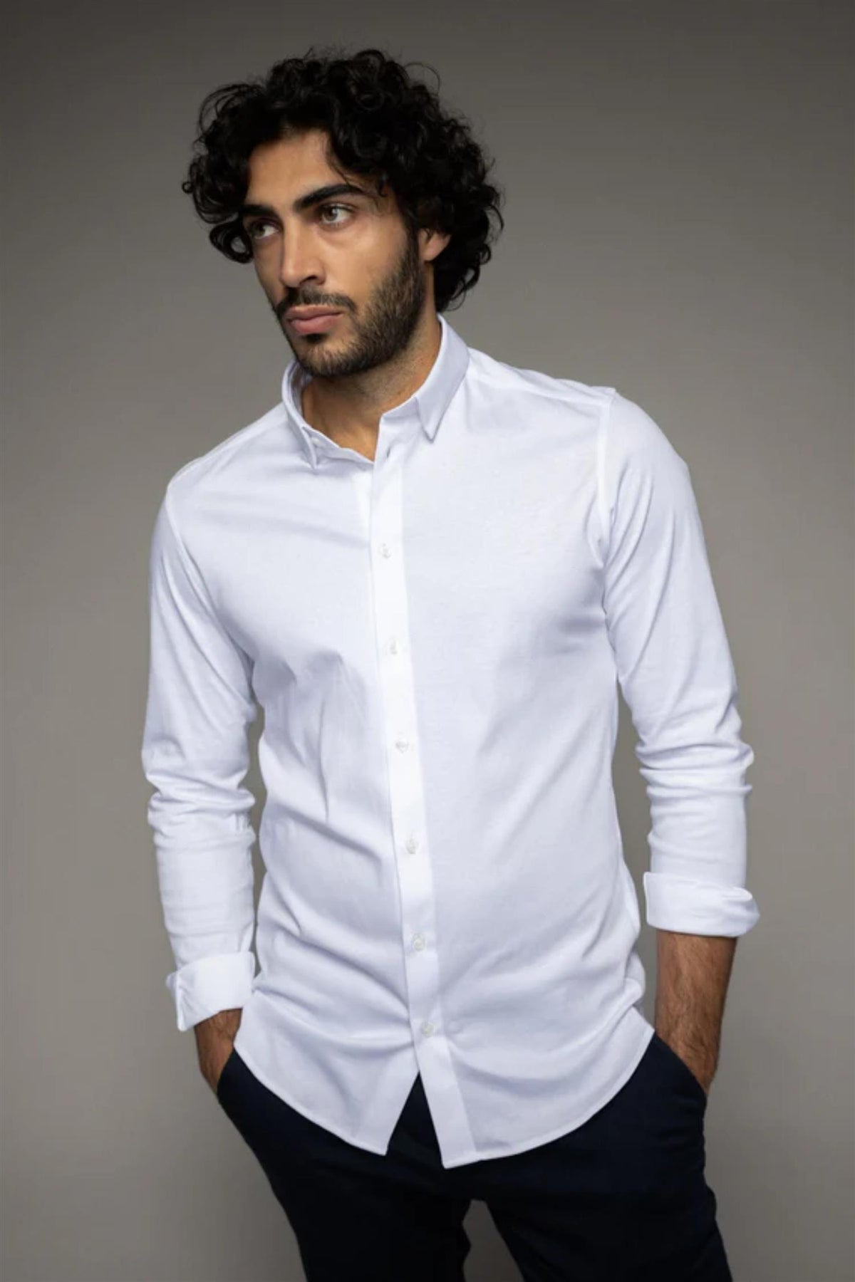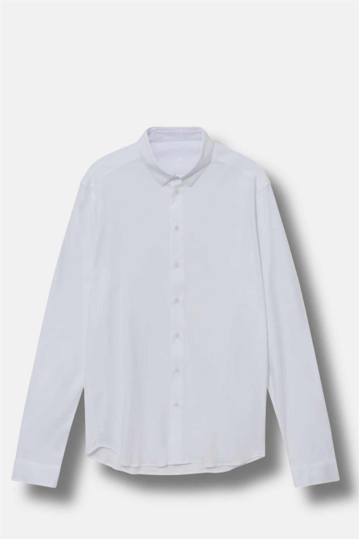 Designet med en slankere passform for et mer tilpasset uttrykk. Skjorten har knappestolpe foran, justerbare mansjetter og en skjult knapp-ned krage som gir et rent og polert utseende. Den er laget av et dobbeltstrikket jerseystoff som gir ekstra styrke, elastisitet og holdbarhet sammenlignet med vanlig jersey. Materialet er dobbelt mercerisert for en glatt og luksuriøs overflate.
