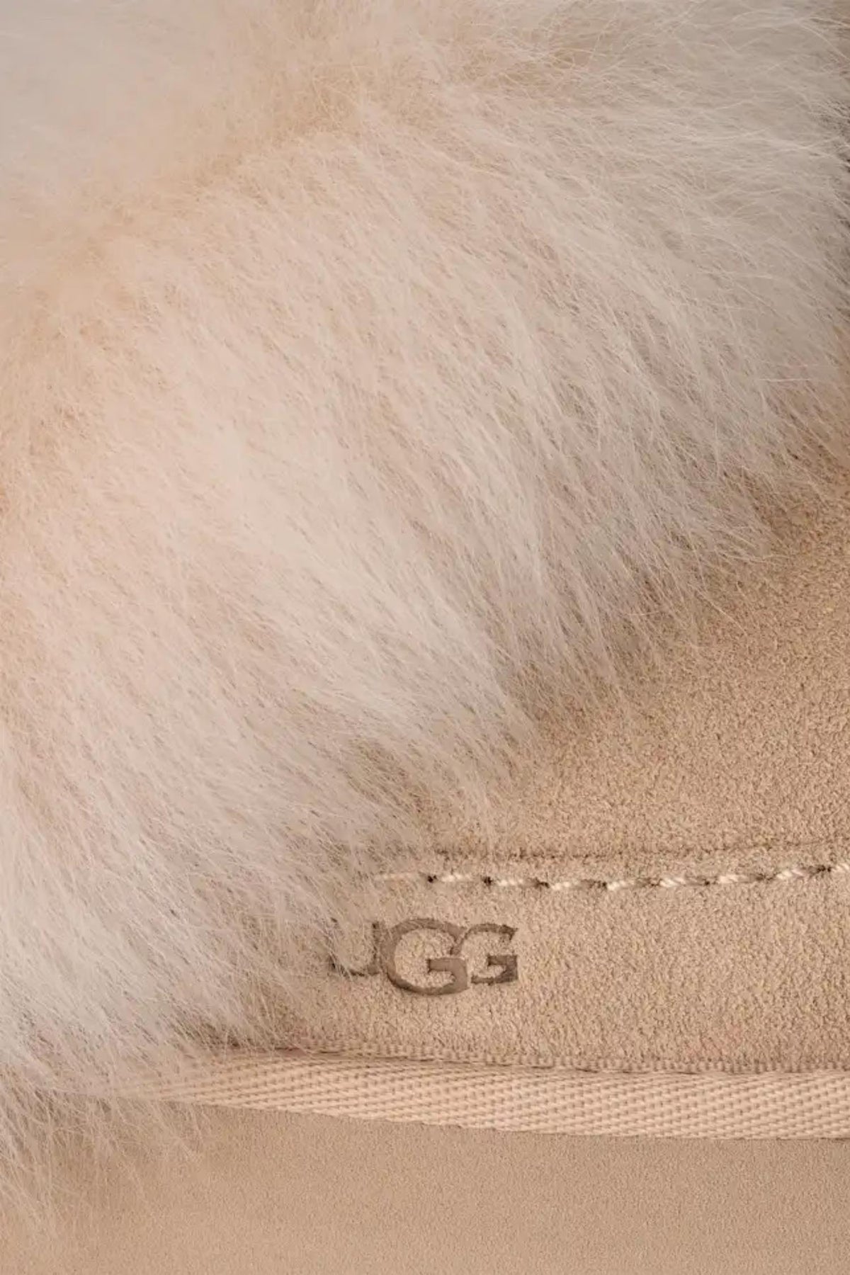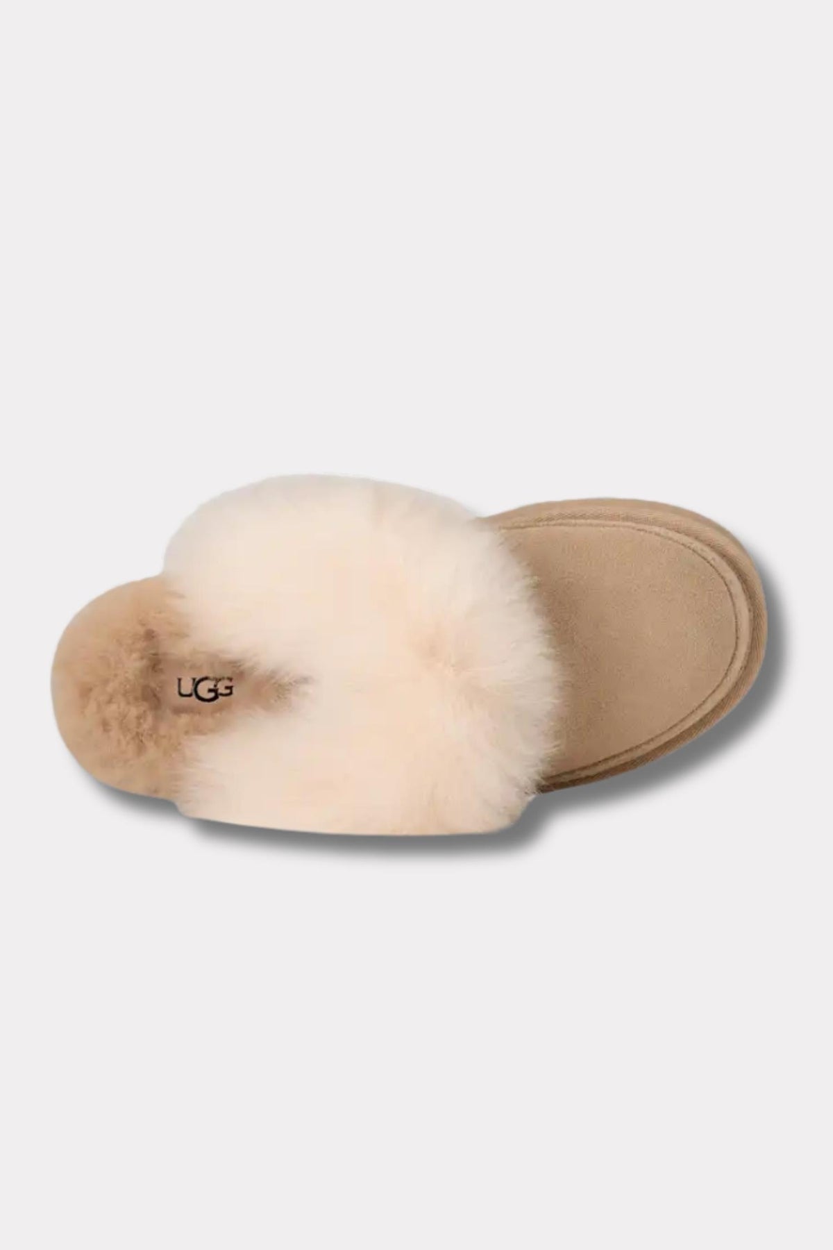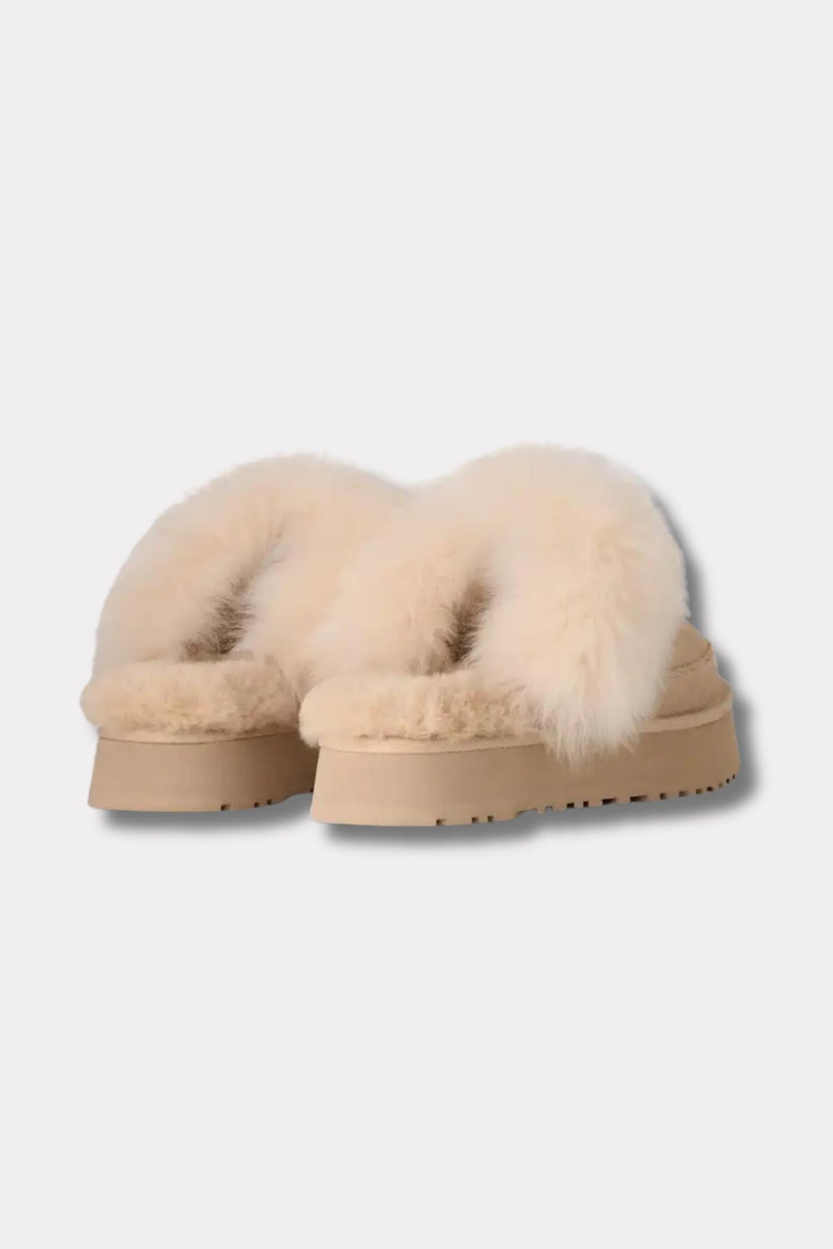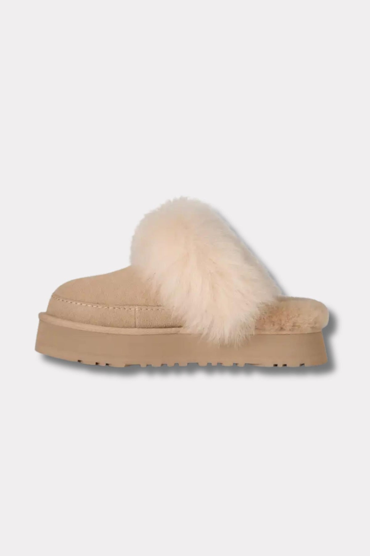Disquette Chalet fra UGG er en luksuriøs tøffel/slipper som kombinerer varme og stil. Modellen har en fluffy krage i ekte saueskinn og er foret med den ikoniske UGGplush™-blandingen (60 % resirkulert ull og 40 % TENCEL™ Lyocell) for myk komfort hele dagen. Den er designet for både inne- og utebruk, med en 1" plattform laget av lett og slitesterk Sugarcane EVA som gir en moderne look og ekstra demping. Perfekt som et varmt og stilfullt innslag i hverdagen.