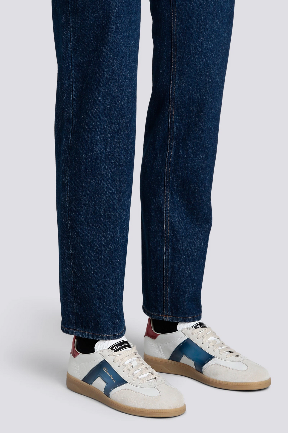 Sneaker fra Santoni med et elegant retro-uttrykk inspirert av klassiske tennissko fra 70-tallet. Modellen er laget i skinn med semskede detaljer og har Santonis karakteristiske sideelement inspirert av den ikoniske double buckle-signaturen. En lett og raffinert sneaker som kombinerer italiensk håndverk med moderne stil.