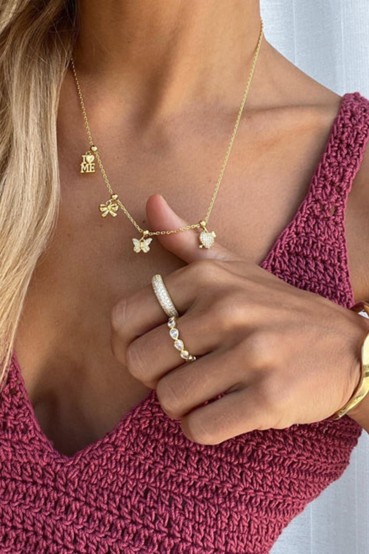 Diamond Band Ring Drop Gold fra Who is She er en glitrende ring dekorert med håndsatte dråpeformede zirconia-steiner som reflekterer lyset vakkert fra alle vinkler. Ringen er laget i 925 sølv belagt med 14k gull og kombinerer et elegant uttrykk med moderne design. Perfekt alene, men også nydelig i kombinasjon med andre ringer i serien for en personlig og sofistikert stil.
