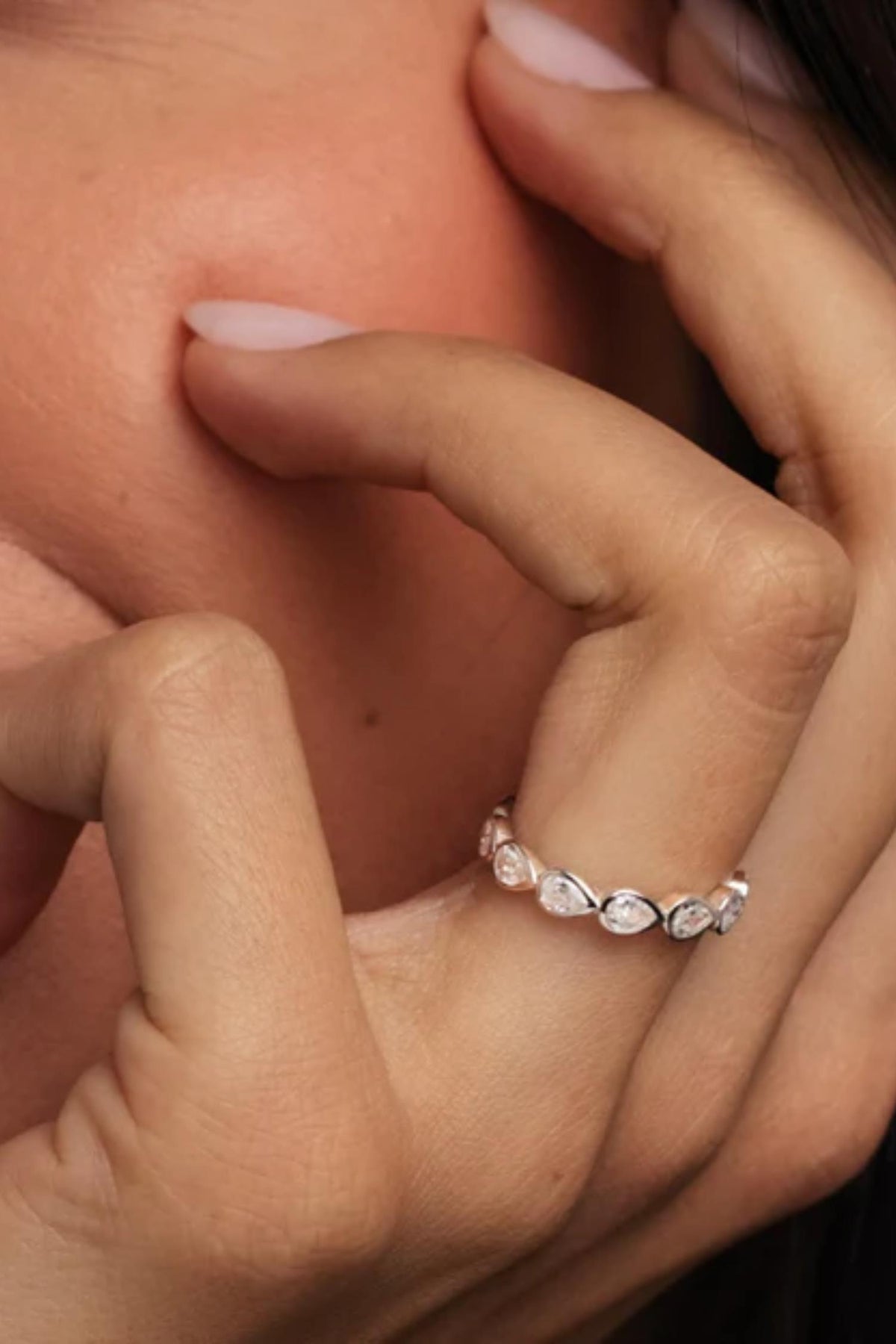 Diamond Band Ring Drop Silver fra Who is She er en glitrende ring med håndsatte dråpeformede zirconia-steiner som gir et elegant og tidløst uttrykk. Ringen er laget i 925 sølv og tilfører et luksuriøst preg til både hverdags- og festantrekk. Bruk den alene for et rent, klassisk uttrykk, eller kombiner den med andre ringer i serien for en mer personlig stil.