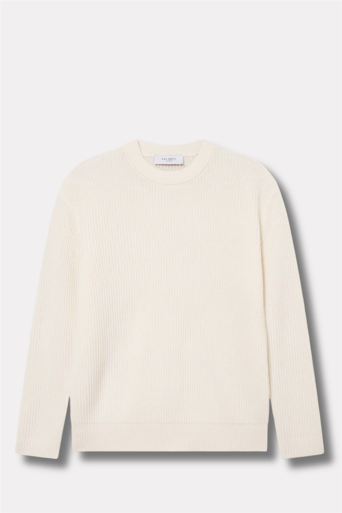 Eddie Knit fra Les Deux er en tykk, ribbestrikket genser laget av 100 % merinoull. Den har en høy, chunky krage og rett fald for et klassisk og funksjonelt uttrykk.