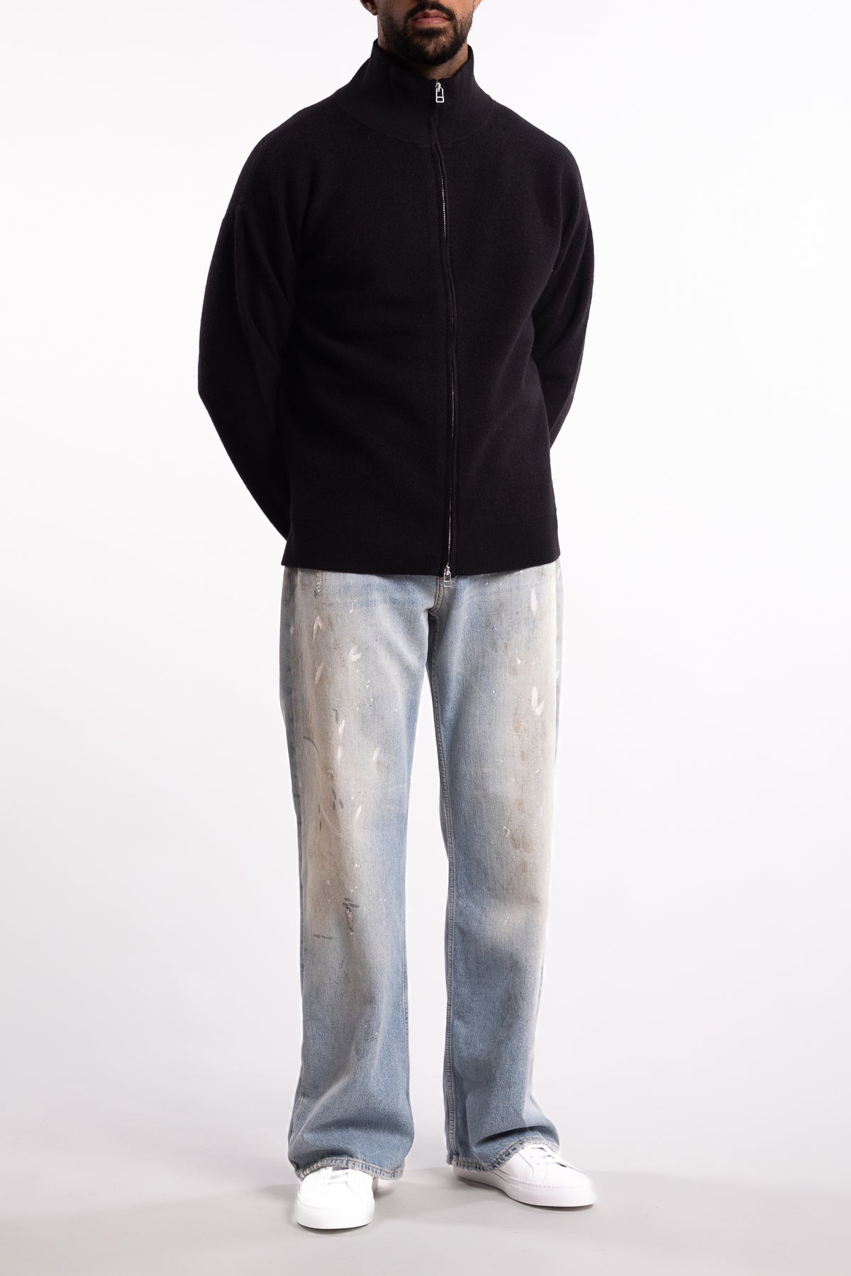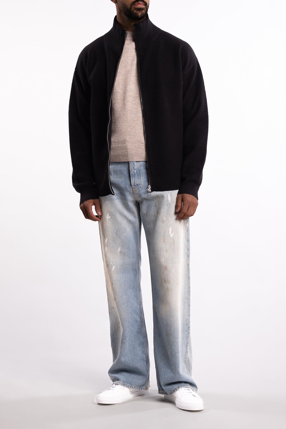 Designet har droppede skuldre, en rett og boxy passform med splitt i sidene og ribbestrikket kant nederst. Genseren er fullført med en høy ribbestrikket krage og toveis glidelås i metall.