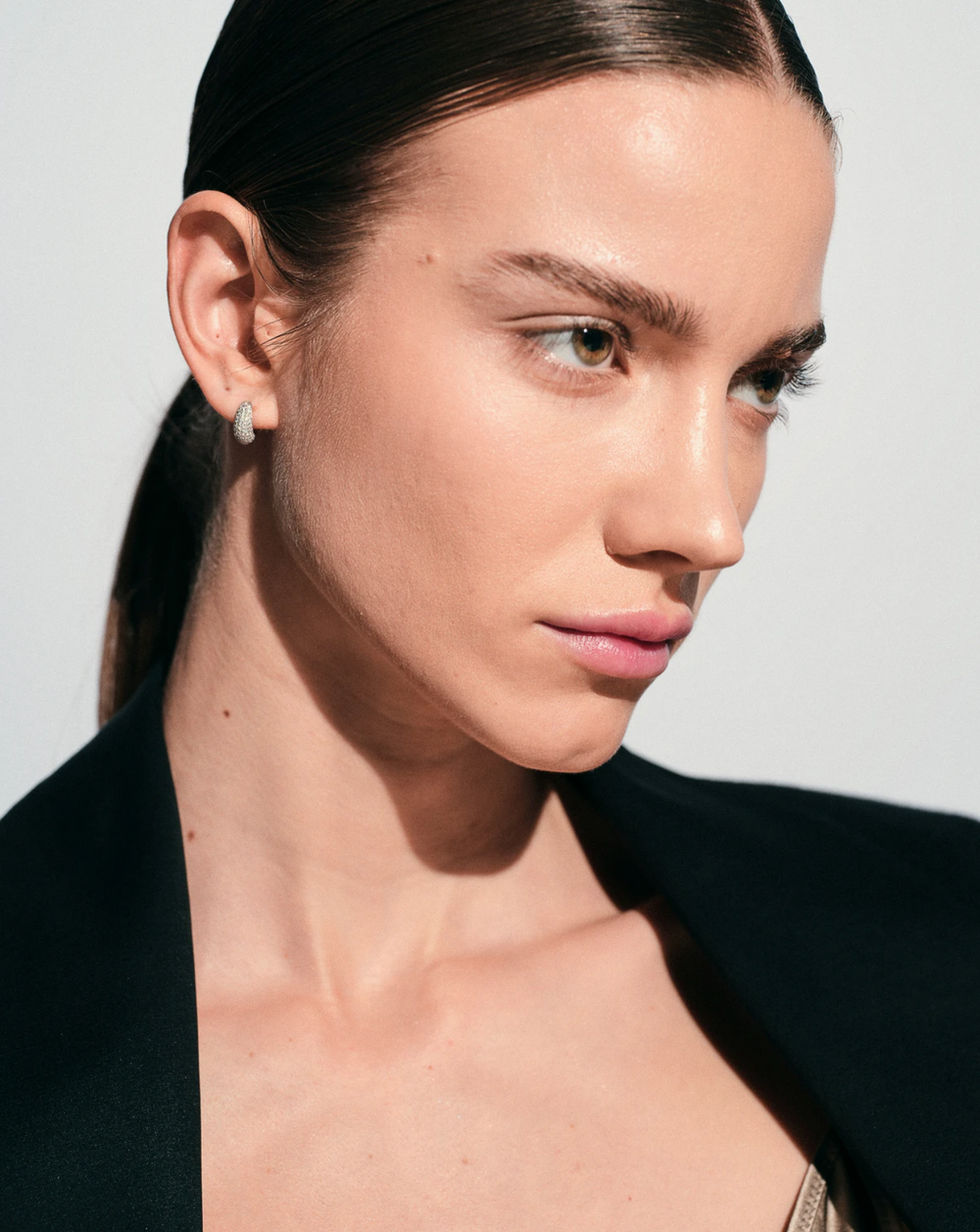 Ice Huggies Pave er inspirert av hvordan isbiter smelter til en mer buet og glansfull form. Huggiene er designet med 124 pave-sette hvite Cubic Zirconia-stener. Bær dem alene eller sammen med andre Tom Wood øredobber for et dristig utseende.
