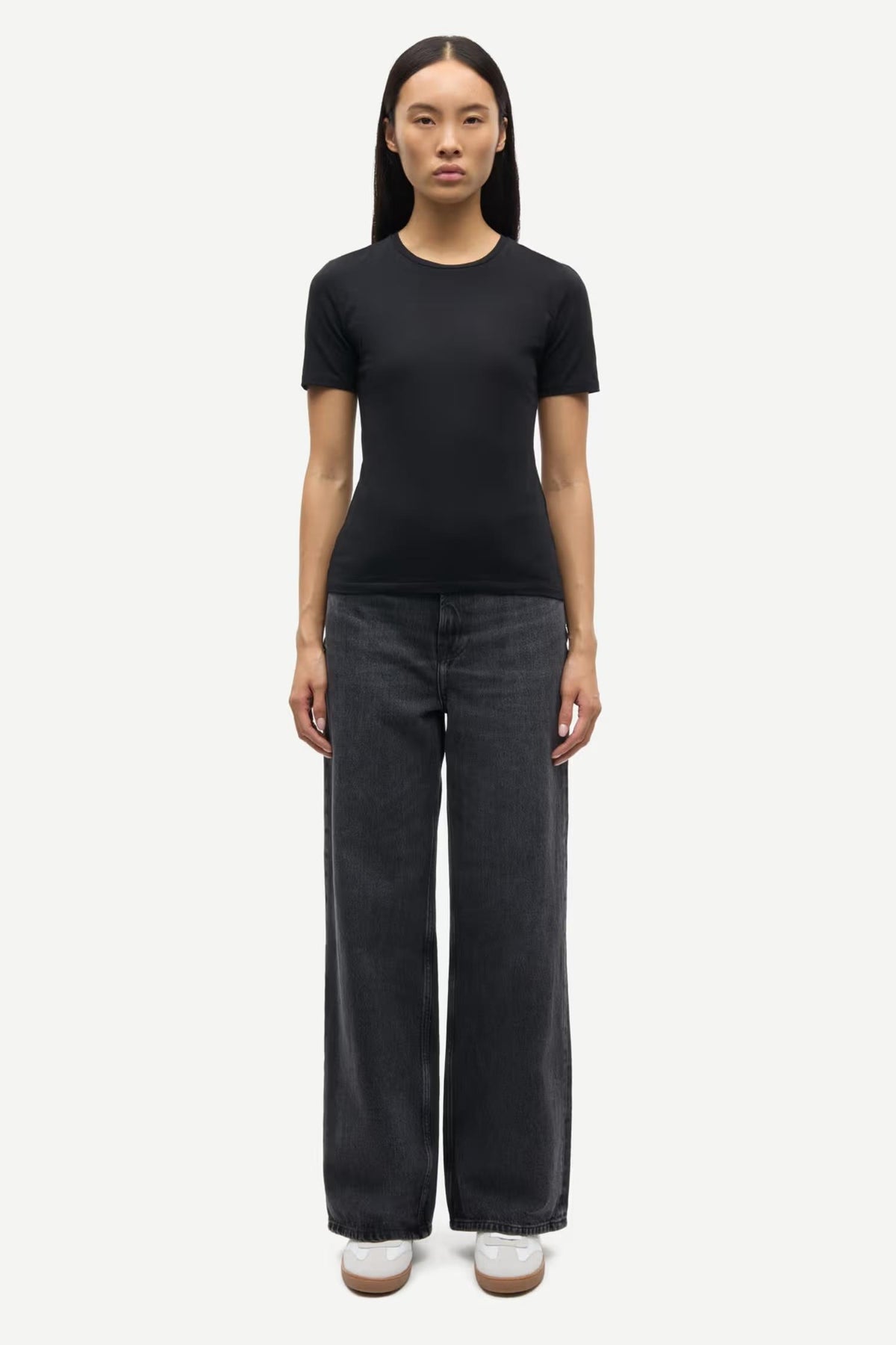 Saesme T-Shirt 16122 fra Samsøe Samsøe er en klassisk kortermet jersey-T-skjorte med smal passform og et rent, minimalistisk uttrykk. Modellen har rund hals og er laget i en elastisk blanding av økologisk bomull som gir god komfort og bevegelighet. Et tidløst baseplagg som fungerer like godt alene som under skjorte, strikk eller blazer.